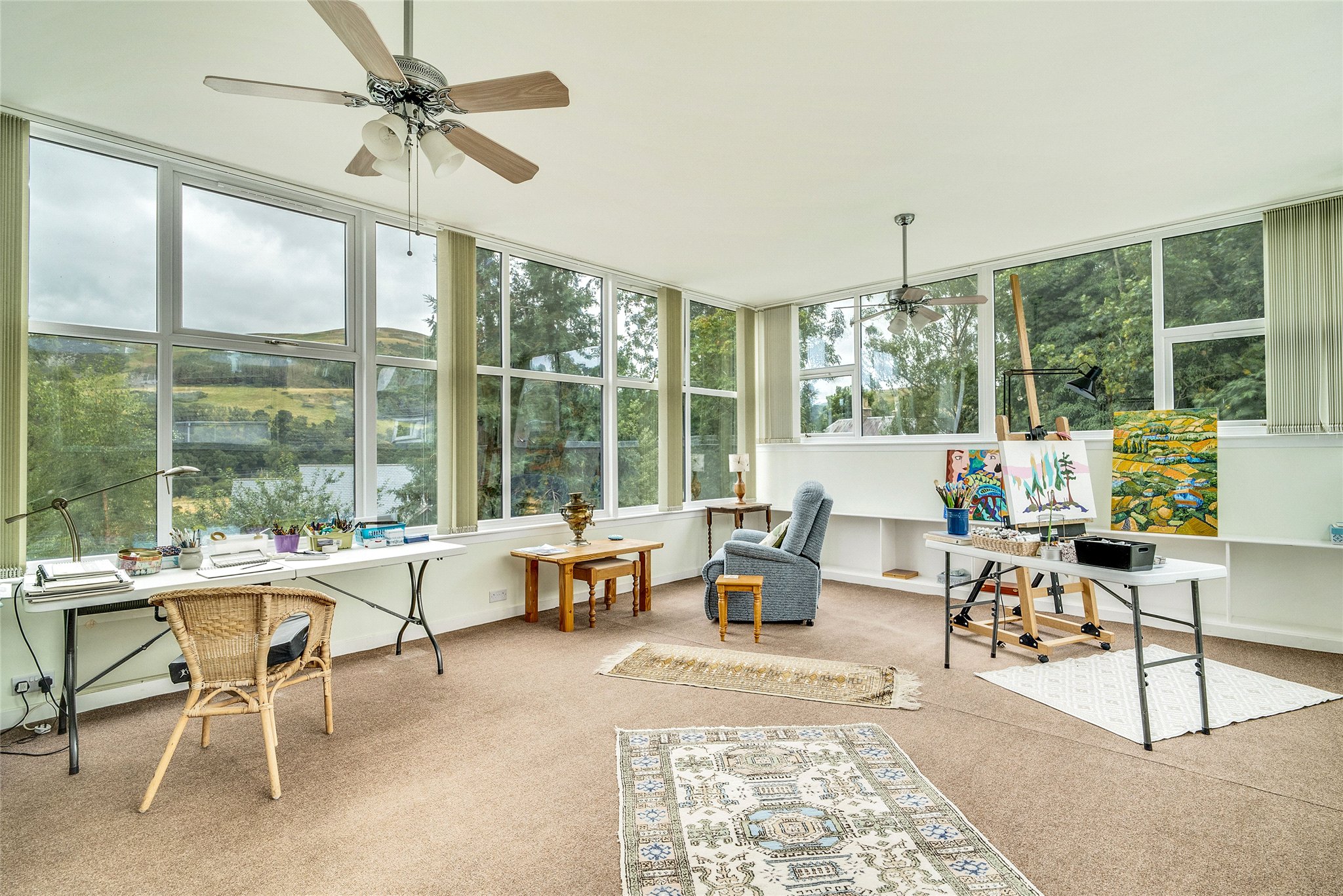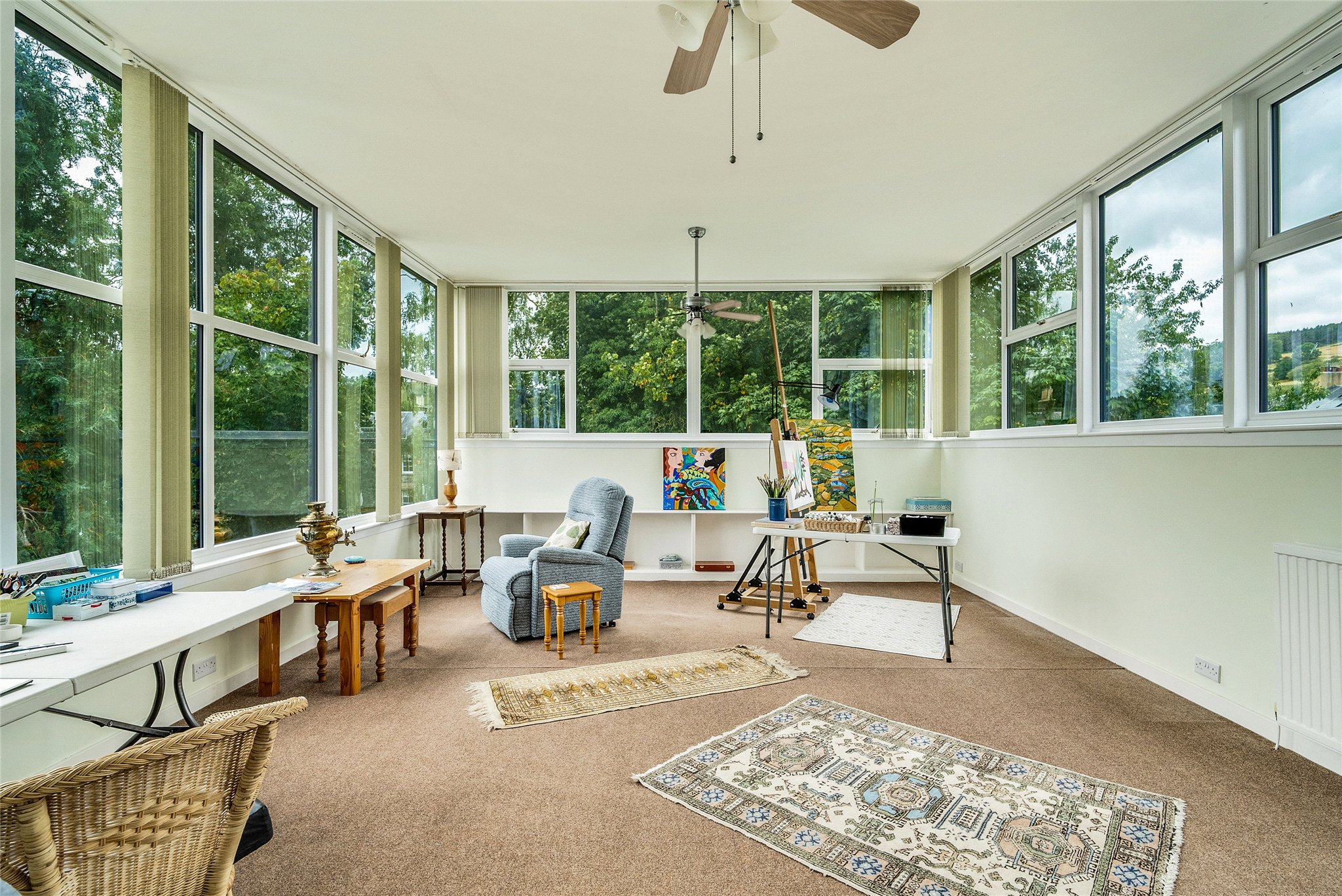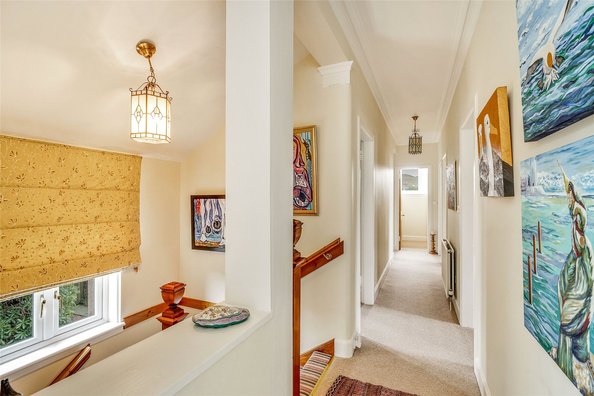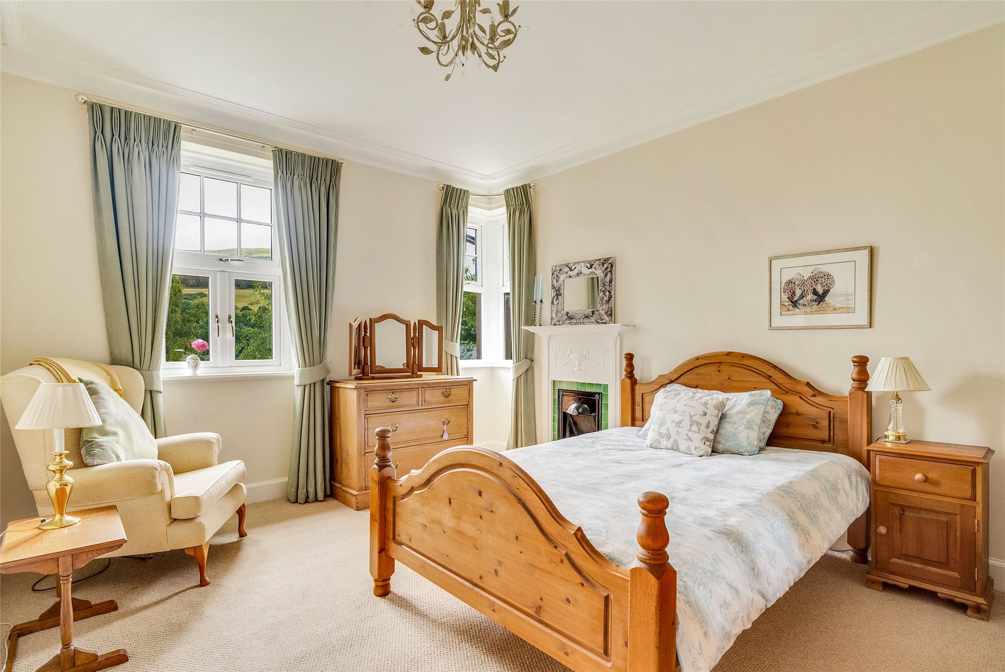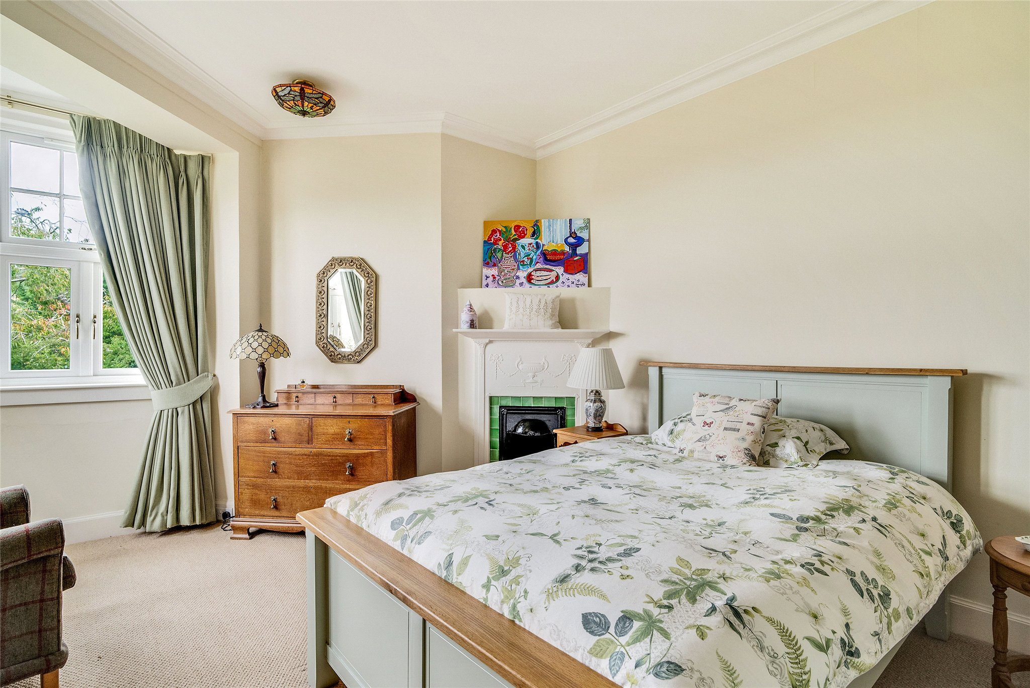 Upstairs, a striking studio extension was created in the 1970s, with panoramic windows designed to capture the views. Originally an artist’s studio, it now makes a bright retreat, equally suitable as a bedroom, snug, or home office. From the landing, a choice of well-proportioned, restful bedrooms are accessed, each with individual character, feature fireplaces, and spectacular countryside outlooks. Bedroom two benefits from a Jack-and-Jill ensuite, while the family bathroom lies across the landing.