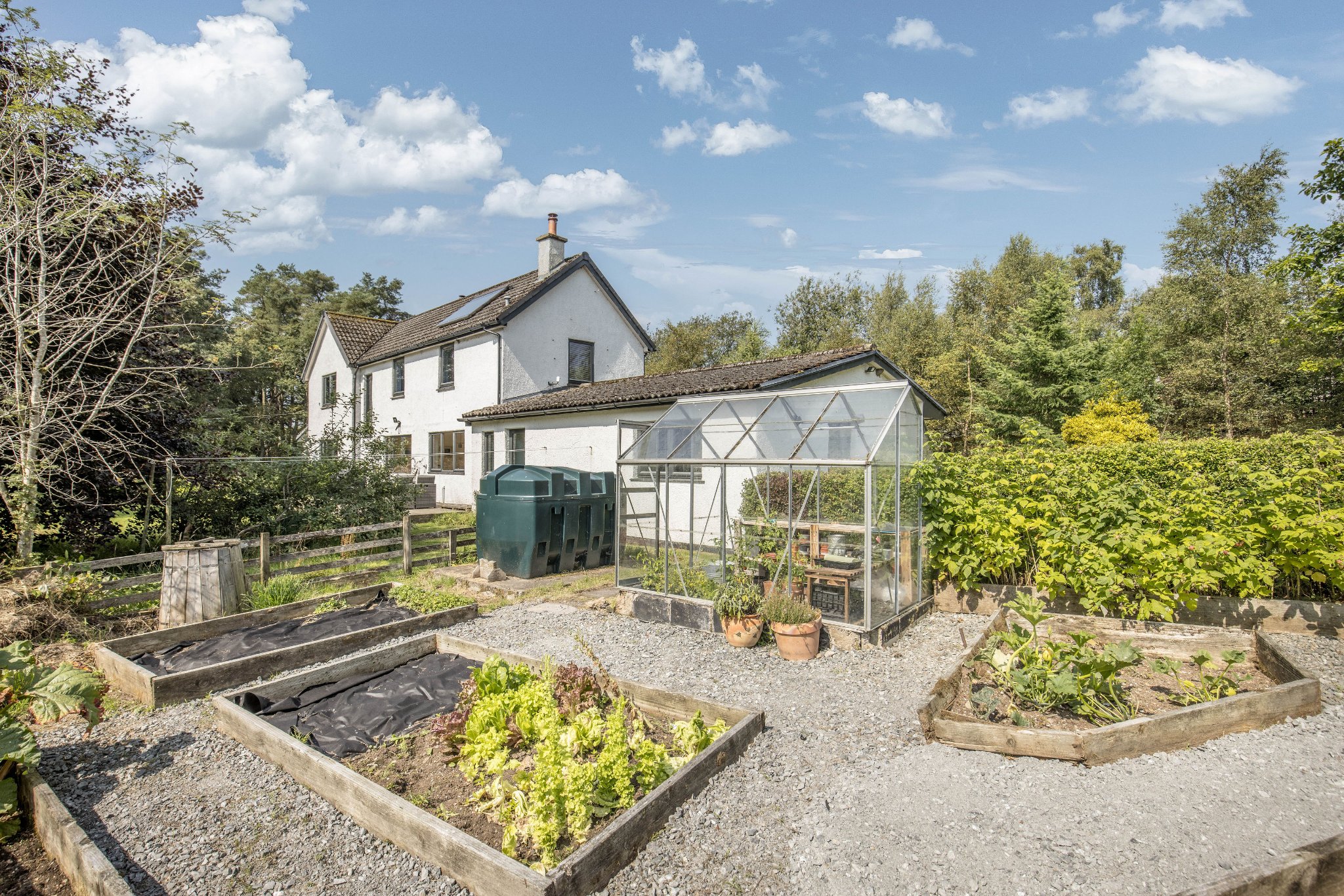 - Self sufficient vegetable garden with raised beds and a greenhouse.