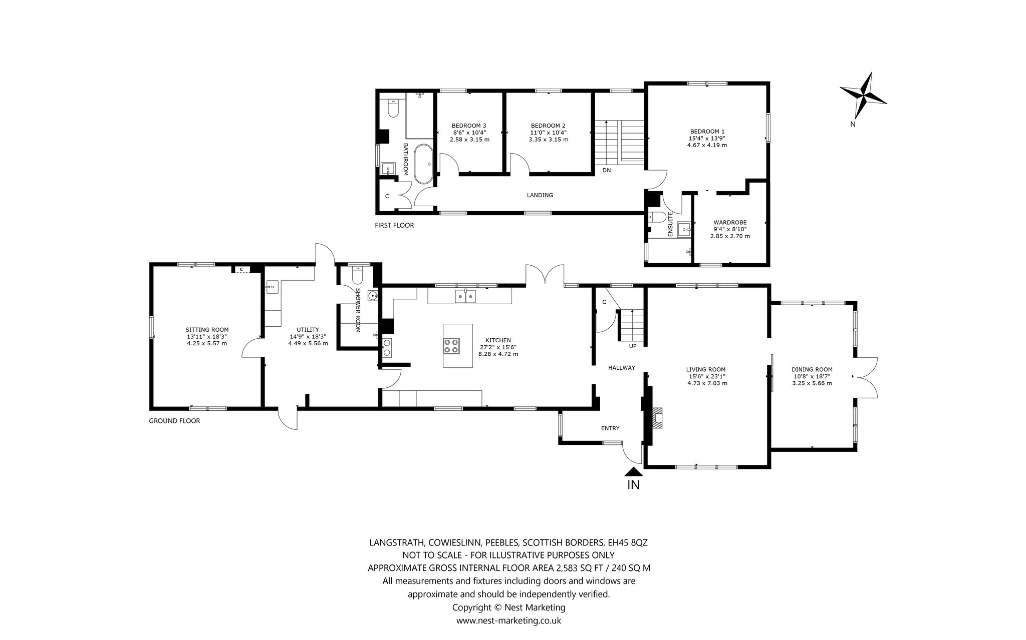 First Floor – Principal Bedroom with Dressing Room & Ensuite, Two Double Bedrooms, Bathroom.