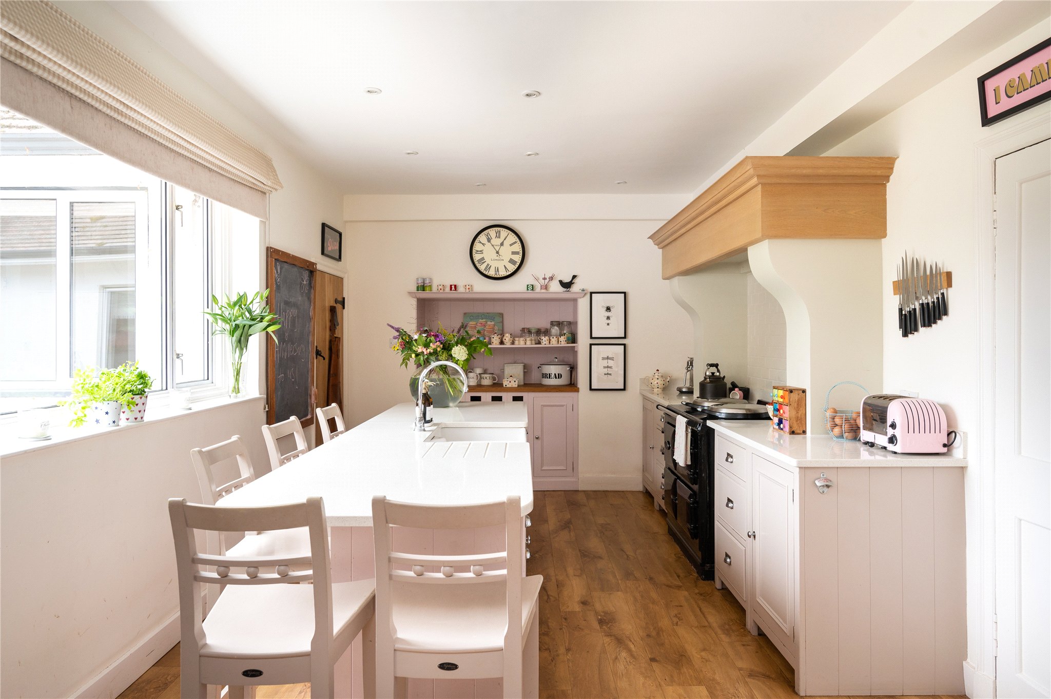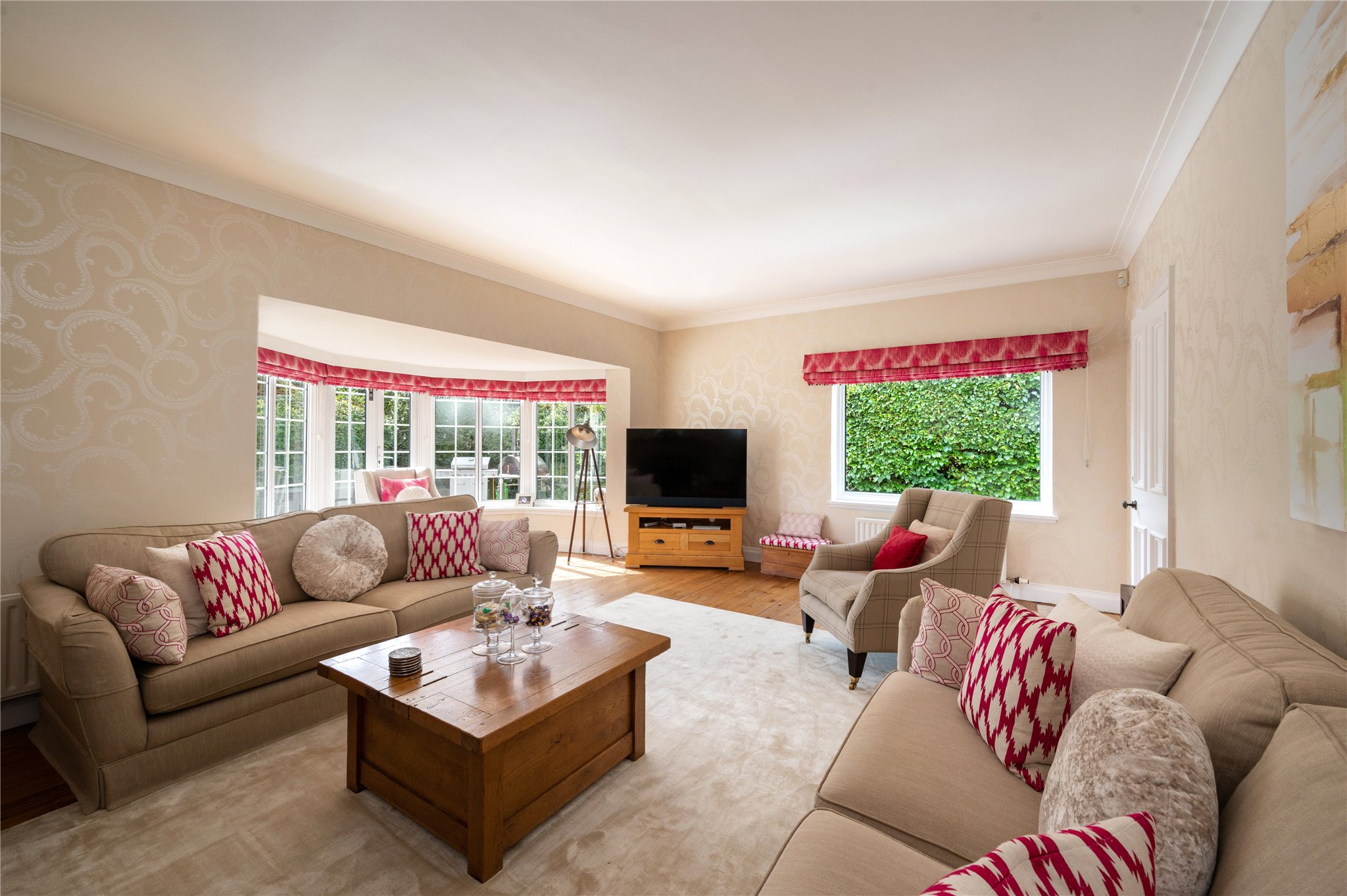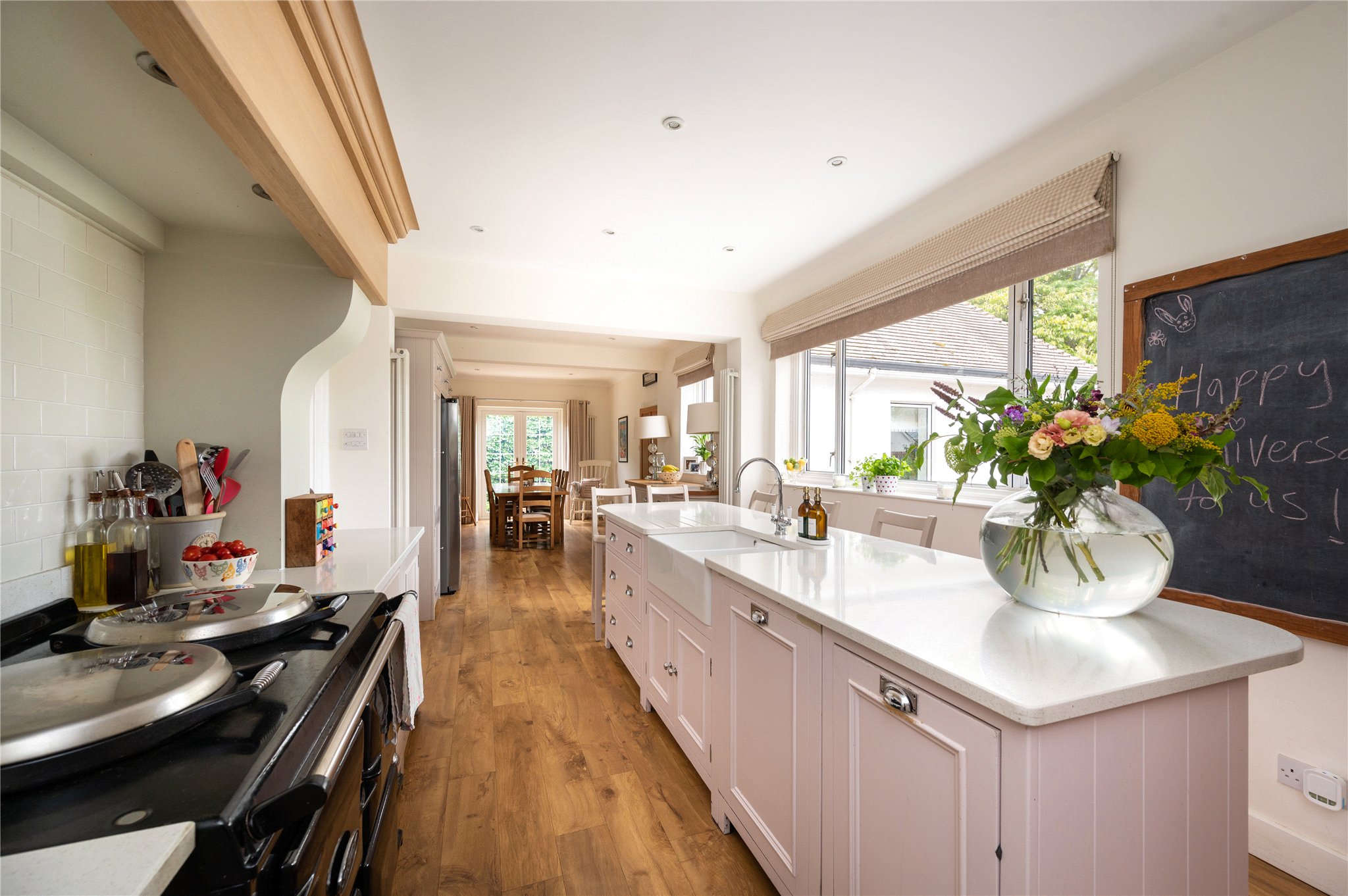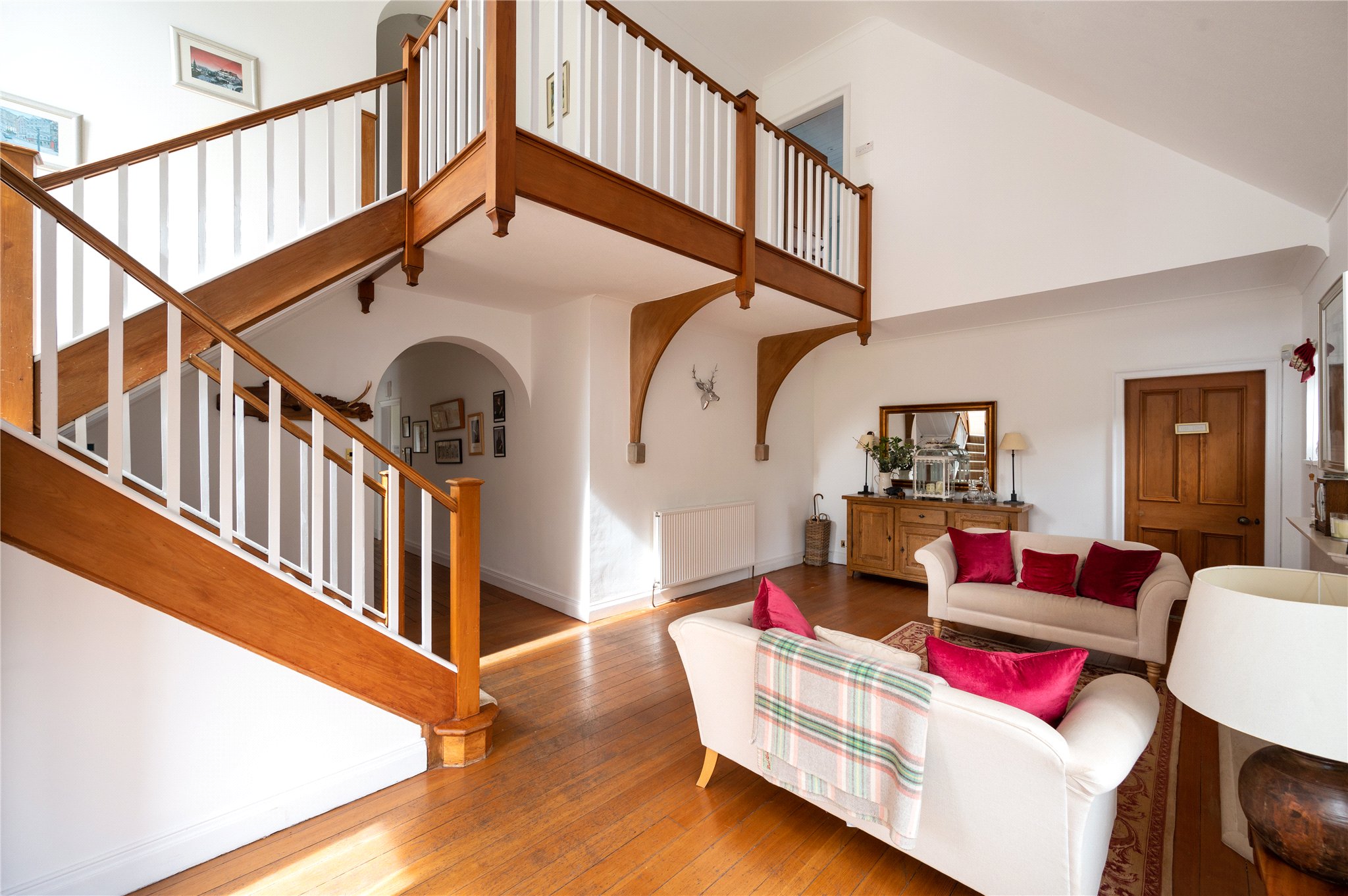 The ground floor opens into a stunning double-height reception hall, currently set up as an informal sitting room this space is ideal for entertaining guests or could easily double as a dining space. The main corridor leads to the heart of the home with a generous dining kitchen complete with shaker style wooden units and AGA stove. To the front of the property is the formal sitting room and snug - both rooms boast deep bay-windows and french doors leading onto the front patio. The rear of the ground floor offers a large utility room, downstairs bathroom and a fifth bedroom suite, ideal for guest accommodation or those requiring one-level living.