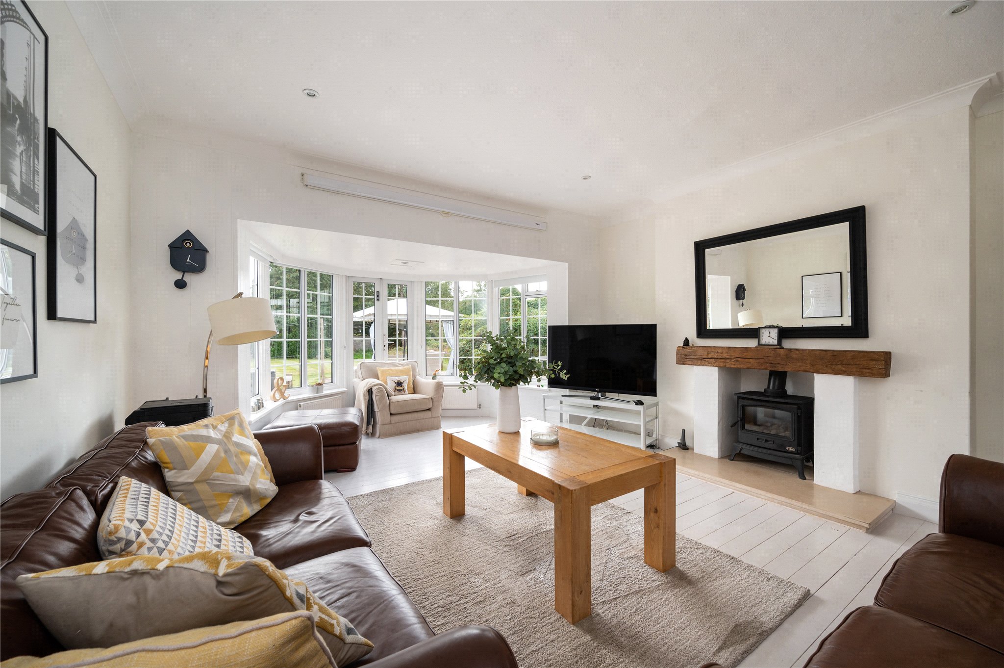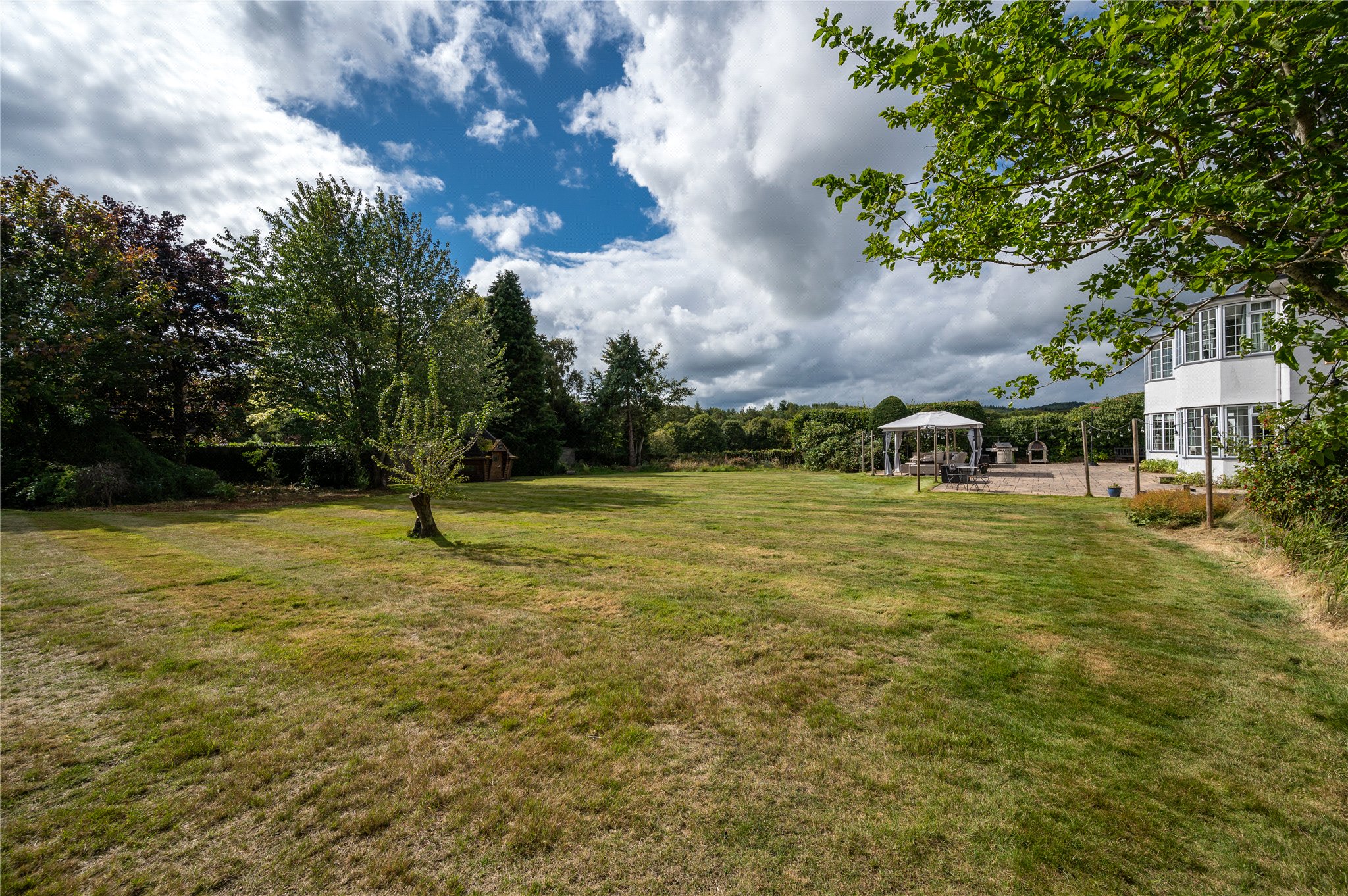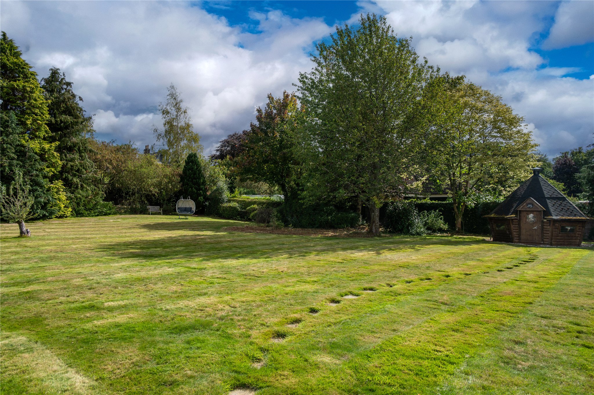 Externally the property boasts a large double garage, several outbuildings and a charming chalet hut with firepit.