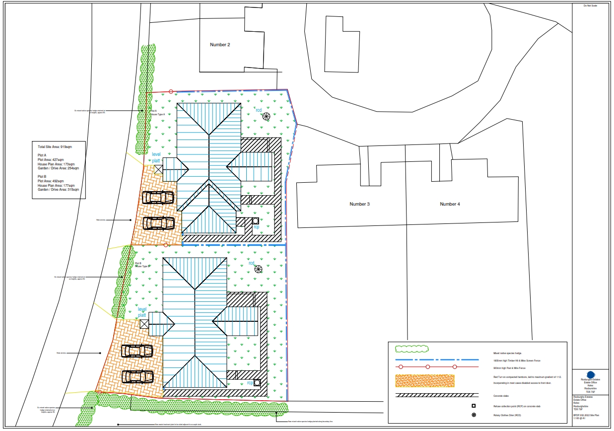Full planning permission has been granted under reference 22/01859/FUL, approving the construction of two three bedroom dwelling houses.
