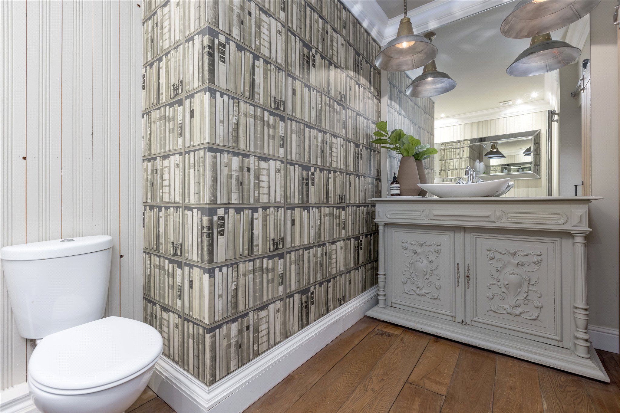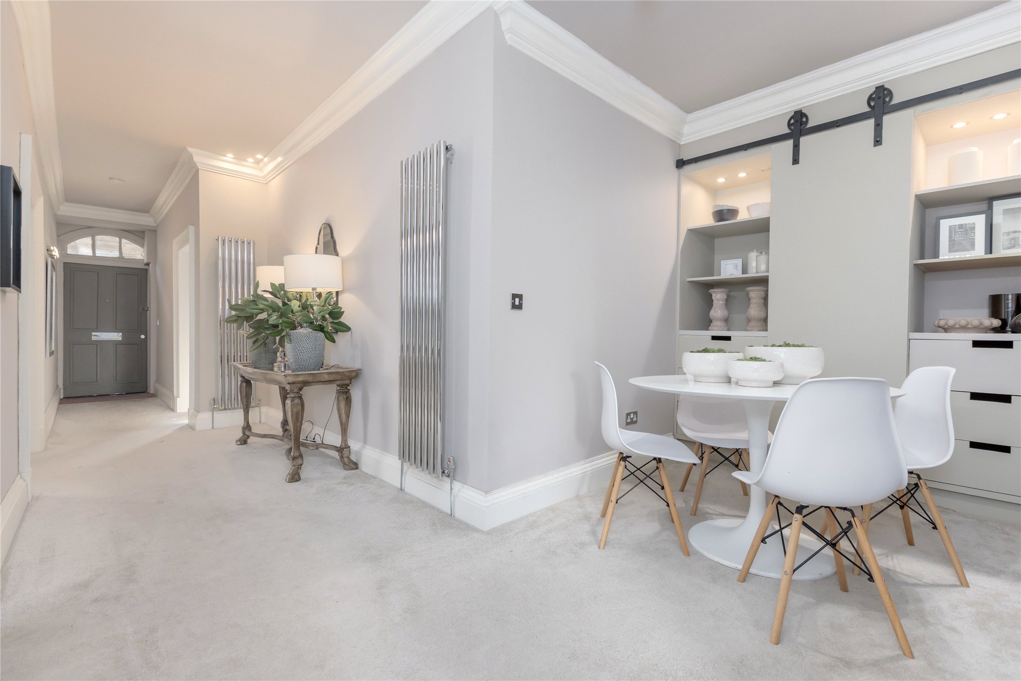 At the centre of the apartment is a charming dining hall, fitted with bespoke bookcases and shelving units, providing a flexible and characterful space which could also serve as a reading or study area.