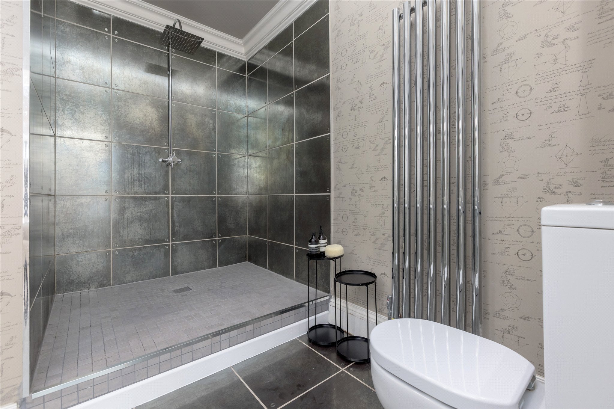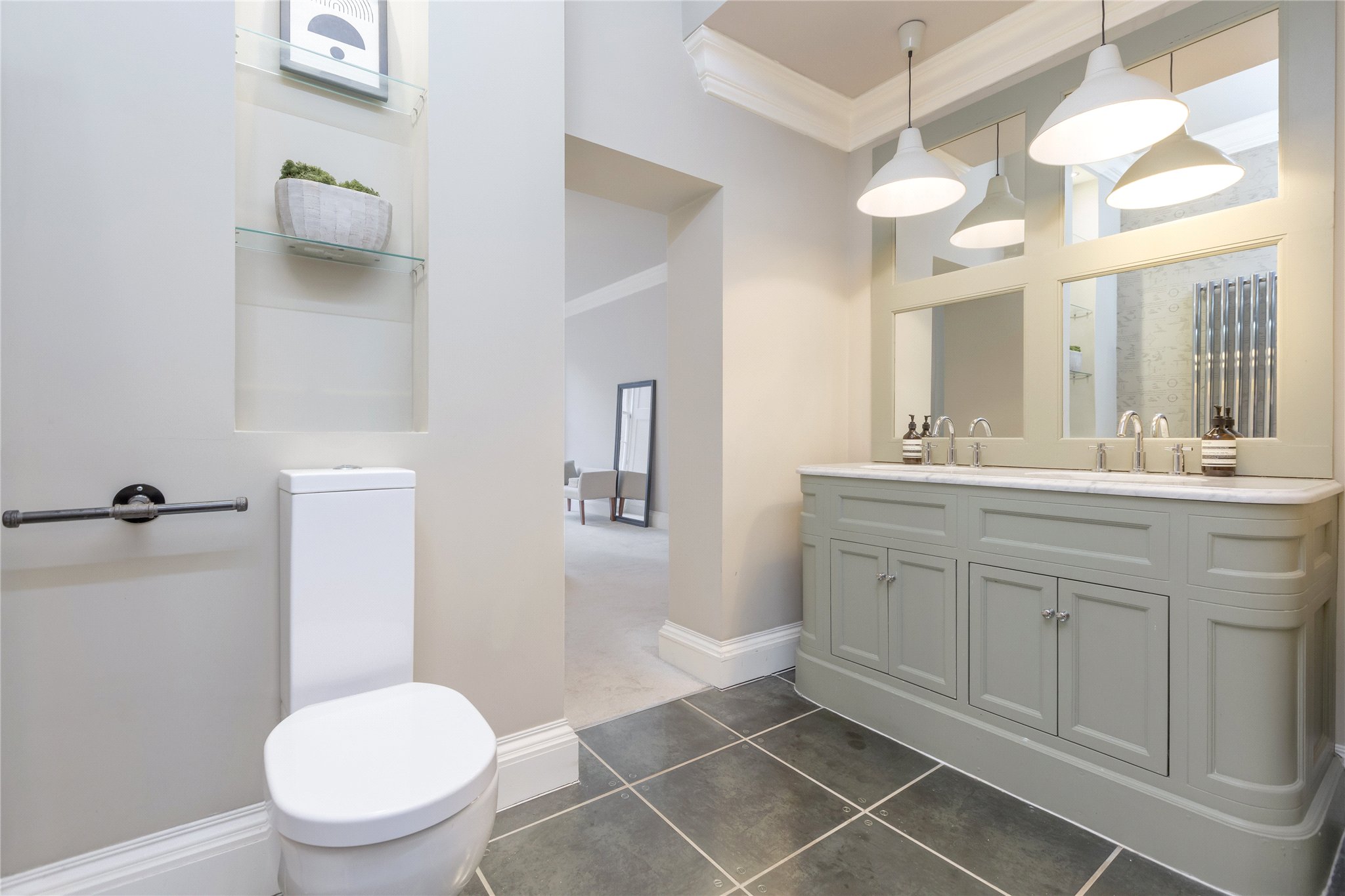 The principal bedroom is an outstanding space, notable for its scale and comfort, and is complemented by a luxurious en-suite shower room featuring an oversized shower tray, twin “his and hers” sinks and a WC. A further double bedroom lies to the front of the property and is similarly generous in size, easily accommodating a large double bed together with additional freestanding furniture.