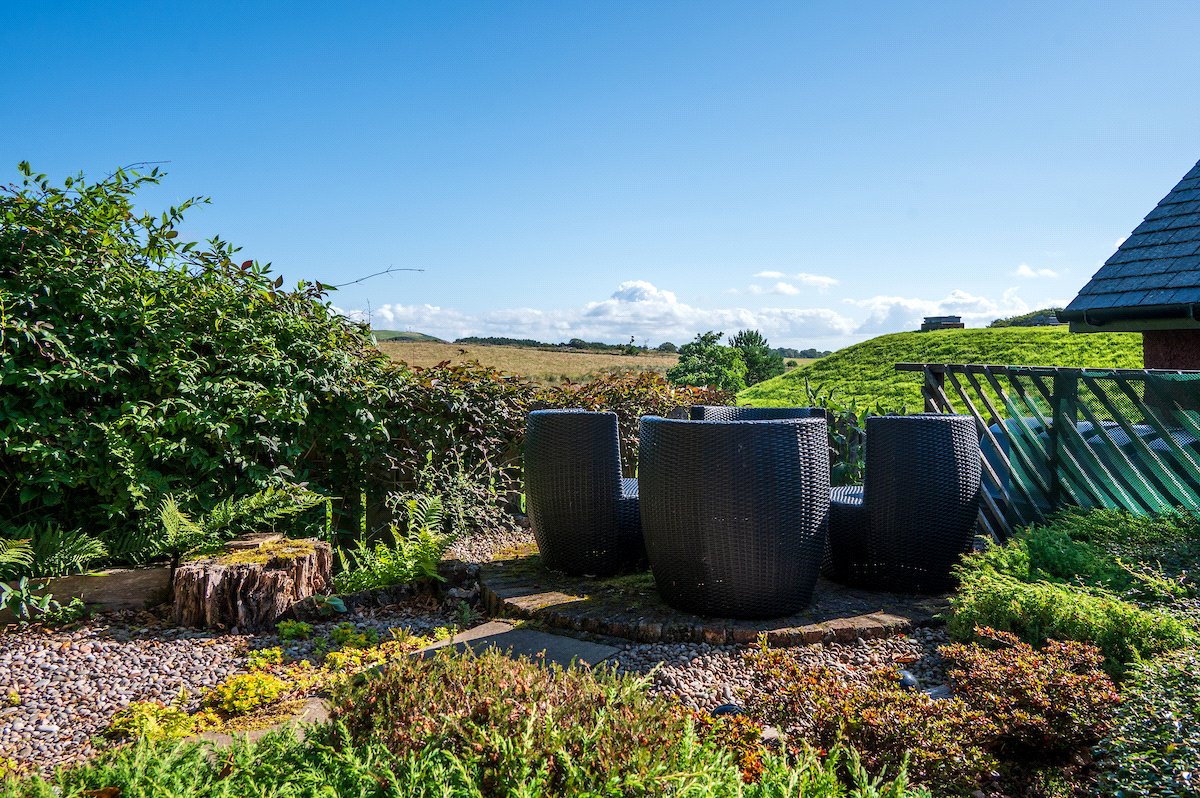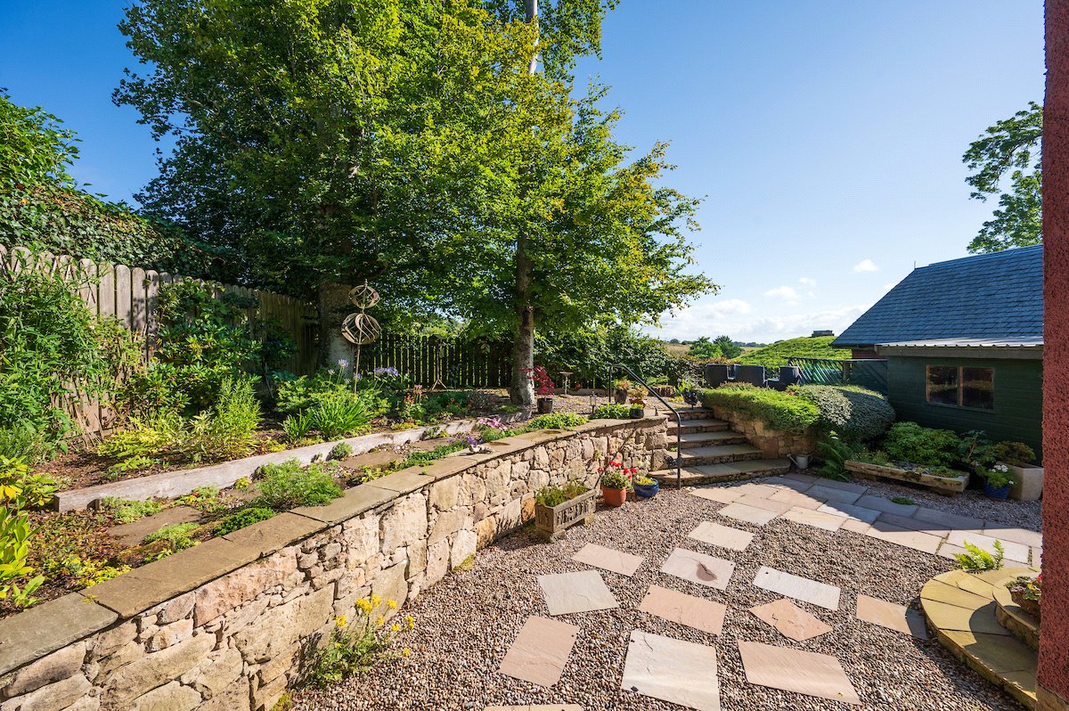 Garden: Gardens wrap around the house, with a lawn to the front of the property and patio and terraced garden to the rear.