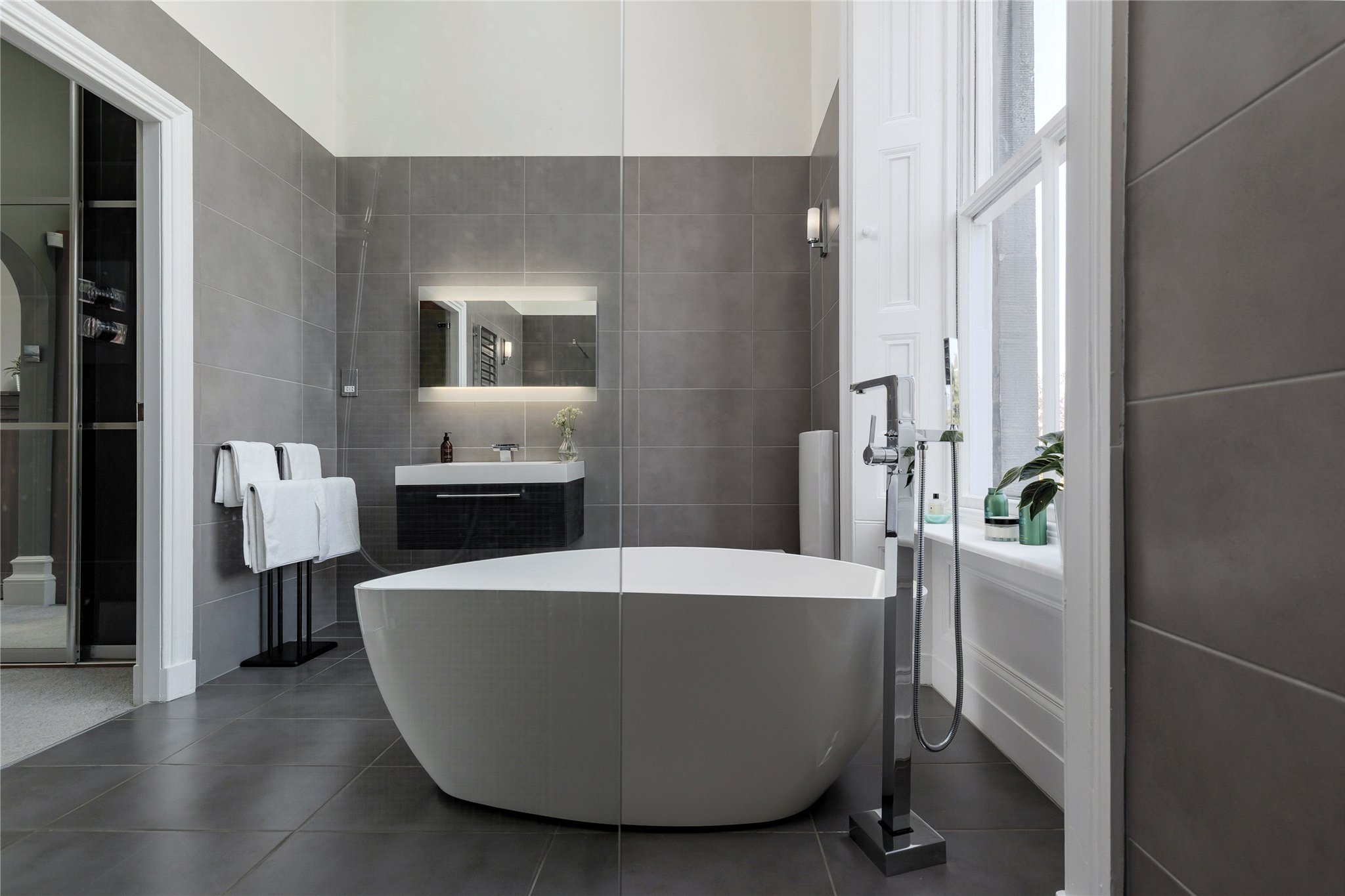 A striking staircase rises to a bright upper landing. The principal bedroom is positioned to the front and benefits from a bay window, a dedicated dressing room with extensive storage, and a luxurious en suite bathroom with separate shower.