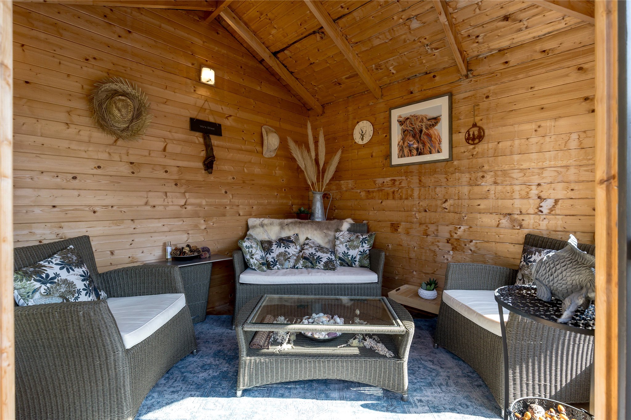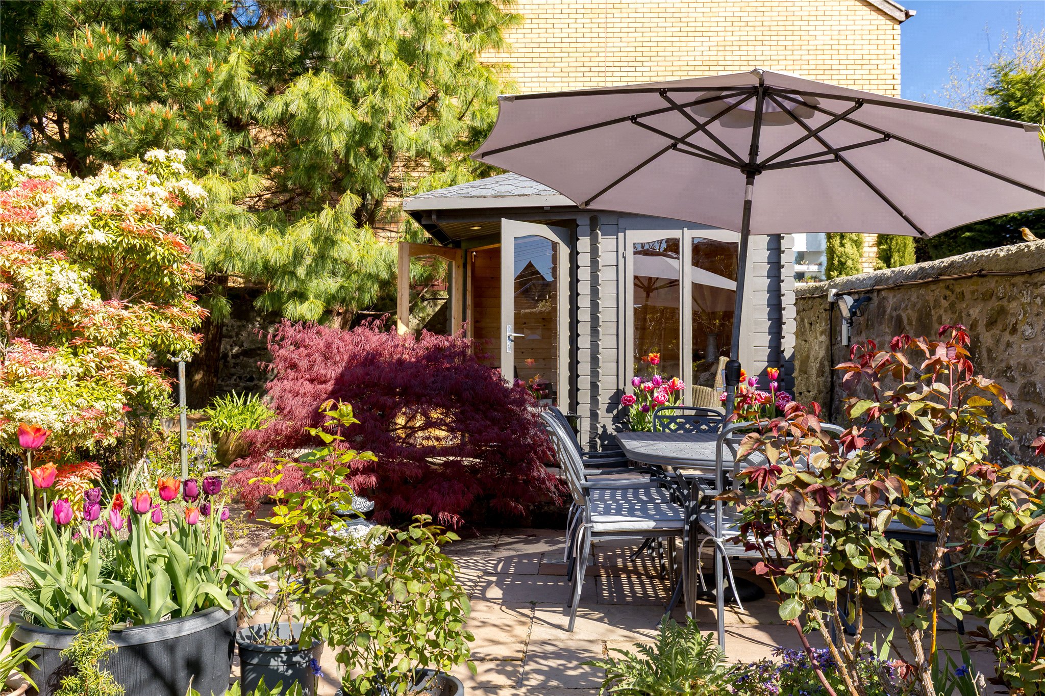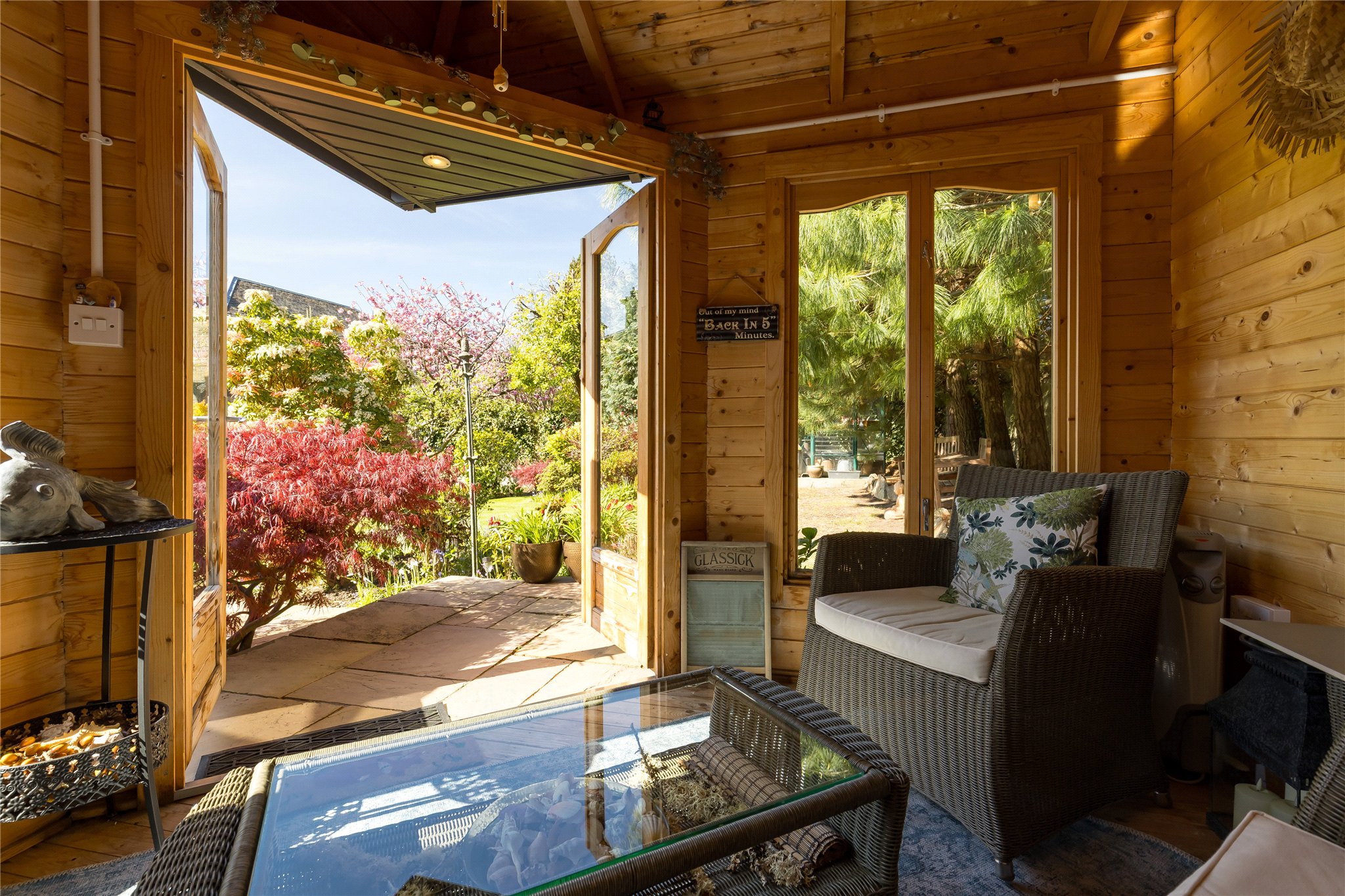 The rear garden is a true highlight - beautifully landscaped and enjoying a sunny west-facing orientation. Mature planting, well-established borders and a generous lawn create a private and tranquil setting, while a number of seating areas allow for sun throughout the morning, afternoon and evening. An attractive sunroom offers a peaceful retreat, complemented by a tool shed and a useful side store.