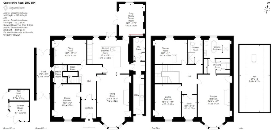 Further accommodation on this level includes a formal dining room with fireplace overlooking the garden, a well-appointed utility room, and a contemporary wet room. A generous guest bedroom with en suite shower room completes the ground floor, offering excellent flexibility for visitors, home working or multi-generational living.