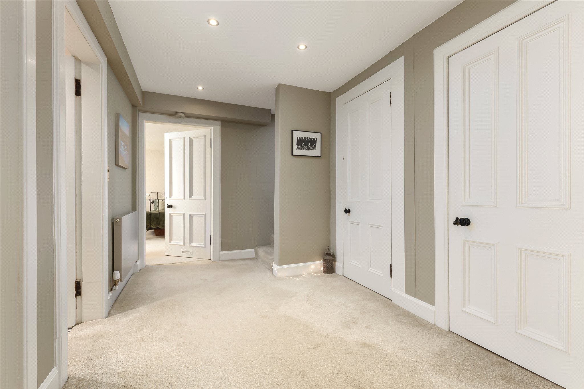 Entrance vestibule with coat and boot storage, large hallway, sitting room with log burning stove, Principal bedroom with built-in storage and ensuite bathroom, double bedroom two