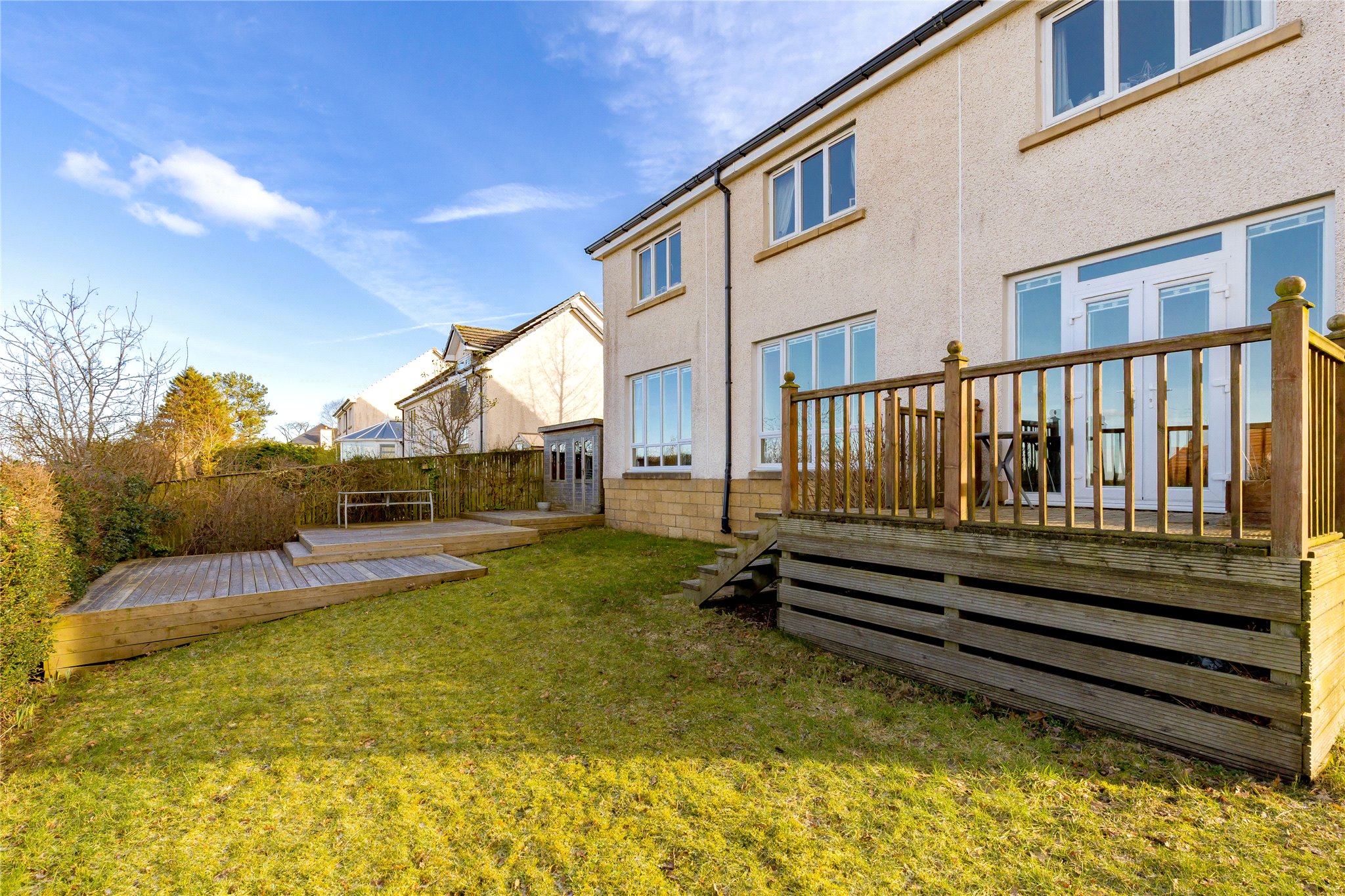 Driveway leading to Garage. Enclosed Rear Garden Laid to Lawn with a Split-levelDeck. Summerhouse.
