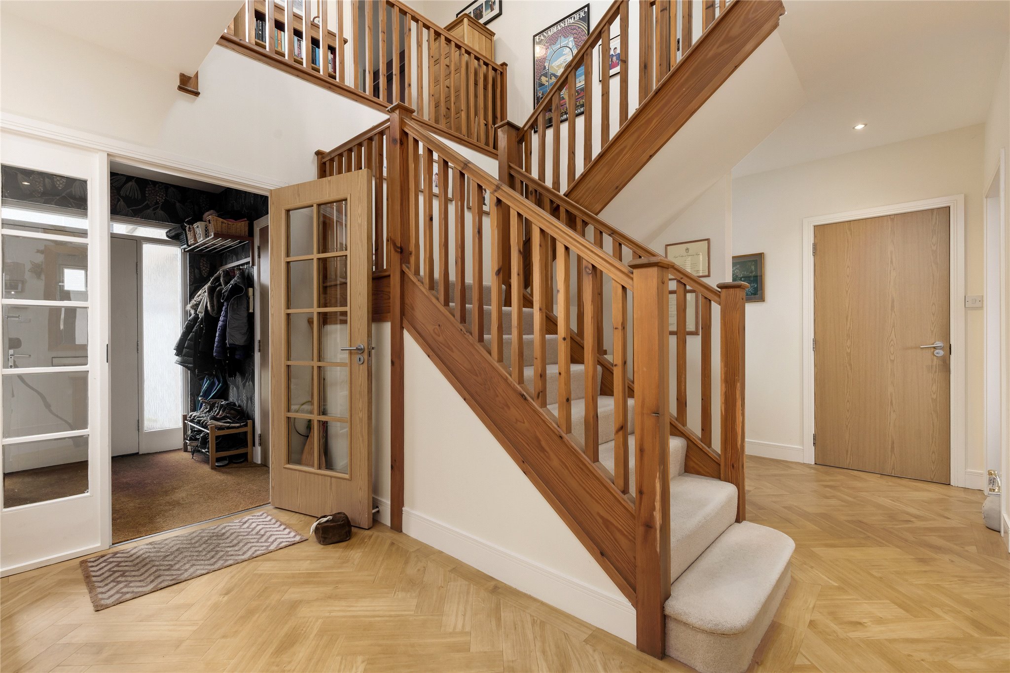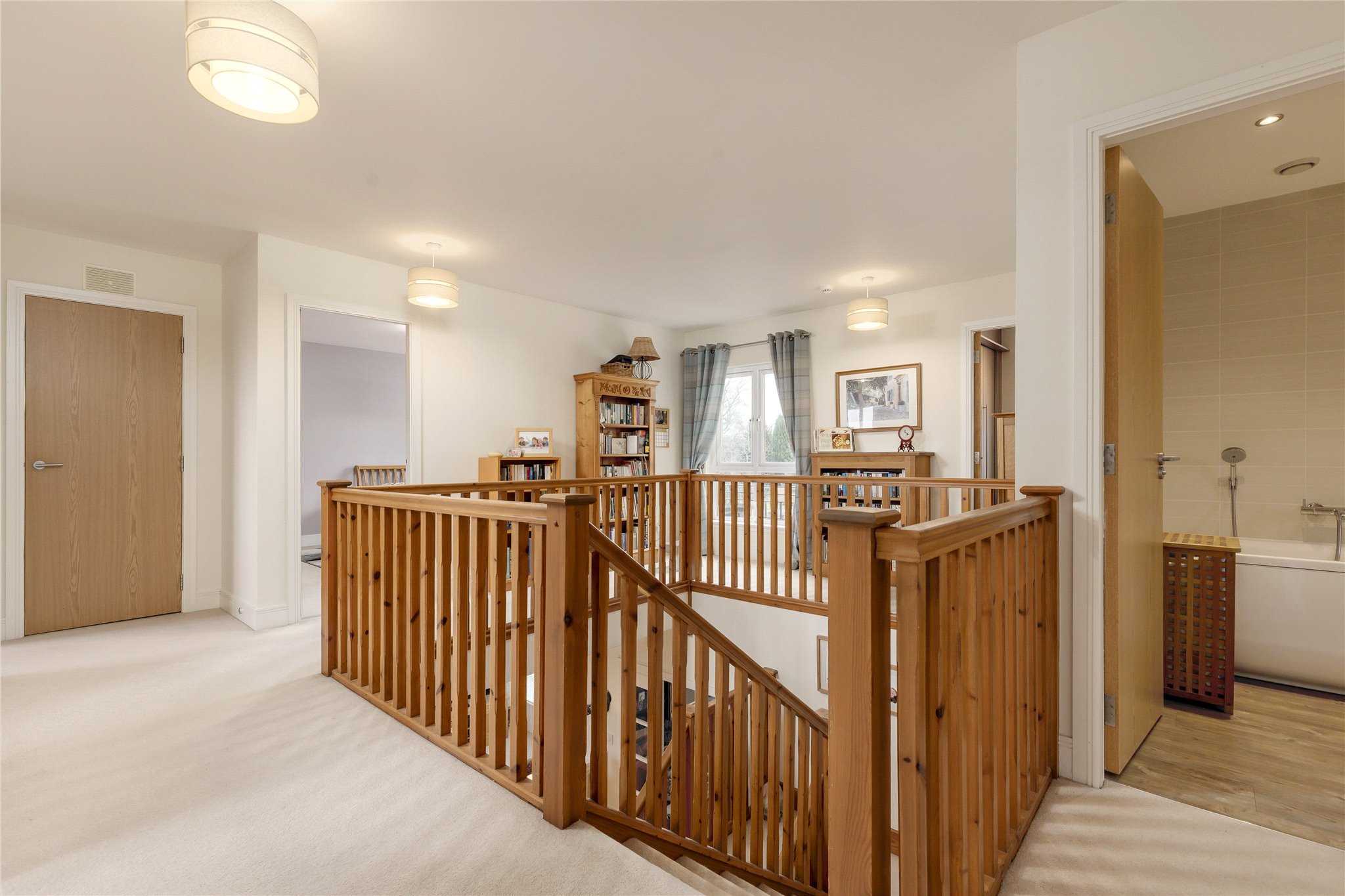 A staircase leads to a spacious galleried landing leading to the principal bedroom which has extensive fitted wardrobes and a luxury en-suite bathroom. There are four further double bedrooms with fitted wardrobes, one with an en-suite shower room and a family bathroom. The property is fitted with a combination of quality carpets and Amtico flooring throughout.