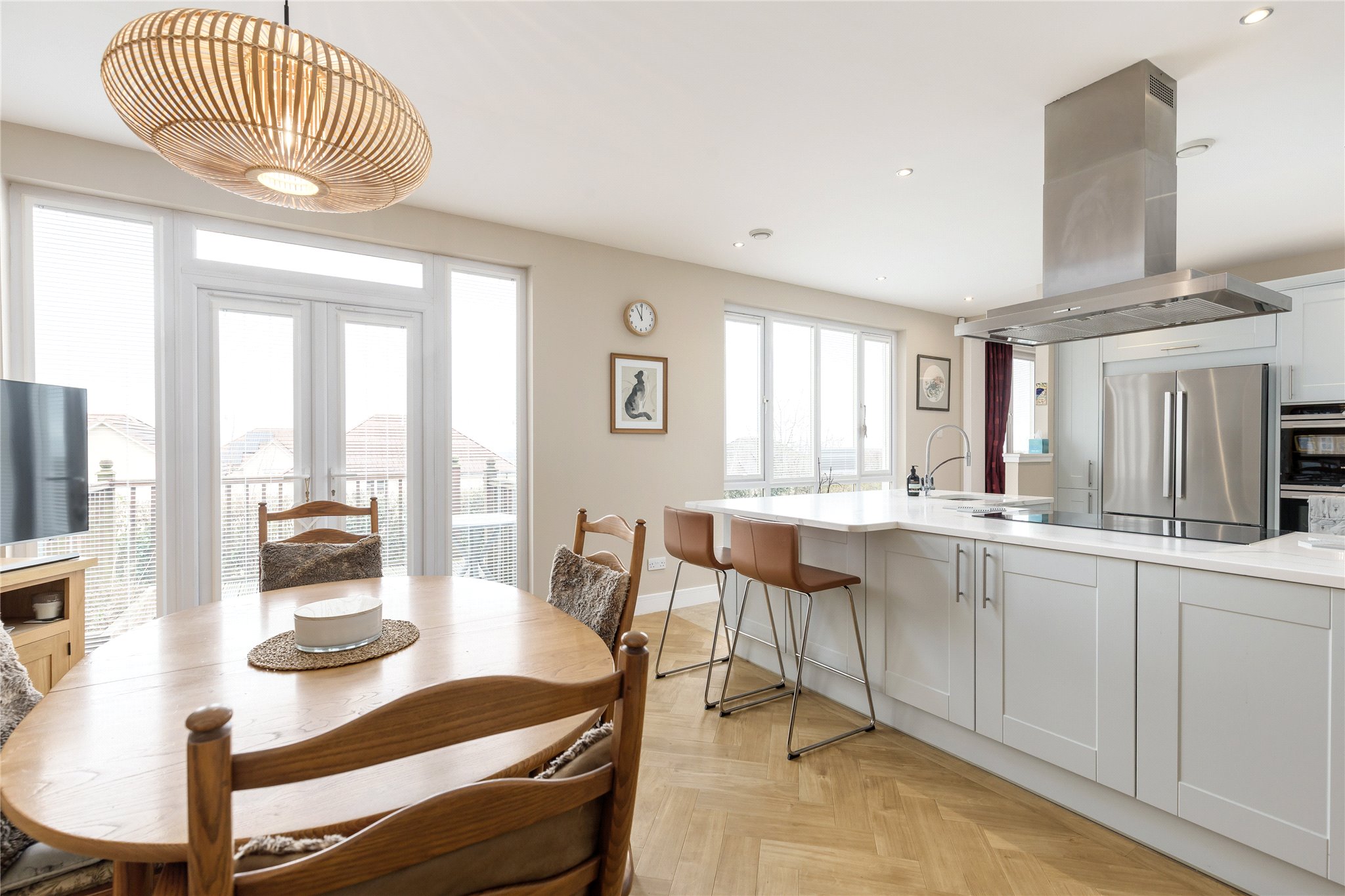 Highlights include a beautiful quality fitted dining kitchen with Quartz worktops and Siemens integrated appliances including oven, combi microwave oven, induction hob and extractor and dishwasher. The Large fridge/freezer may be available by separate negotiation. There are French doors leading from the dining kitchen out to the garden. Also on the ground floor is a split-level sitting room/family room, fitted utility room and a WC.