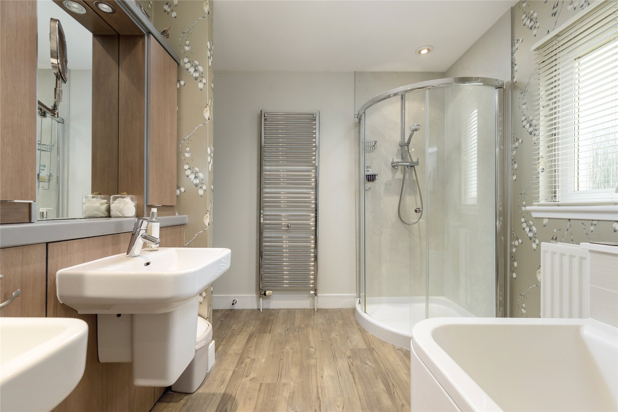 Outside there is a driveway and garden to the front and a fully enclosed generous rear garden. The rear garden enjoys lovely views from a split-level sun deck and there is a summer house/shed.