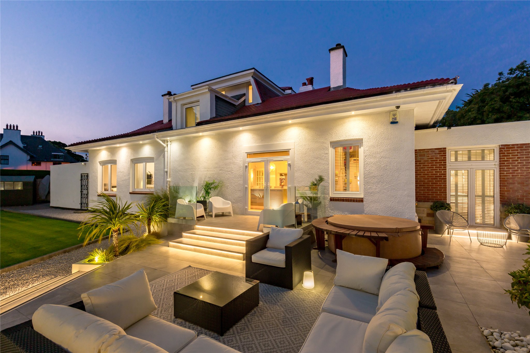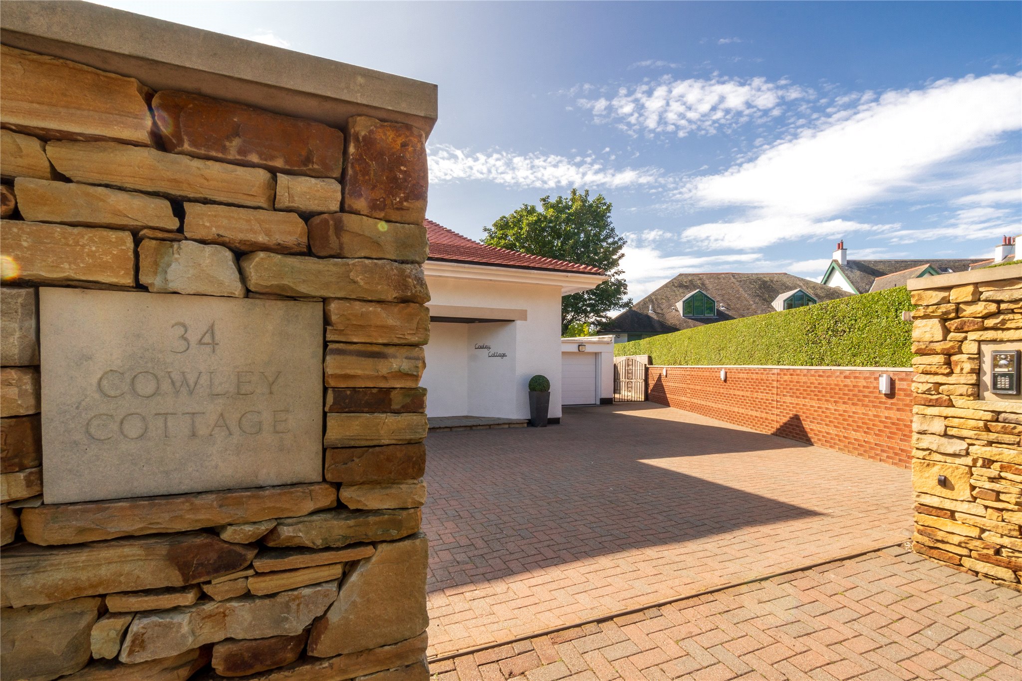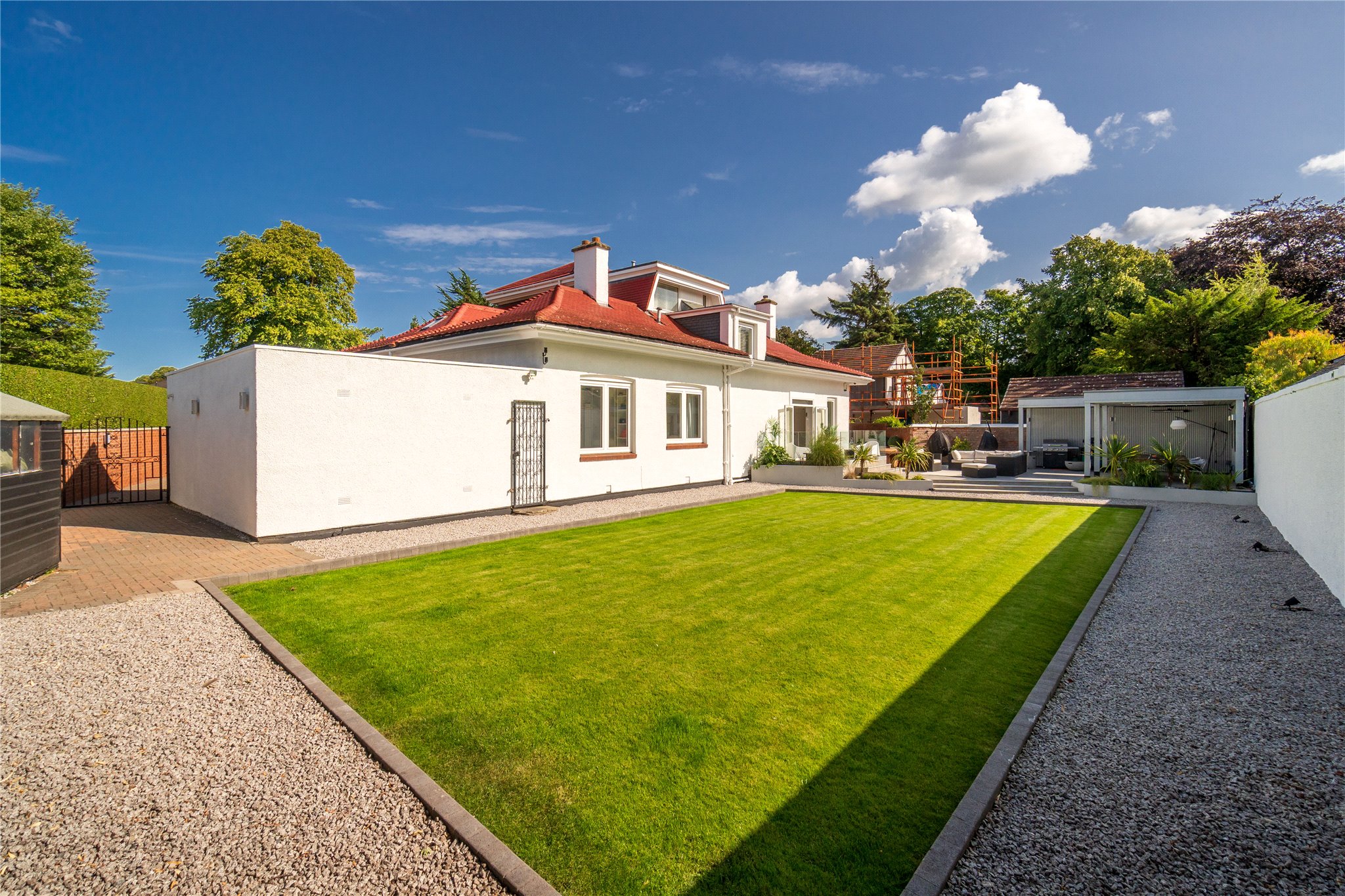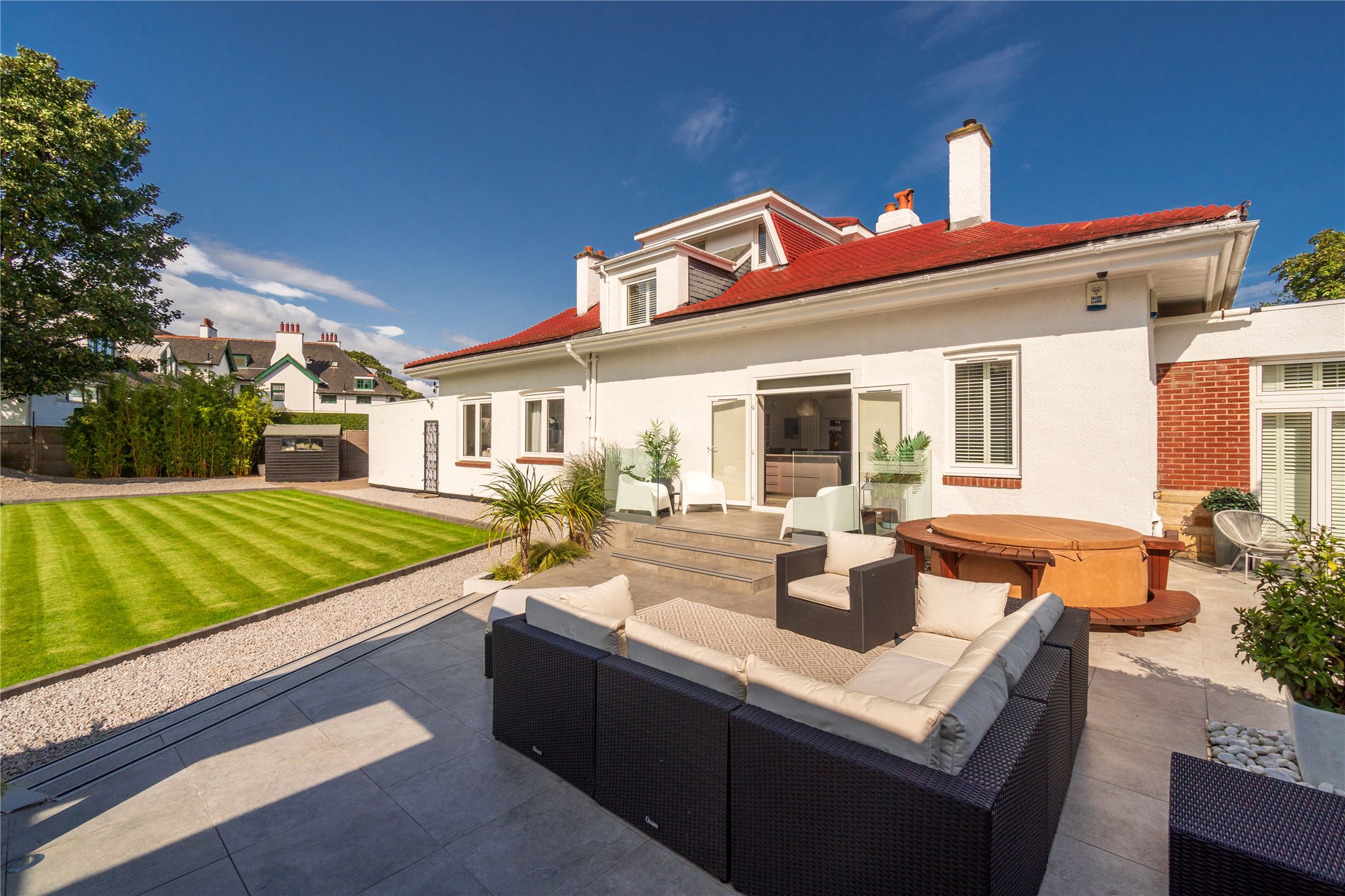 Cowley Cottage is a meticulously presented, five-bedroom period detached family home, set within an enclosed plot, situated on one of Edinburgh most exclusive residential streets in Barnton. Occupying a prime position, this magnificent family home comprises spacious and versatile accommodation offering the epitome of modern living. The ground floor level is host to the property’s public rooms, a generously proportioned sitting room with oak Herringbone flooring, dining room, and fully equipped Porcelanosa kitchen fitted with high specification integrated Siemens appliances (listed in summary below), breakfasting bar and direct access to the rear garden through patio doors. A useful utility room is situated off the kitchen. There are three double bedrooms located on this level. One of the double bedrooms is equipped with an en suite shower room, another benefits from direct access to the garden through patio doors. A study, which could be utilised as a fifth bedroom, and a shower room completes the floor. The first floor comprises the elegant principal bedroom suite enjoying tranquil leafy views over the garden, benefitting from a four-piece Porcelanosa en suite bathroom, two built-in wardrobes and access to eaves storage. Externally the property benefits from an abundance of private outdoor space including a large driveway offering parking for multiple vehicles and garage. To the rear is an immaculately kept rear garden, partially paved, laid to lawn with Pergola and built in outdoor heaters offering endless al fresco dining and entertaining opportunities.
