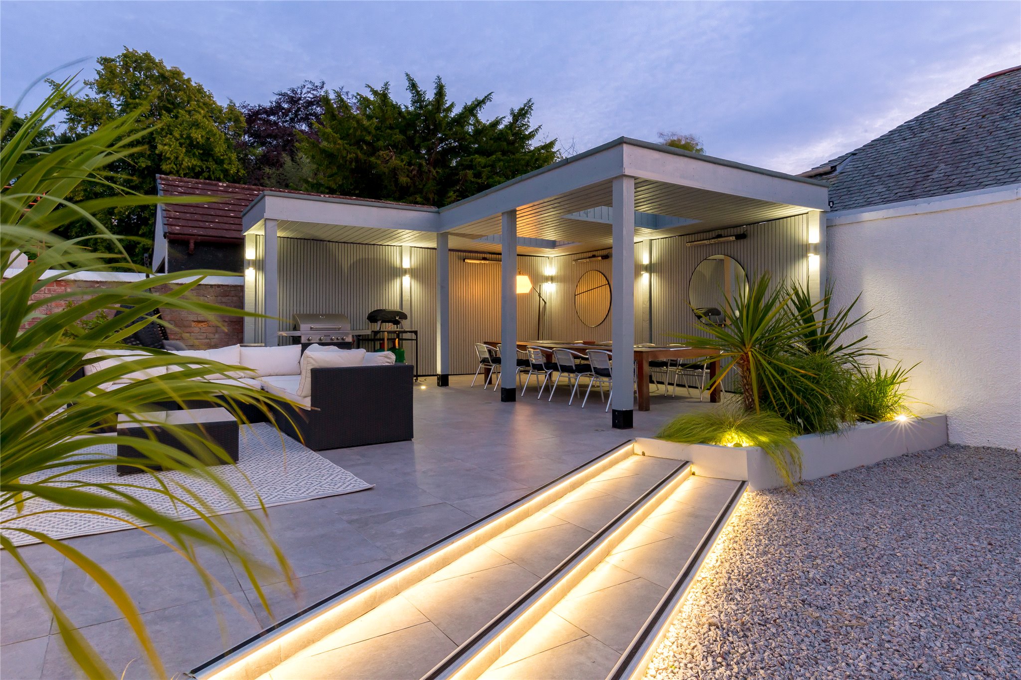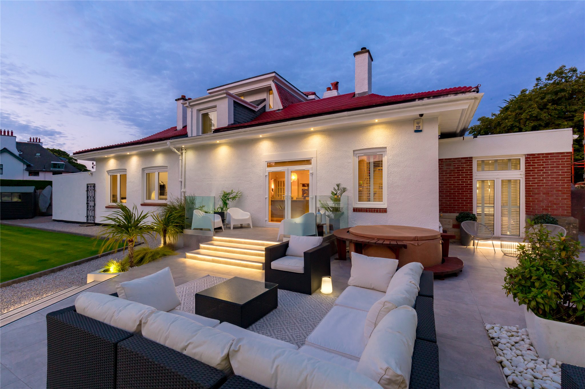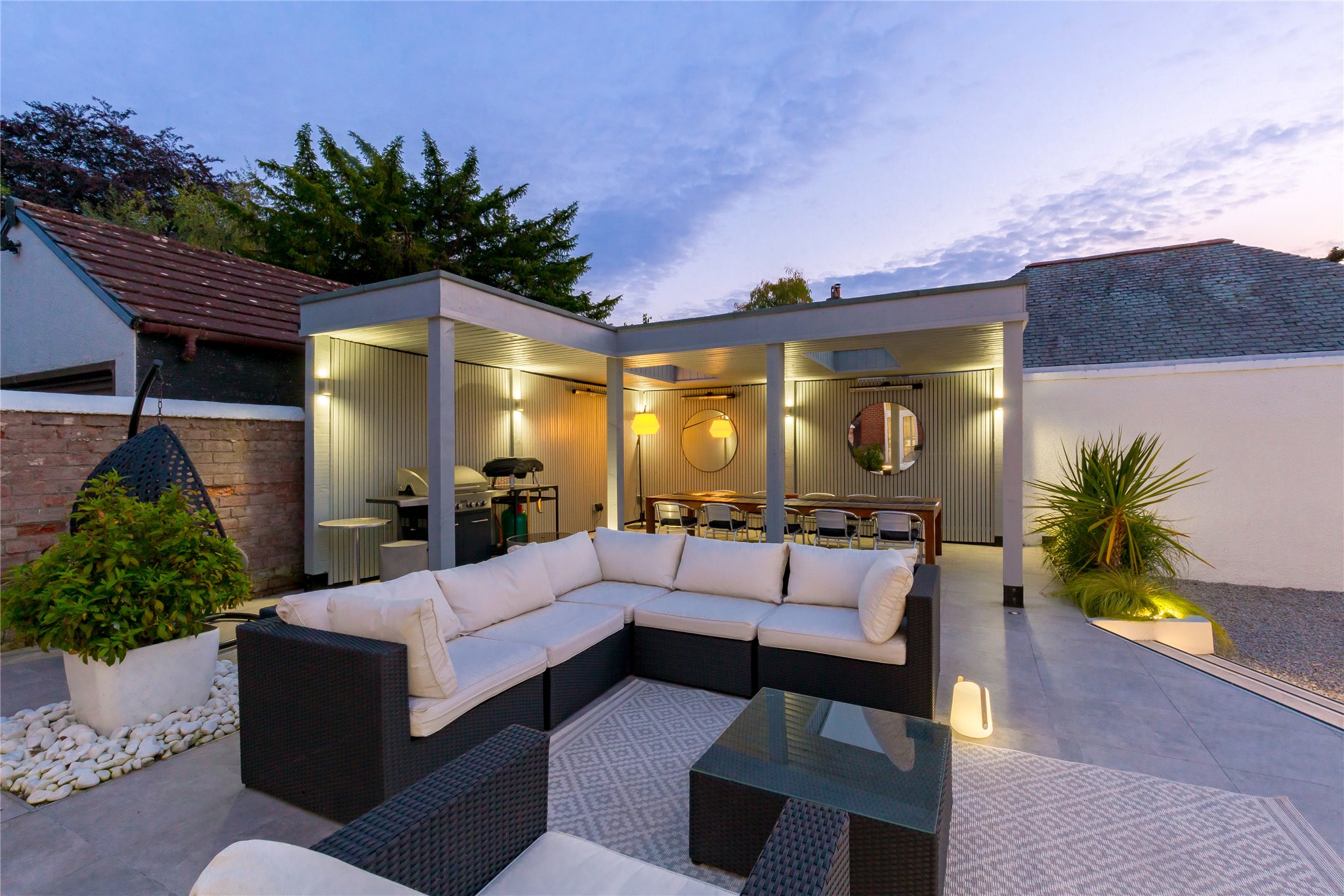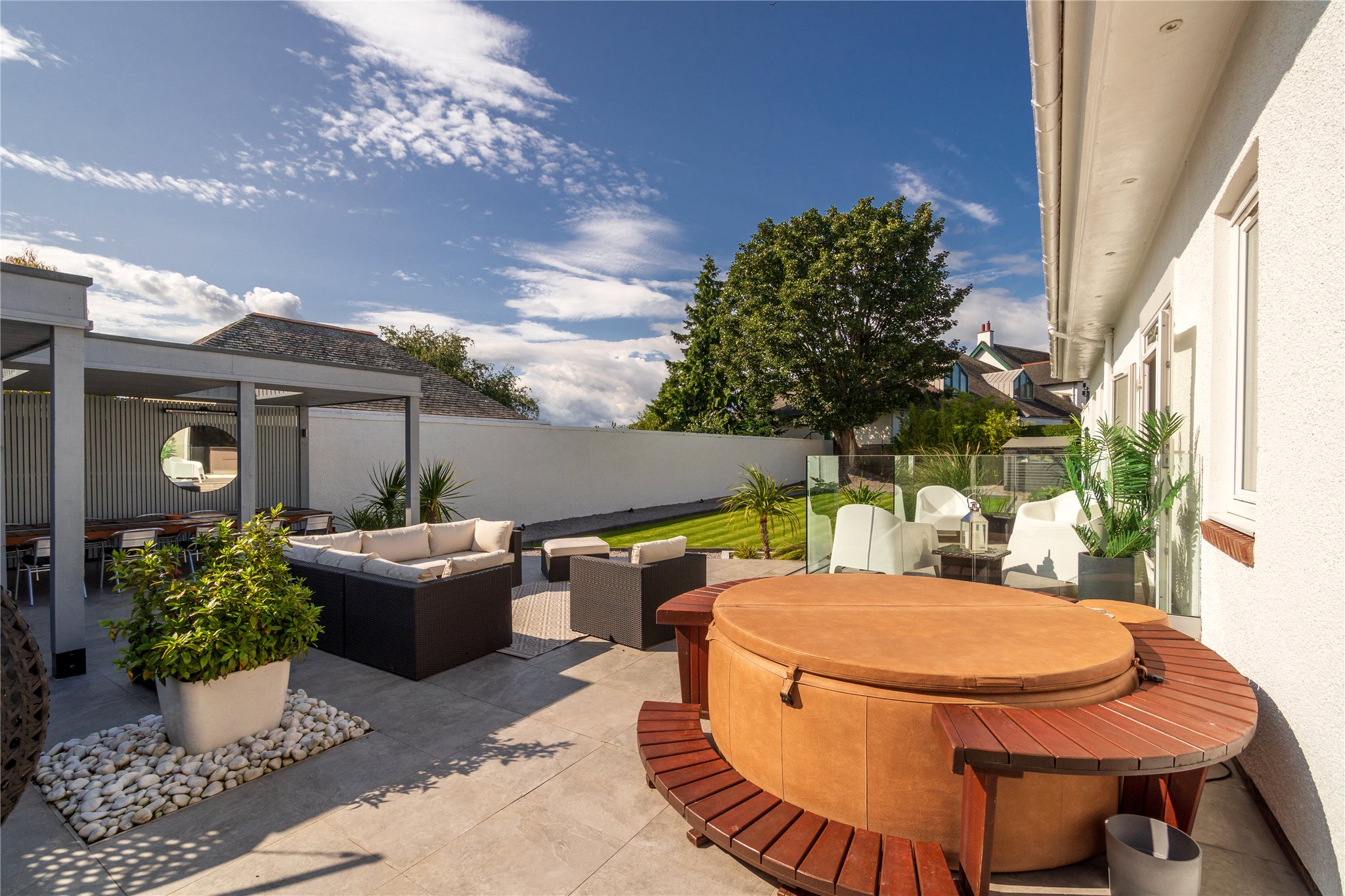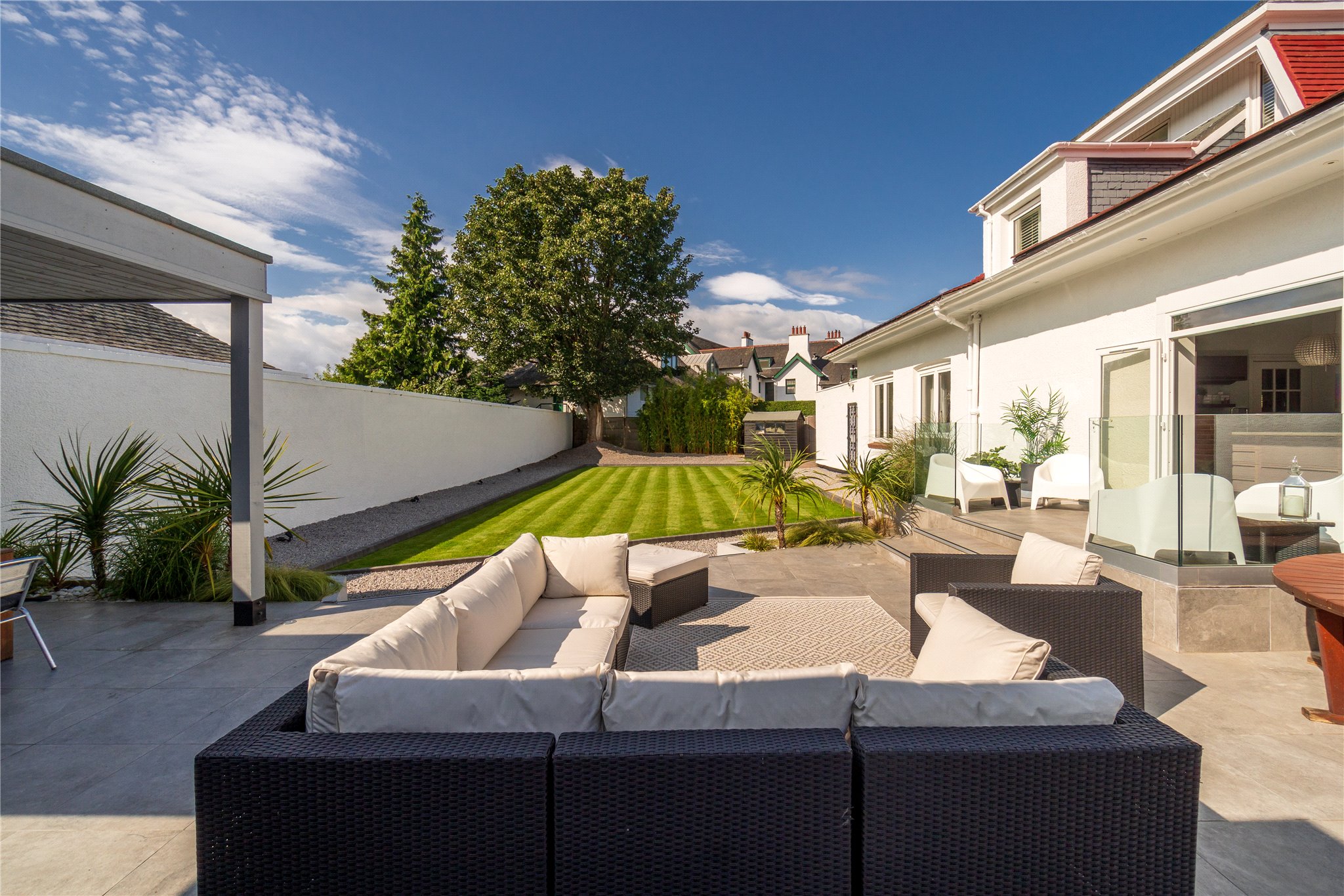 Cowley Cottage is a meticulously presented, five-bedroom period detached family home, set within an enclosed plot, situated on one of Edinburgh most exclusive residential streets in Barnton. Occupying a prime position, this magnificent family home comprises spacious and versatile accommodation offering the epitome of modern living. The ground floor level is host to the property’s public rooms, a generously proportioned sitting room with oak Herringbone flooring, dining room, and fully equipped Porcelanosa kitchen fitted with high specification integrated Siemens appliances (listed in summary below), breakfasting bar and direct access to the rear garden through patio doors. A useful utility room is situated off the kitchen. There are three double bedrooms located on this level. One of the double bedrooms is equipped with an en suite shower room, another benefits from direct access to the garden through patio doors. A study, which could be utilised as a fifth bedroom, and a shower room completes the floor. The first floor comprises the elegant principal bedroom suite enjoying tranquil leafy views over the garden, benefitting from a four-piece Porcelanosa en suite bathroom, two built-in wardrobes and access to eaves storage. Externally the property benefits from an abundance of private outdoor space including a large driveway offering parking for multiple vehicles and garage. To the rear is an immaculately kept rear garden, partially paved, laid to lawn with Pergola and built in outdoor heaters offering endless al fresco dining and entertaining opportunities.