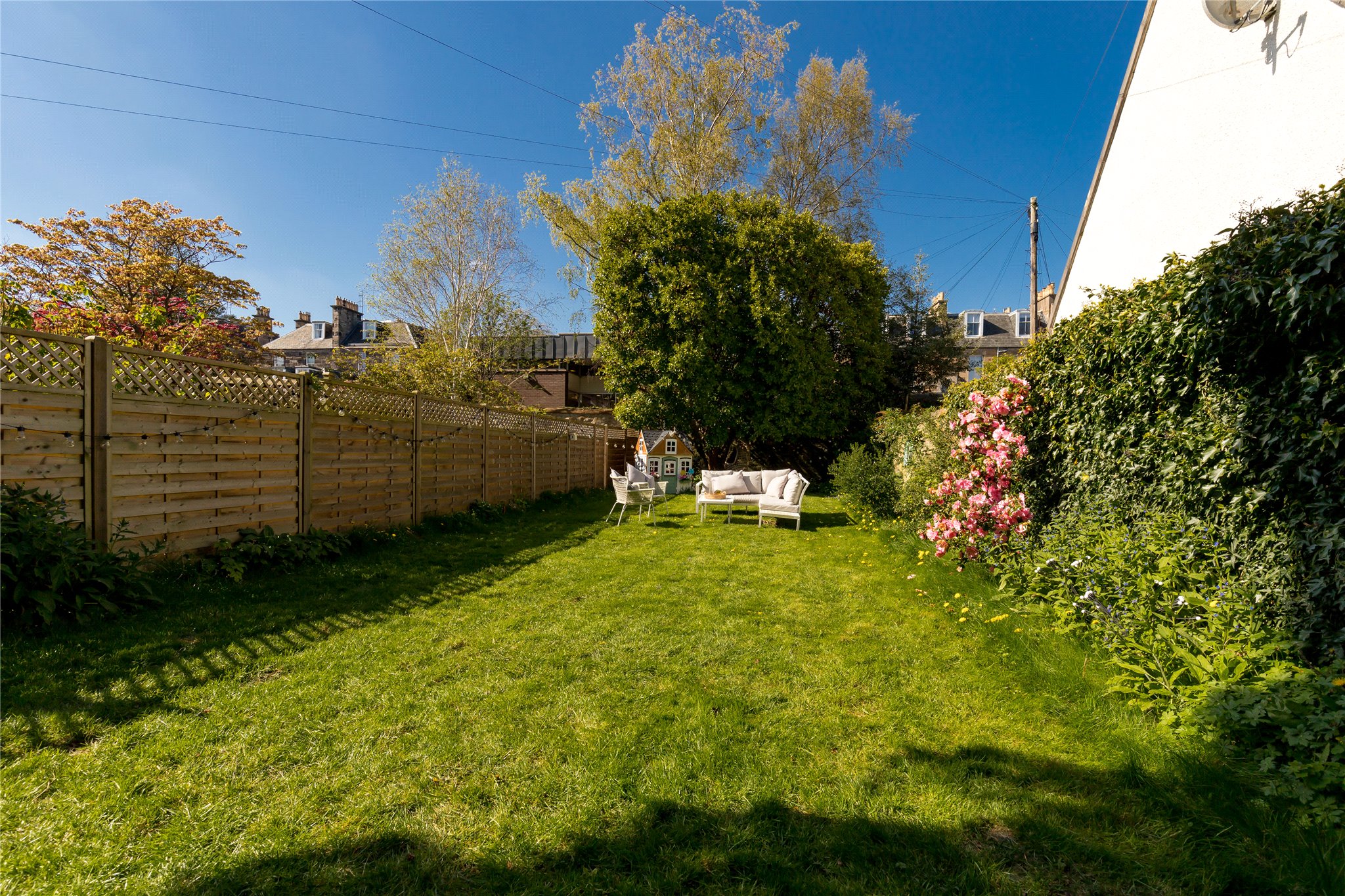 Large rear enclosed garden mainly laid to grass with mature shrubs and planting, decked and patio areas providing excellent relaxation, play and al fresco dining space.
