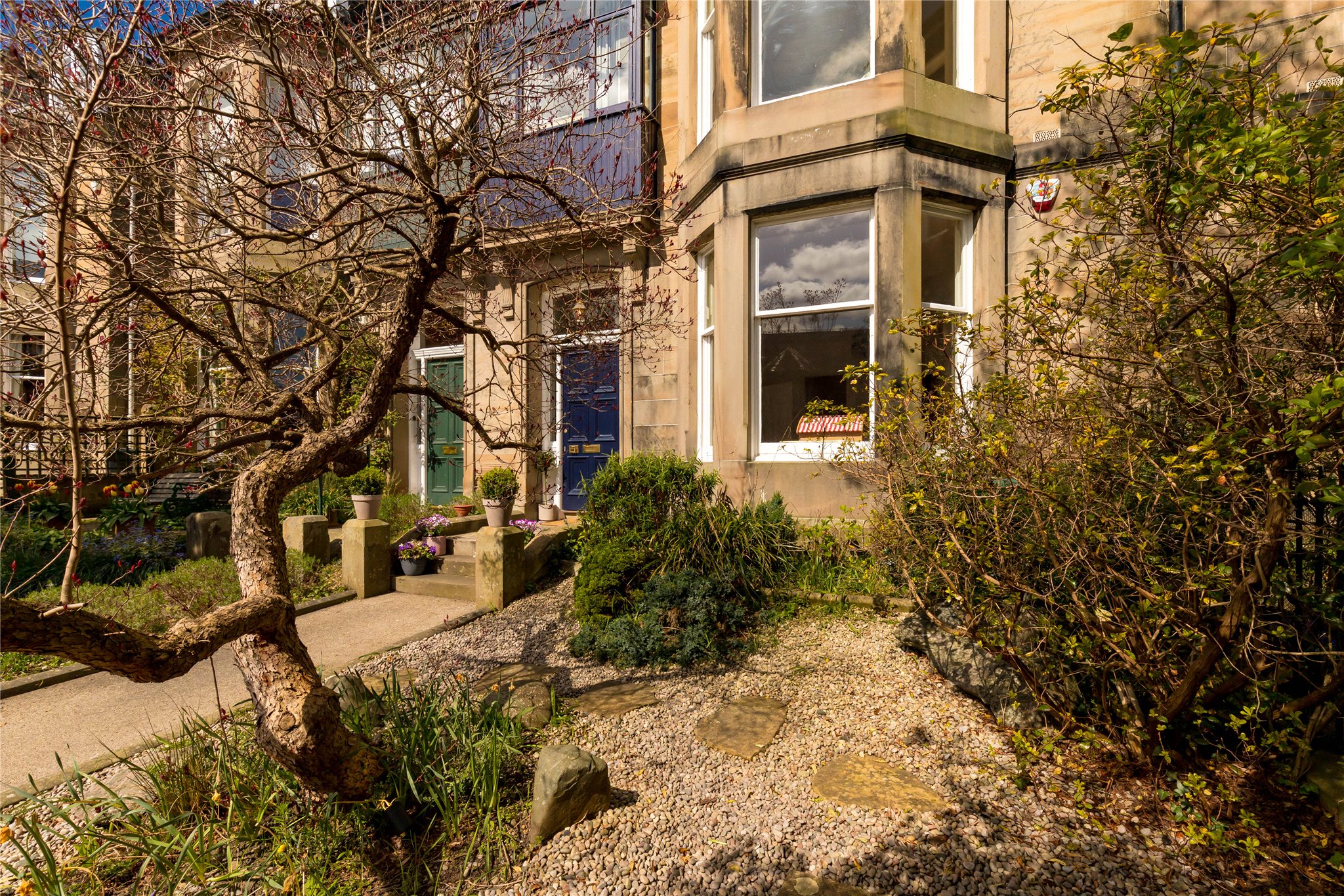 Beautiful, landscaped front garden with mature shrubs and plants.