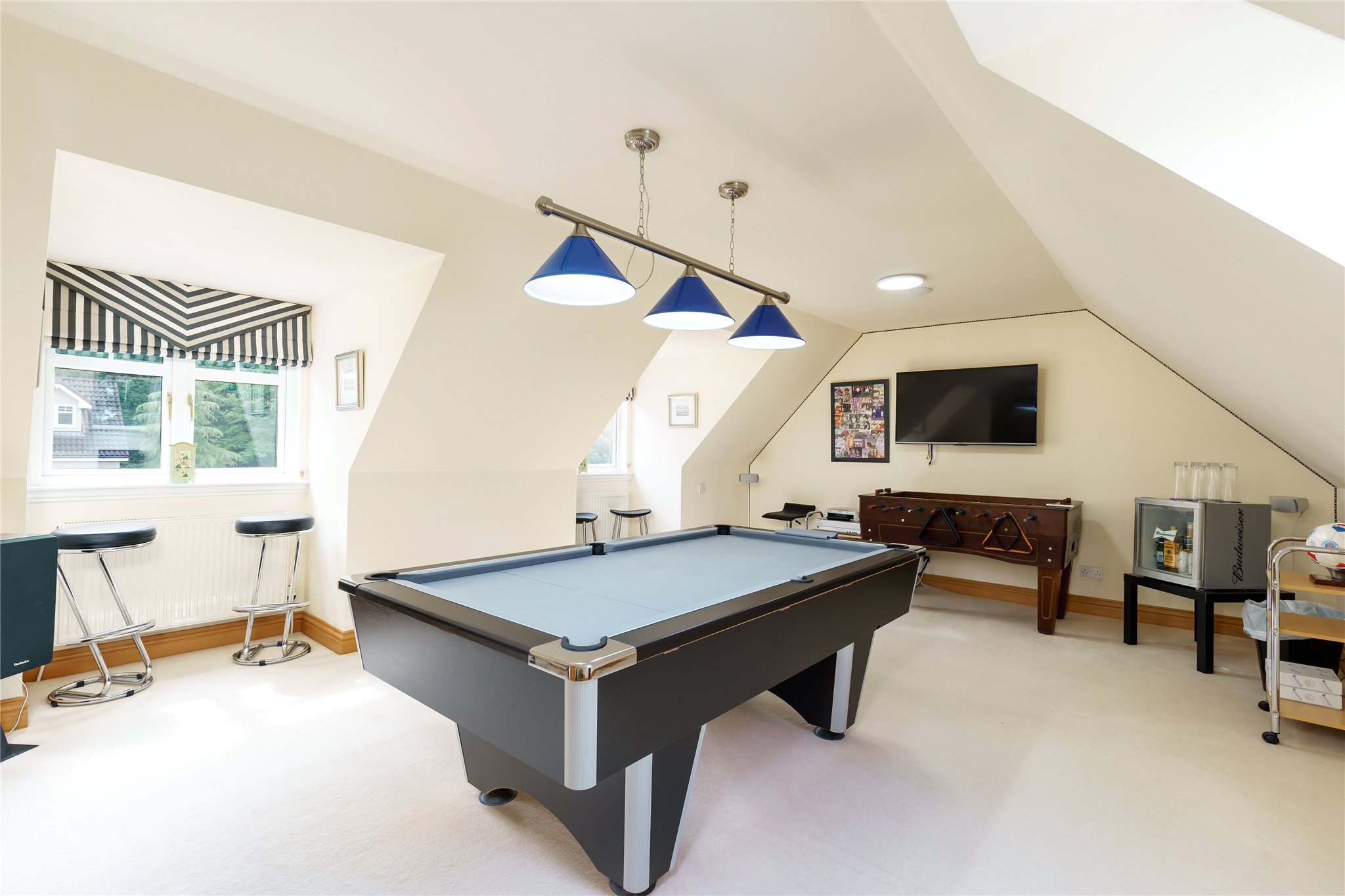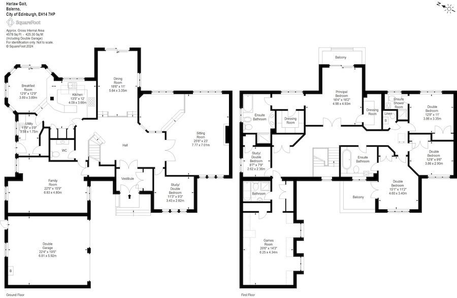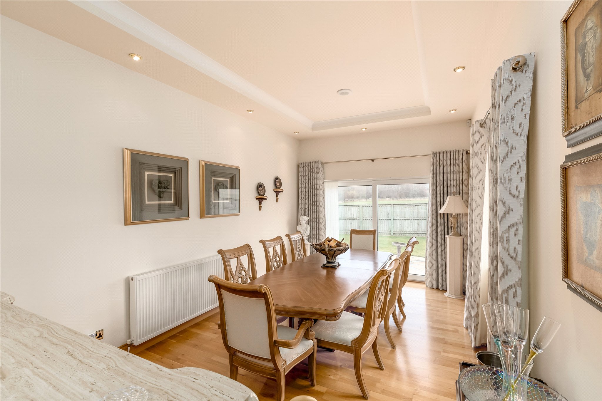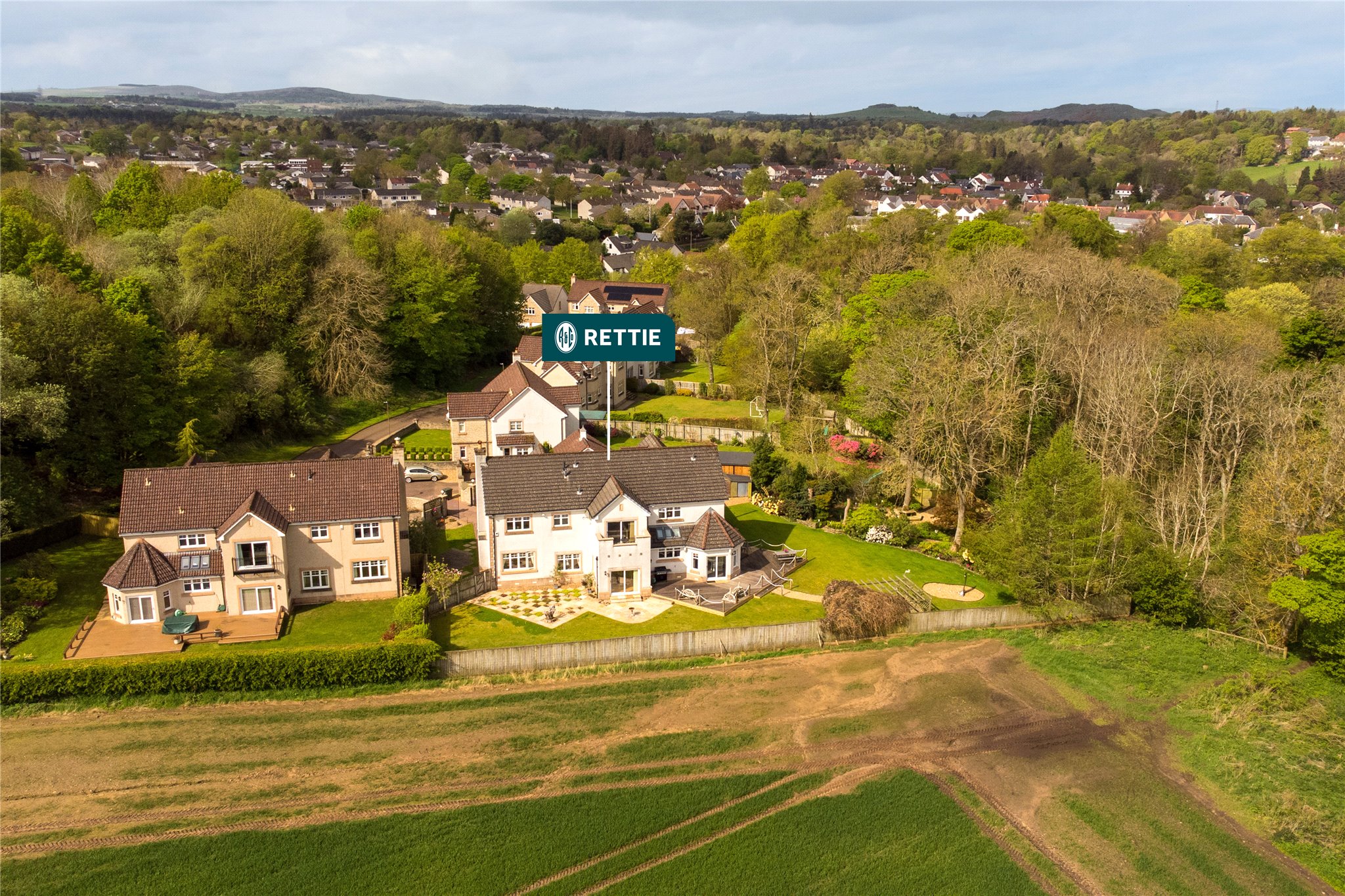 The property is approached through its private electric gated driveway allowing off street parking for multiple vehicles with a double garage and electric car charger. A welcoming entrance vestibule leads to a large entrance hall, the ground floor accommodation comprising a spacious sitting room, dining room, family room, study/fifth double bedroom, fully equipped kitchen benefitting from integrated appliances, breakfast room, utility room, and WC. The first-floor level comprises the property’s pièce de résistance, its principal bedroom suite, including double dressing rooms, en suite bathroom and private balcony with far reaching views to the Pentland Hills. There is a second double bedroom benefitting from an en suite bathroom with private balcony. There are two further double bedrooms, one of which benefits from an en suite shower room, and a study (which could be utilised as a sixth bedroom). A spacious bedroom/games room and bathroom which could be used as a granny flat. The property has an integrated music system throughout.