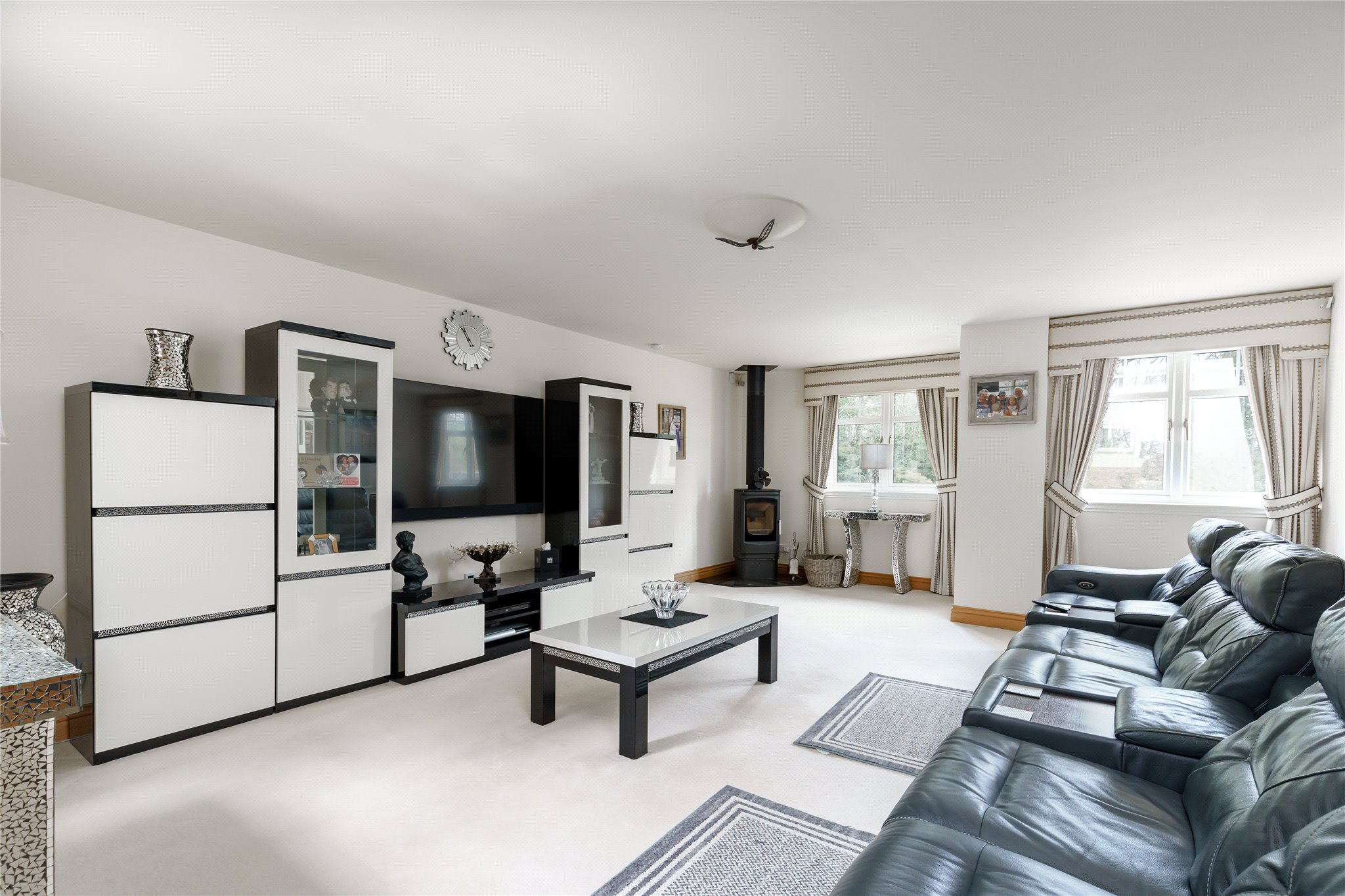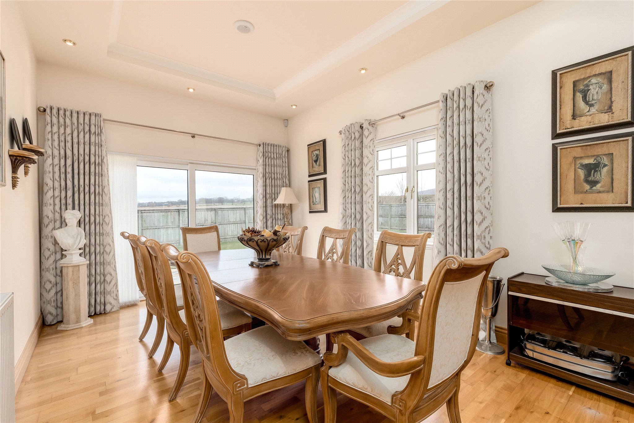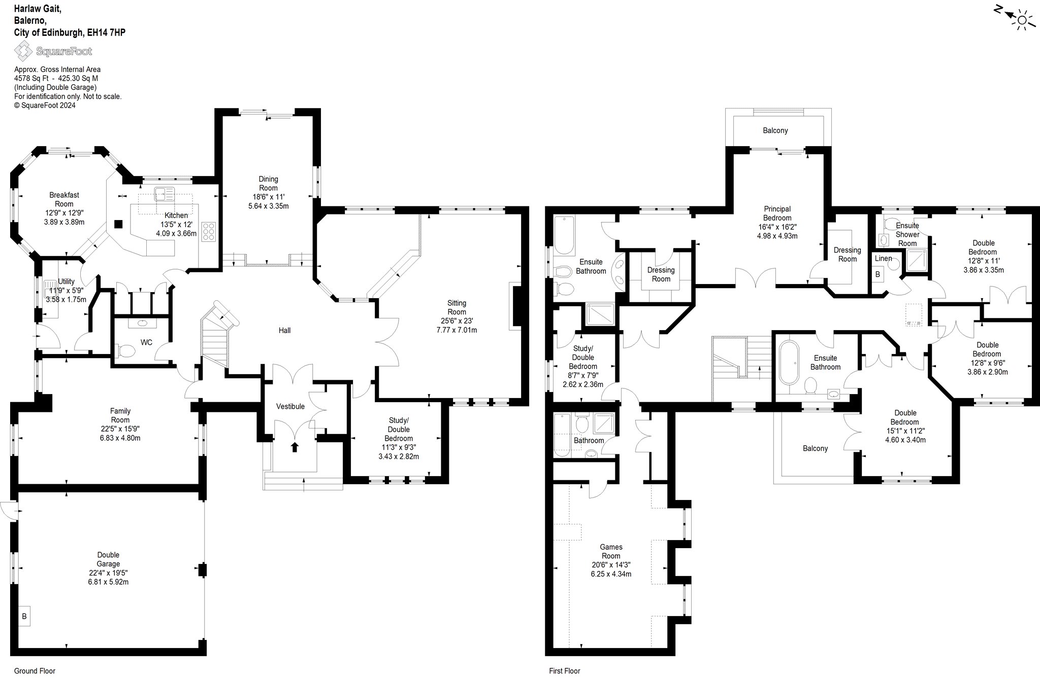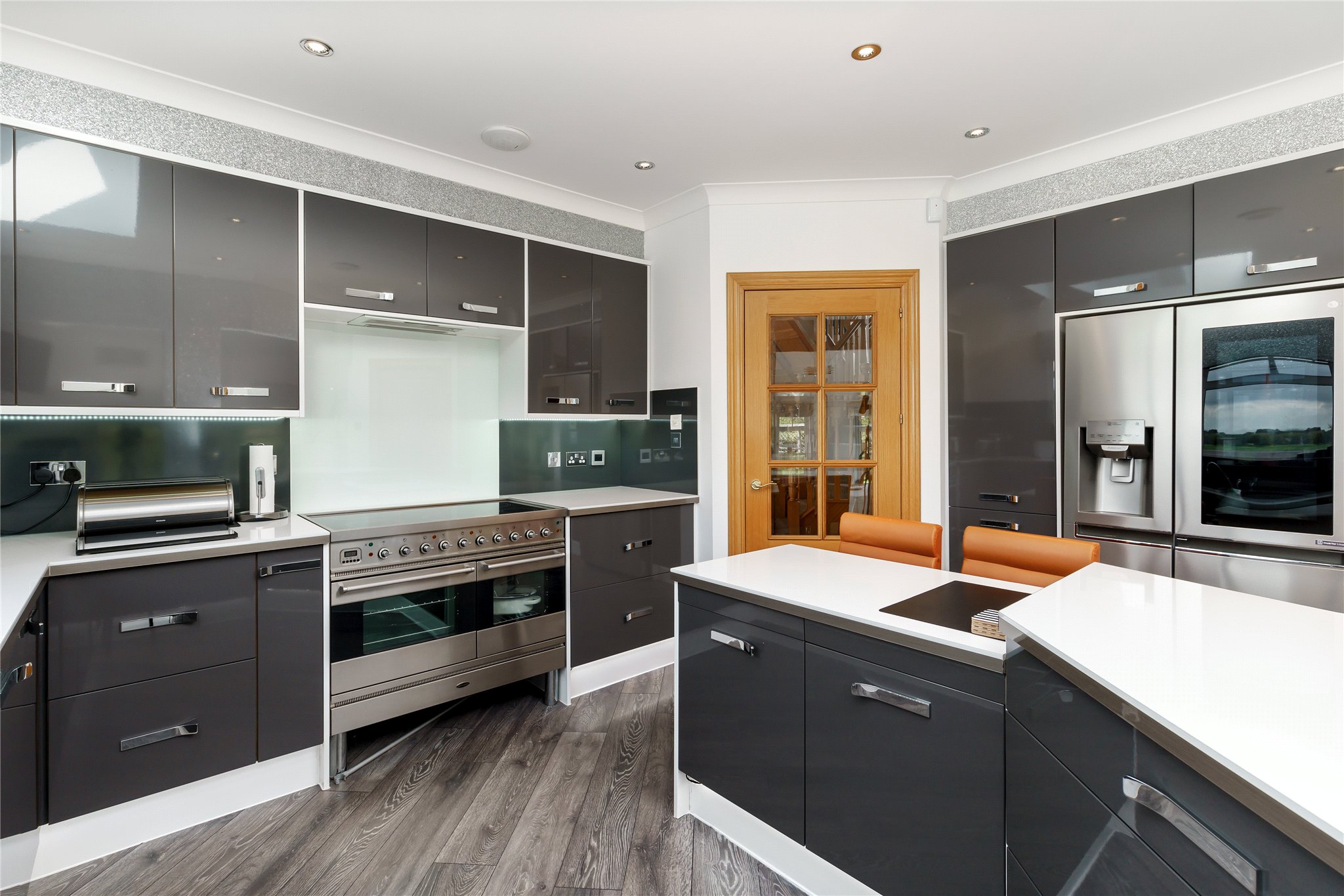 The property is approached through its private electric gated driveway allowing off street parking for multiple vehicles with a double garage and electric car charger. A welcoming entrance vestibule leads to a large entrance hall, the ground floor accommodation comprising a spacious sitting room, dining room, family room, study/fifth double bedroom, fully equipped kitchen benefitting from integrated appliances, breakfast room, utility room, and WC. The first-floor level comprises the property’s pièce de résistance, its principal bedroom suite, including double dressing rooms, en suite bathroom and private balcony with far reaching views to the Pentland Hills. There is a second double bedroom benefitting from an en suite bathroom with private balcony. There are two further double bedrooms, one of which benefits from an en suite shower room, and a study (which could be utilised as a sixth bedroom). A spacious bedroom/games room and bathroom which could be used as a granny flat. The property has an integrated music system throughout.