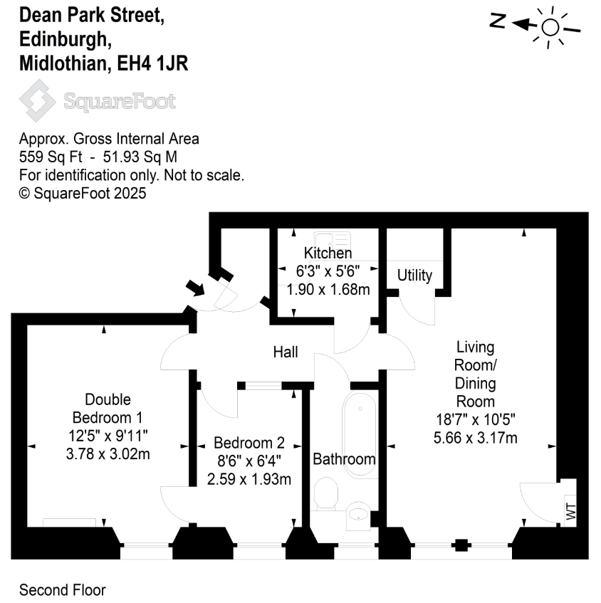 The interior is well-presented and thoughtfully laid out. At its heart is a bright and spacious living/dining room, enhanced by twin sash windows that bring in plentiful natural light from the West facing aspect. A separate kitchen, compact yet practical, sits adjacent and benefits from an adjoining utility room — a rare and useful feature in a flat of this size.
