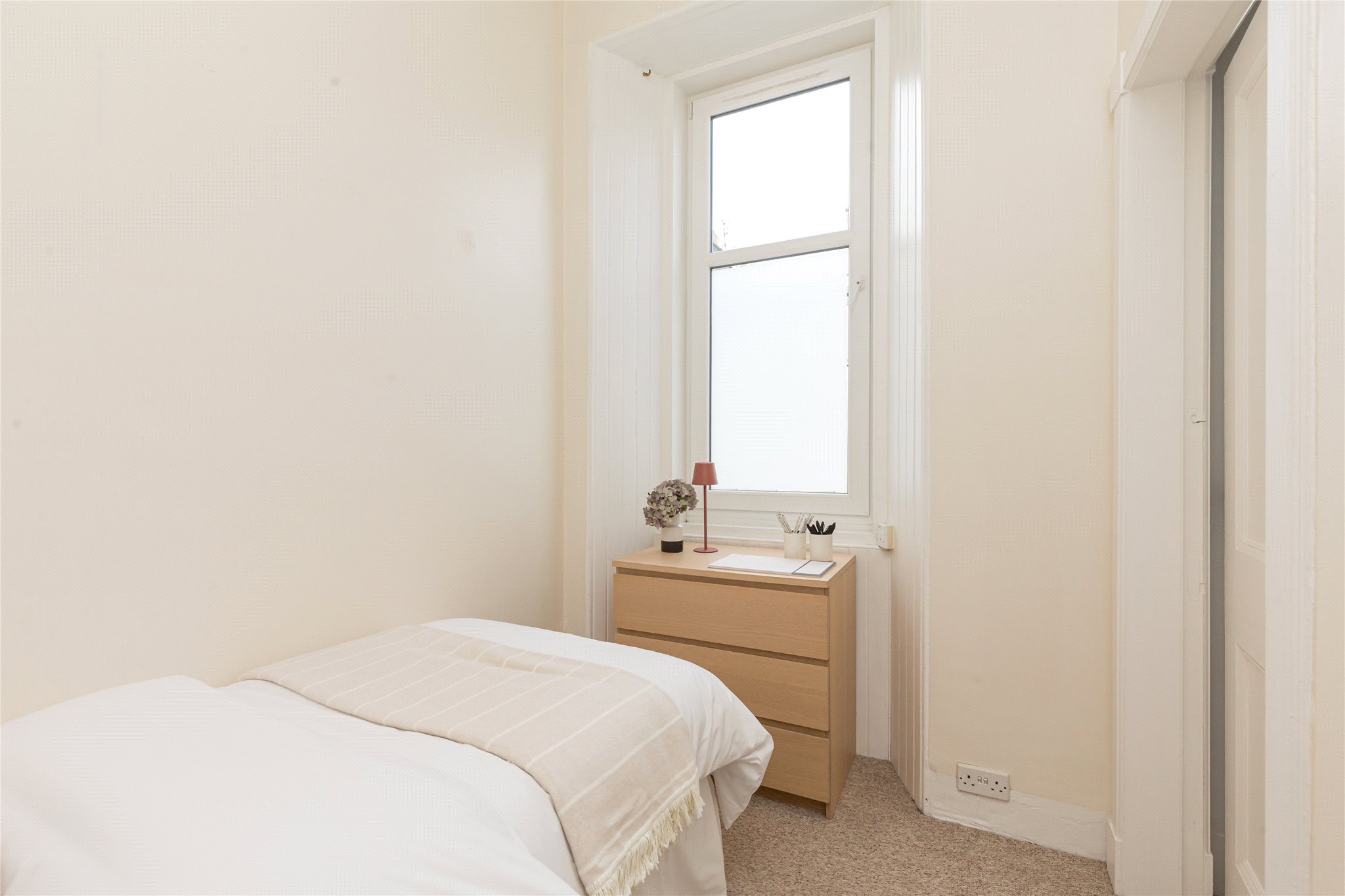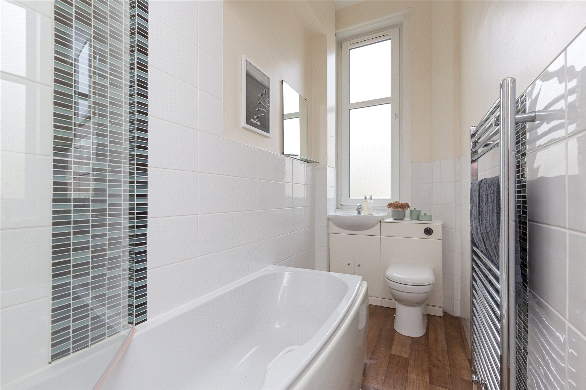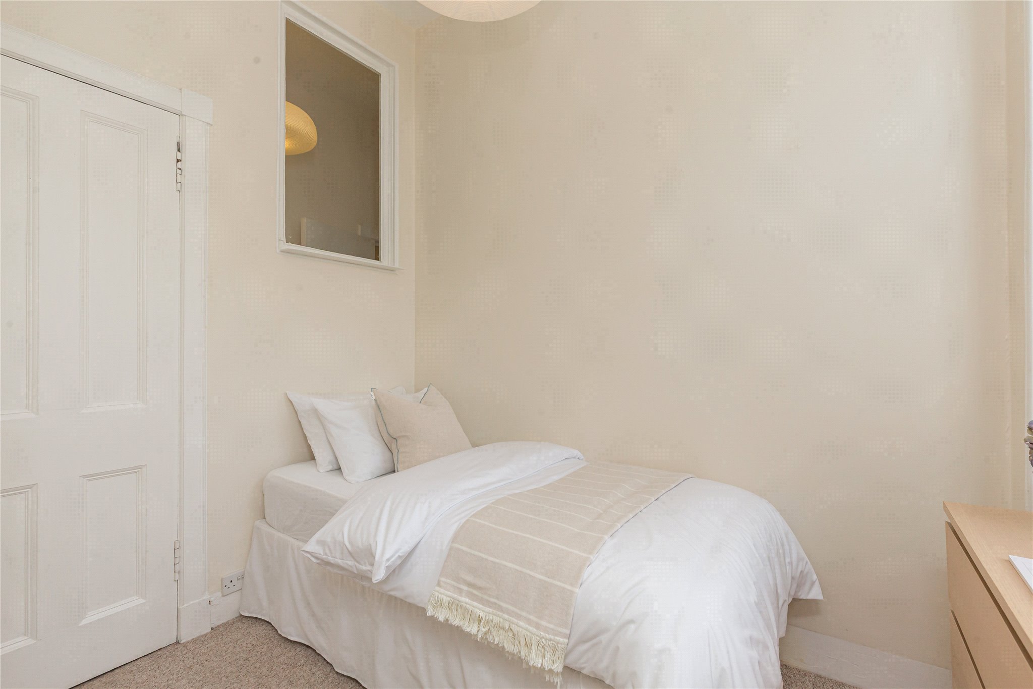 The accommodation also comprises a generously sized double bedroom with an original feature fireplace, a second single bedroom or home office, and a neatly finished bathroom with a full-sized bath and overhead shower. Gas central heating and traditional features, including high ceilings and original cornicing, contribute to the flat’s comfort and character.