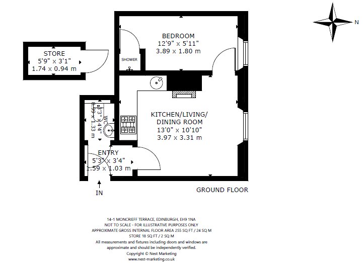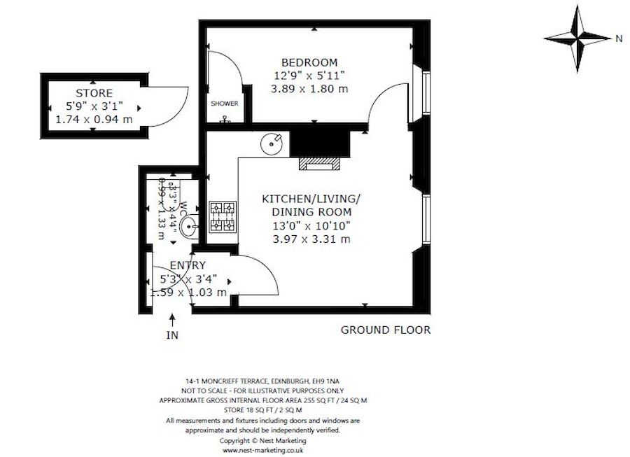 Entrance Vestibule, Kitchen/Living/Dining Room, Bedroom, Shower room, W/C