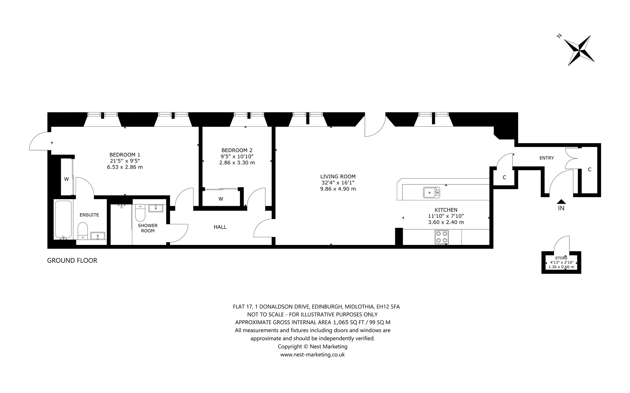 Forming part of the impressive, formal Donaldsons School (1851-2008) and the exclusive Playfair development, this beautiful two bedroom, ground floor apartment offers a very cottage like feel with all the modern specification you would expect from such a development. This immaculately presented apartment provides a modern open plan kitchen/ living room with high specification, Siemens appliances and wonderful views to the grounds, a principle bedroom with en-suite bathroom, further double bedroom with build in wardrobes and a separate shower room. The apartment also benefits from private, direct access on to the 16 acres of immaculately maintained grounds, as well as two private parking spaces within the underground car park. There is also a large, separate storage cupboard belonging to the property, providing a great amount of useful additional storage.
