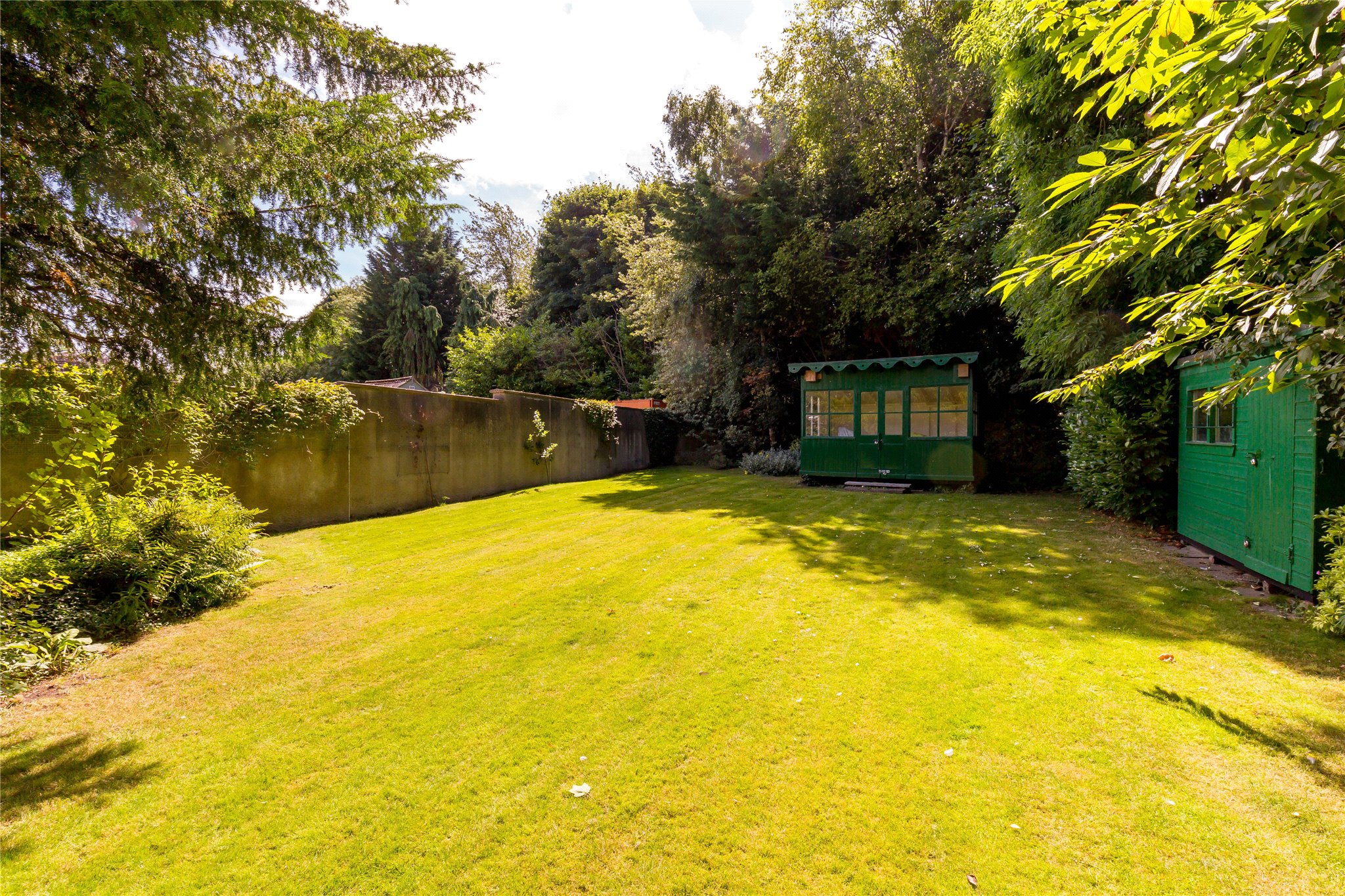 Rear garden with patio lawn, summer house & shed, edged with mature trees & shrubbery