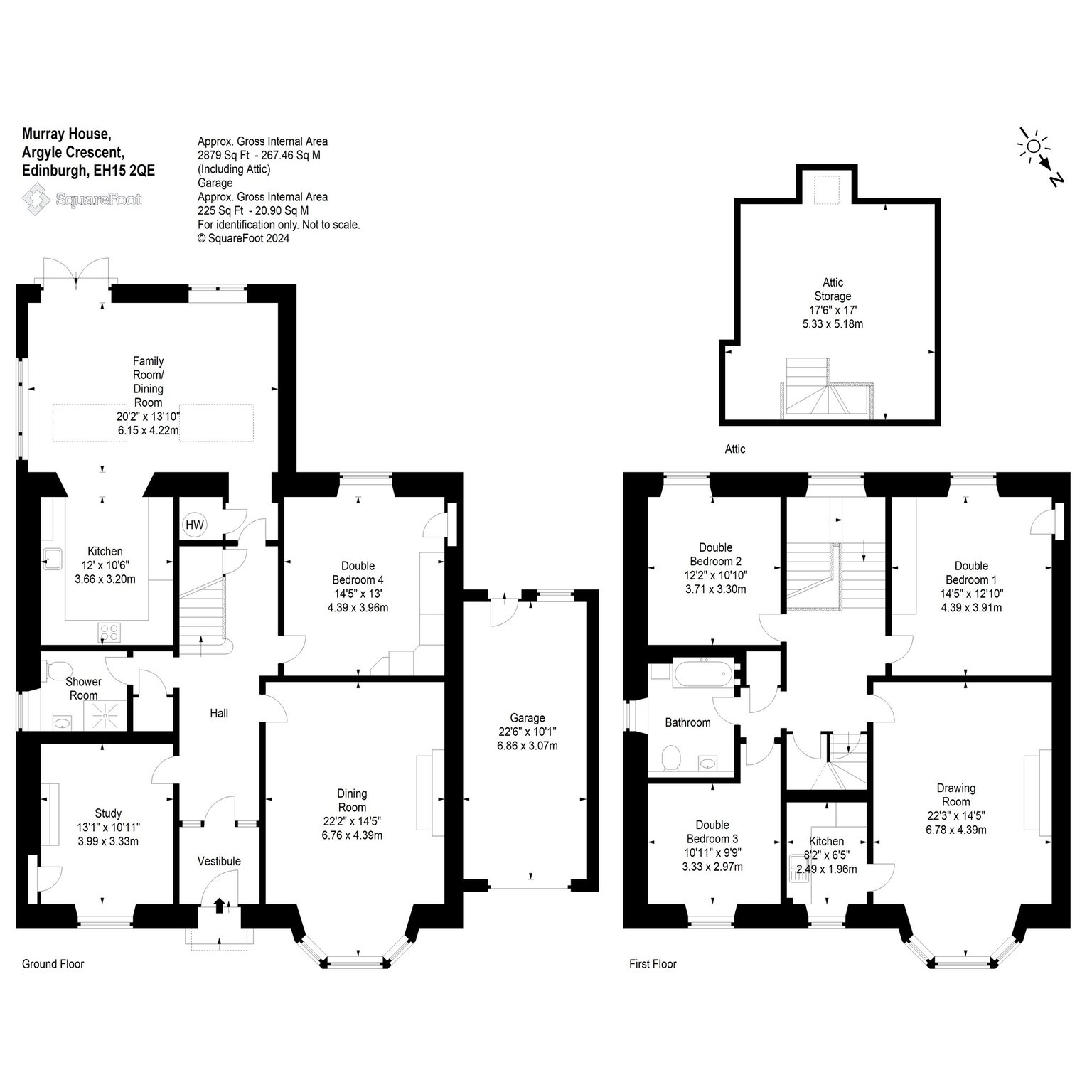 The entrance vestibule leads to the ground floor accommodation comprising a generously proportioned dining room, study/bedroom five, open plan family room and dining room with fully equipped kitchen benefitting from integrated appliances offering direct access to the rear garden, storage cupboard housing the hot water tank, fourth double bedroom and shower room. The first floor is host to the grand drawing room with door to a service kitchen ideal for entertaining, three double bedrooms, and family bathroom. A large, floored attic completes the internal accommodation.