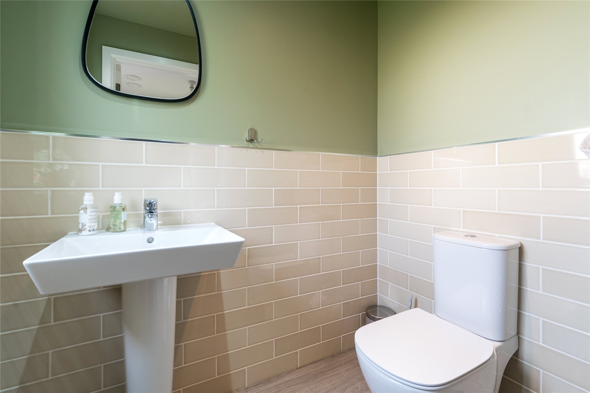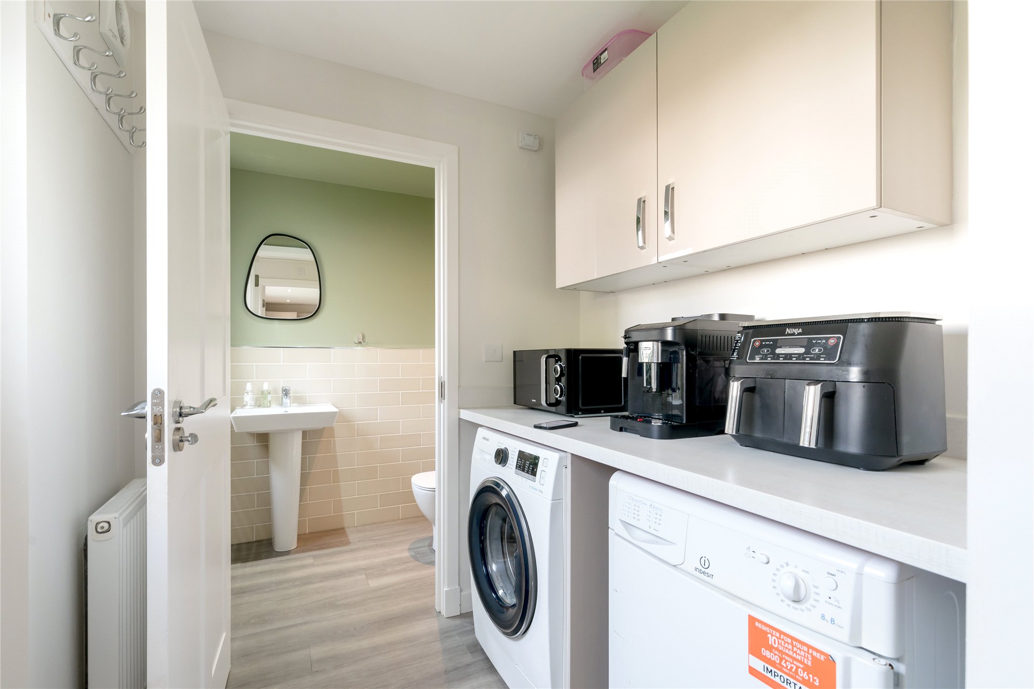 Entrance hall with two storage cupboards, sitting room, dining kitchen with integrated appliances and a box bay window with French Door access to the garden; separate utility room with washer and drier, door to the garden, cloakroom.
