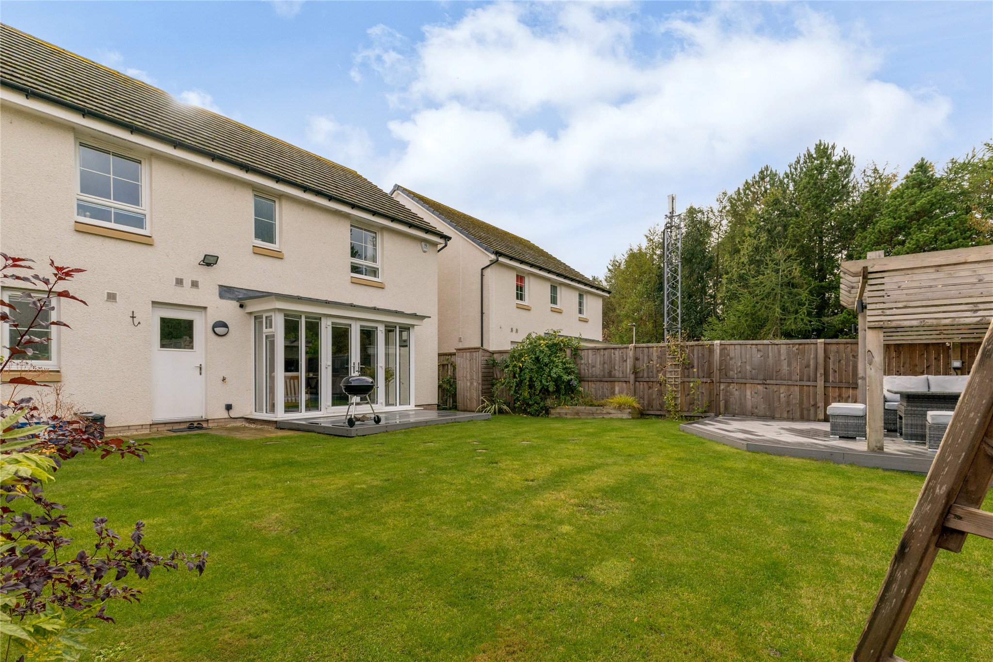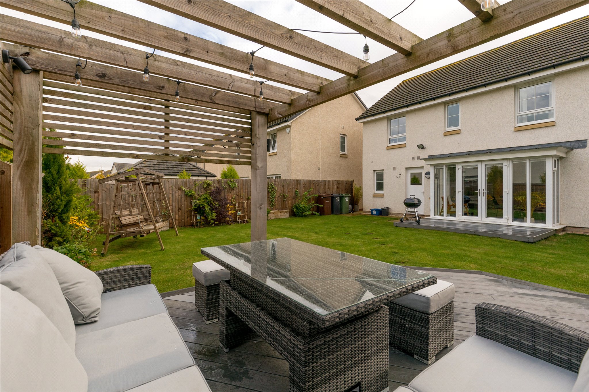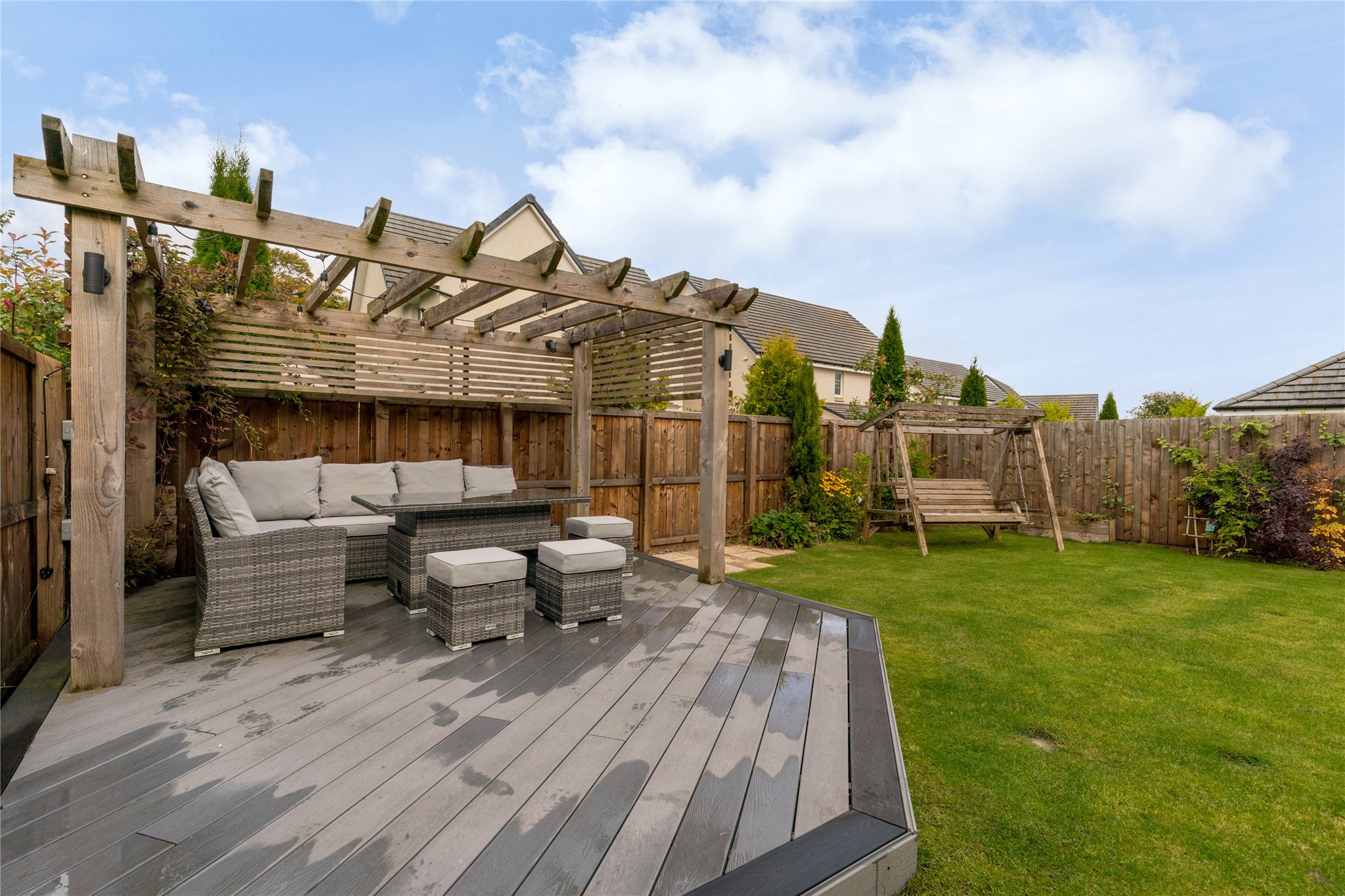 Private front garden. Large enclosed rear garden with decking, pergola with seating and outside electricity supply. Integral garage for two cars with private driveway.