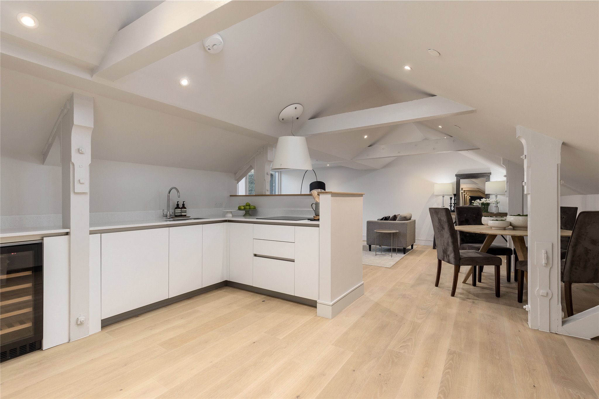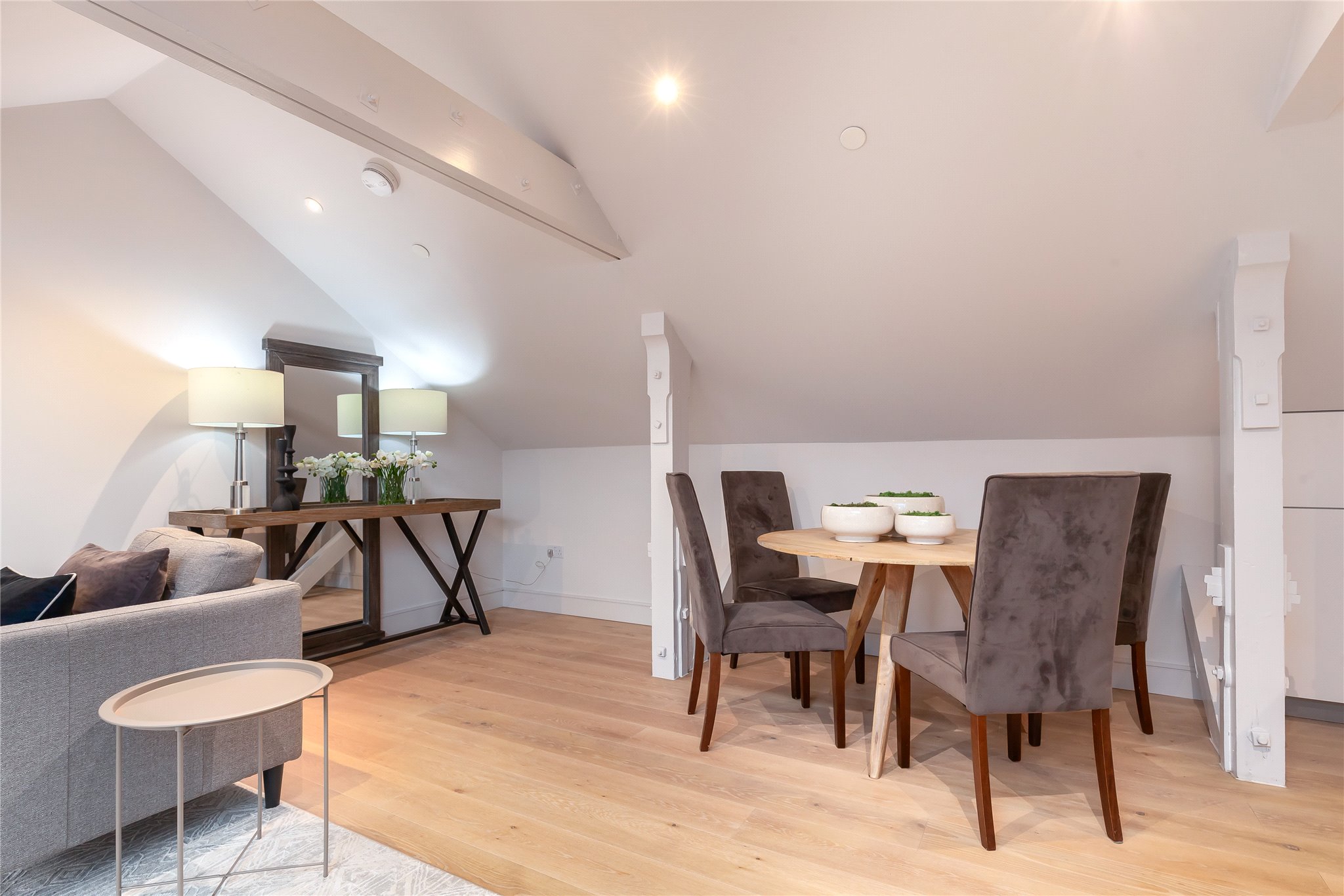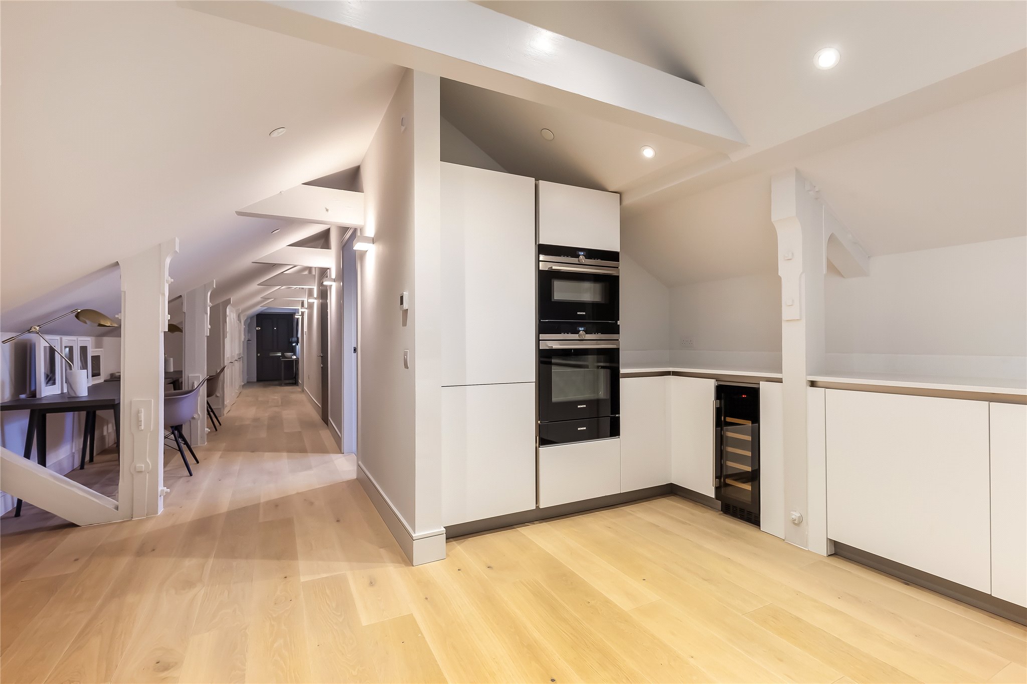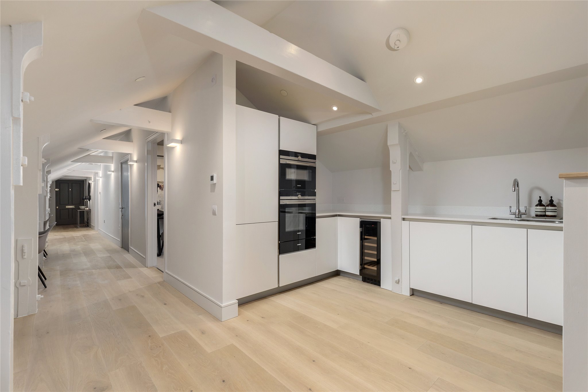 Situated on the second floor of the building oozing history and grandeur, this hideaway apartment is spacious yet cosy meeting every contemporary need to the highest quality. The property comprises entrance hallway with fitted storage and space for home office working, fully equipped kitchen benefitting from integrated Siemens appliances open plan sitting/dining room offering direct access to the private south facing terrace through sliding doors, ideal for al fresco dining and entertaining. There is a principal bedroom benefitting from fitted wardrobe storage and ensuite shower room, a second double bedroom, and bathroom completing the space.