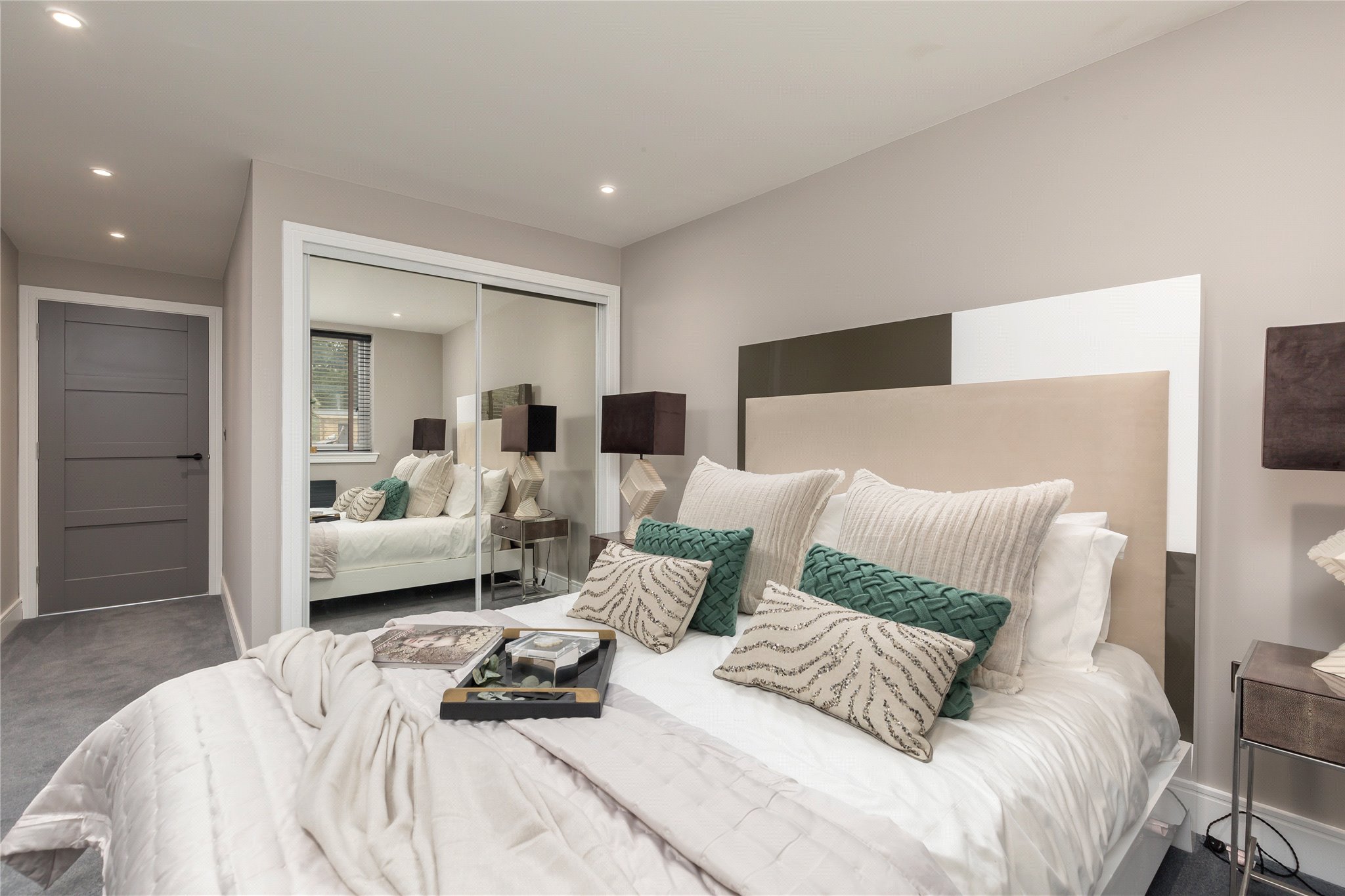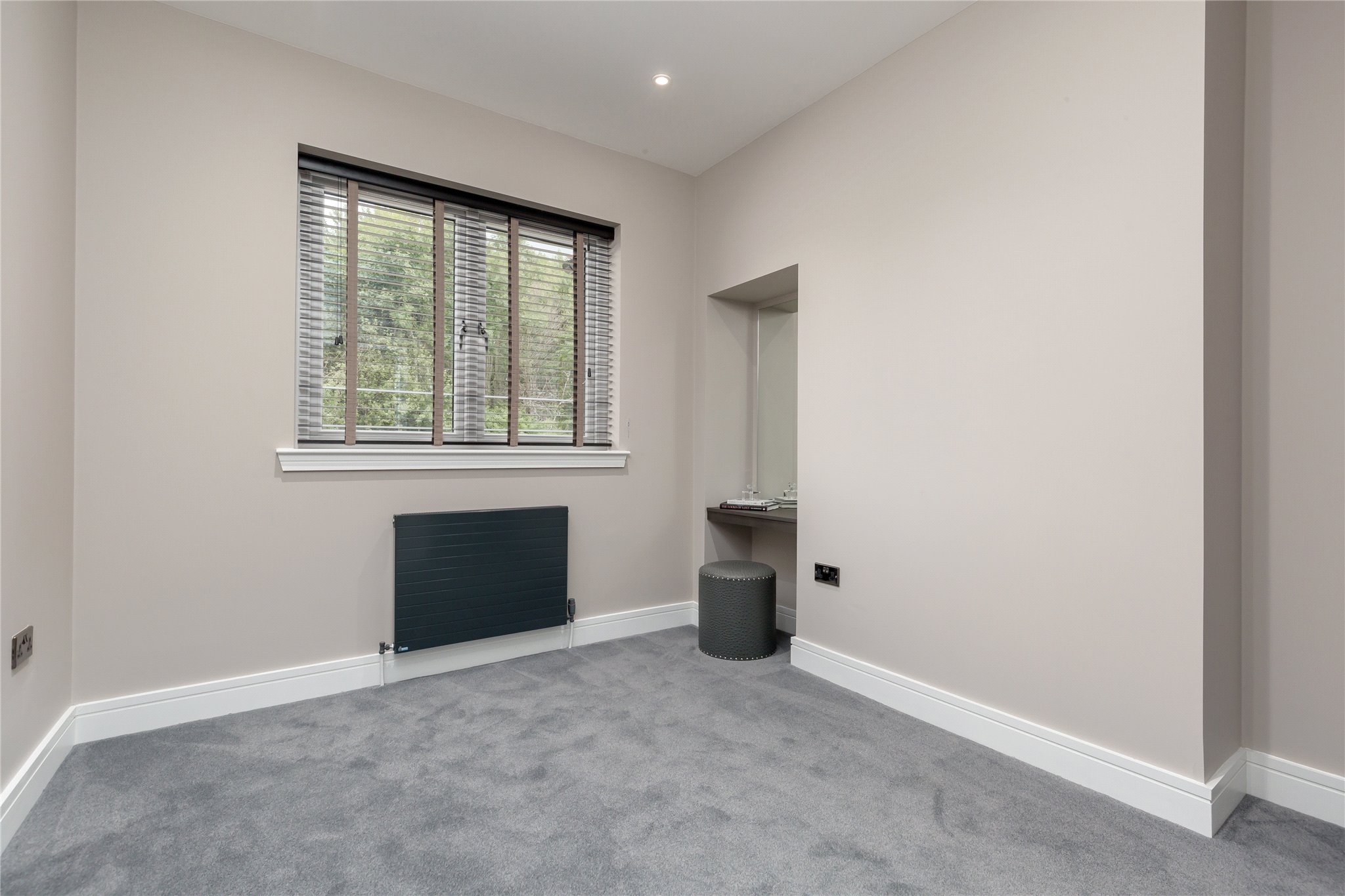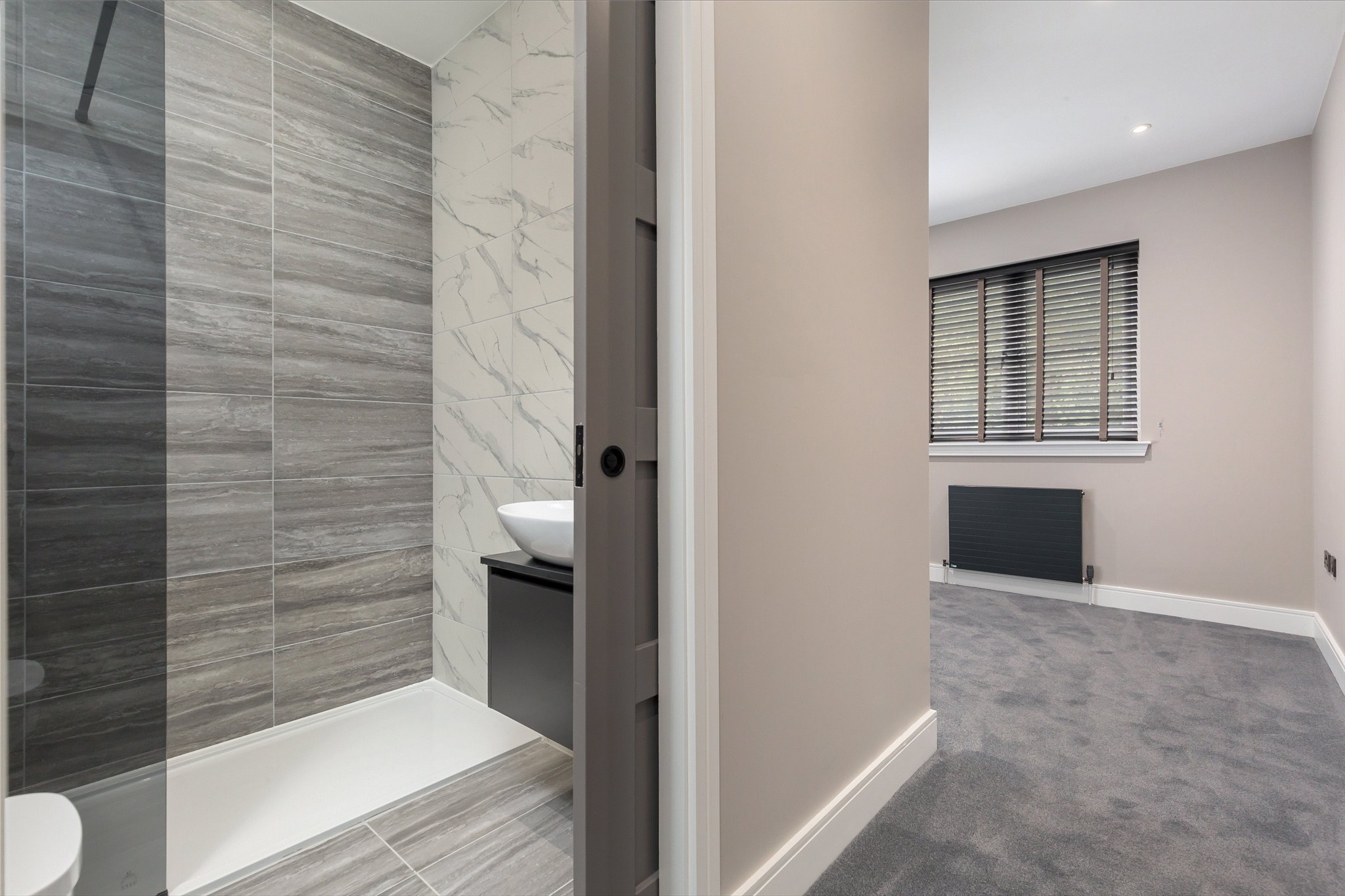 The principal suite is a peaceful retreat, complete with built-in wardrobes and a contemporary ensuite shower room. Two further generously sized double bedrooms share a well-appointed family bathroom and benefit from ample storage and thoughtful lighting. Practicality abounds with two hall cupboards and a boiler cupboard providing excellent storage solutions, while loft access offers further space. Throughout the home, design touches such as LED spotlighting, USB power outlets, and anti fog mirrors add to the sense of refinement. Externally, the property benefits front landscaped front and rear gardens with a private driveway affording off-street parking.