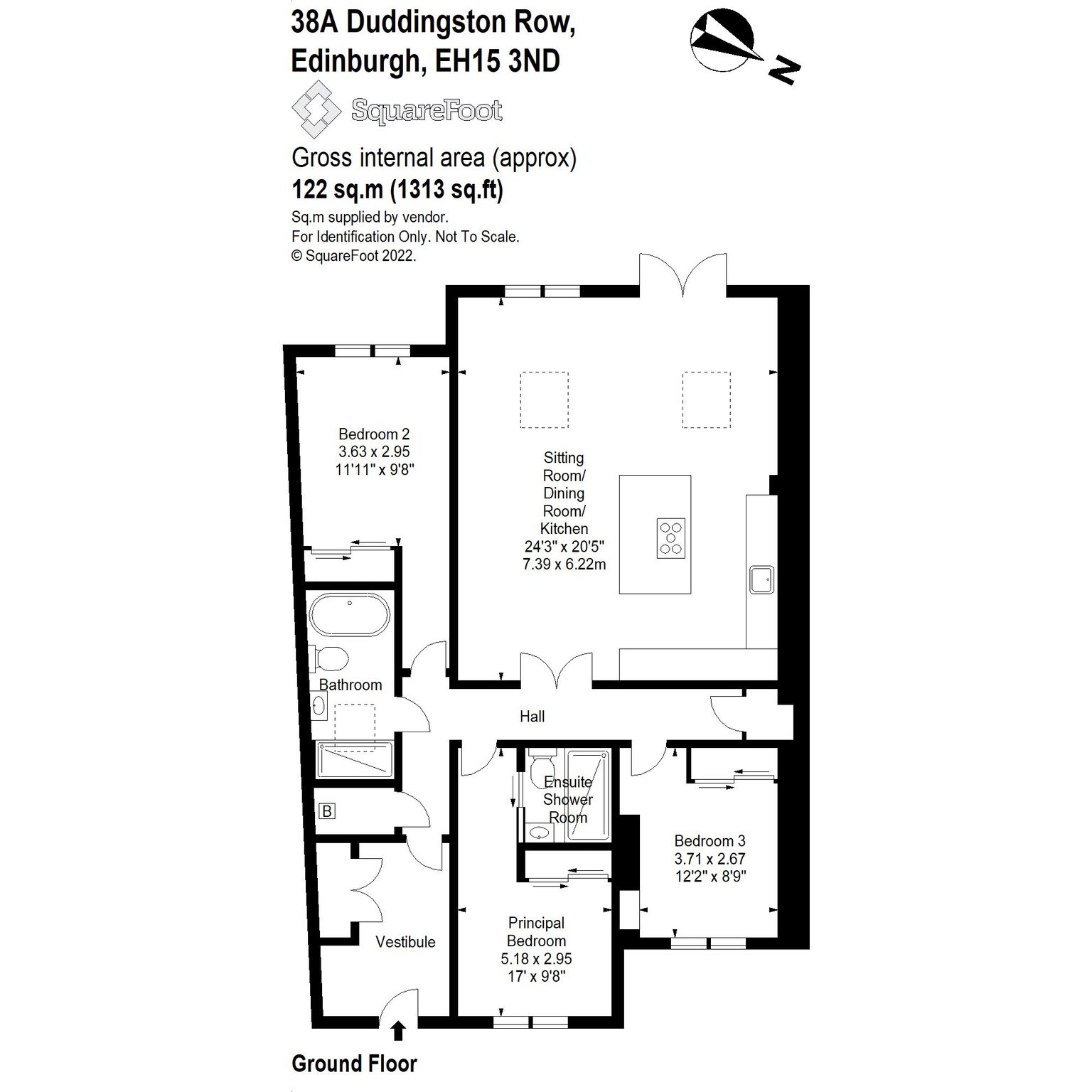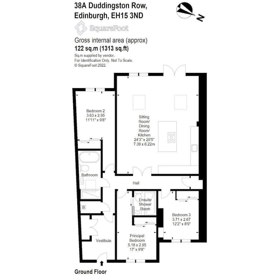 Entrance Vestibule, Hall, Open Plan Sitting Room & Dining Kitchen, Principal Bedroom with Ensuite Shower Room, Two Further Double Bedrooms, Bathroom, Two Hall Storage Cupboards, Boiler Cupboard