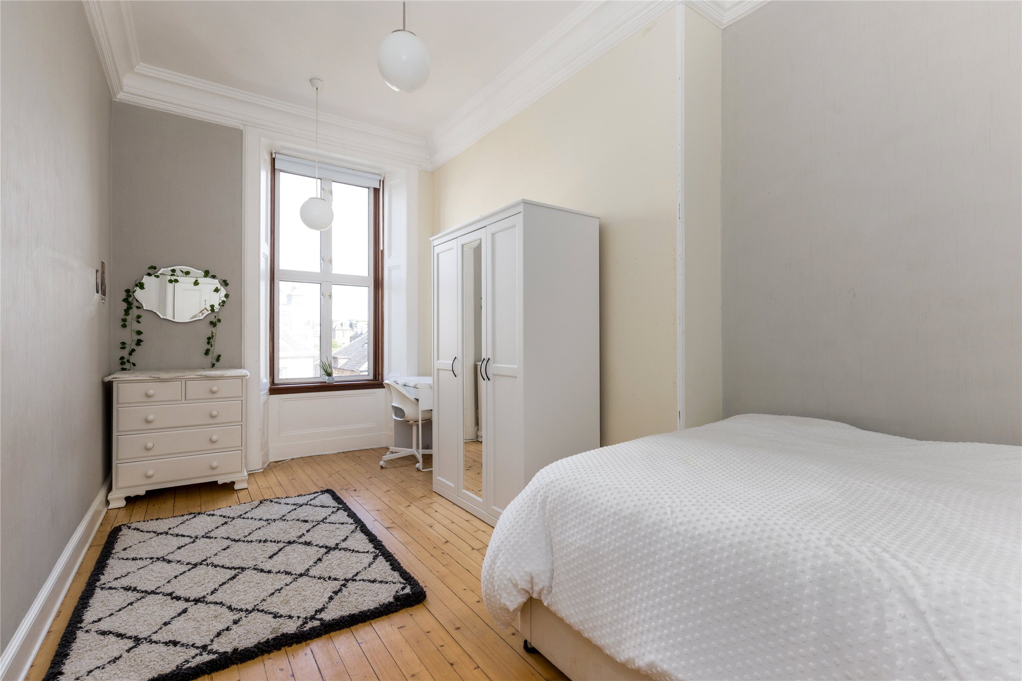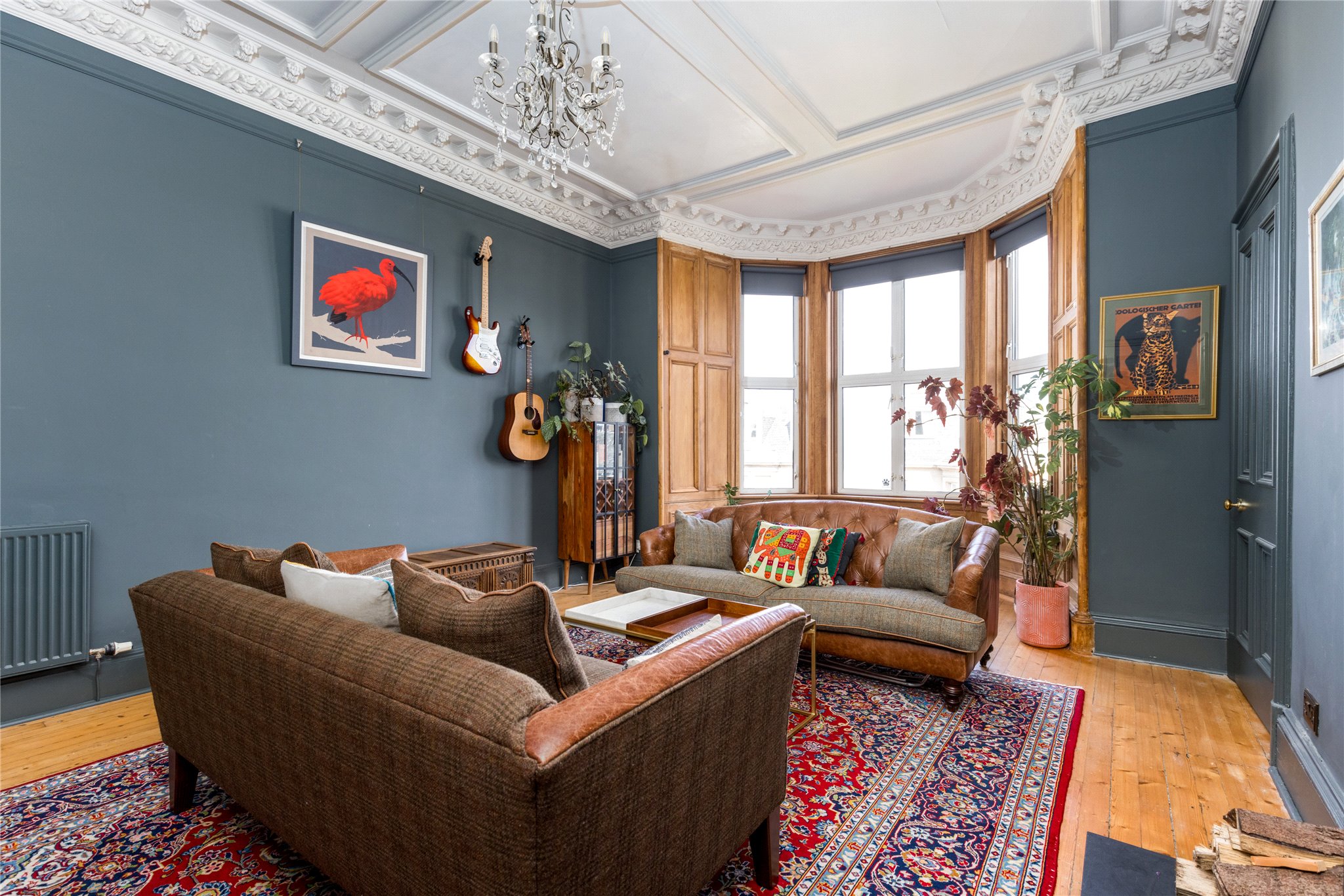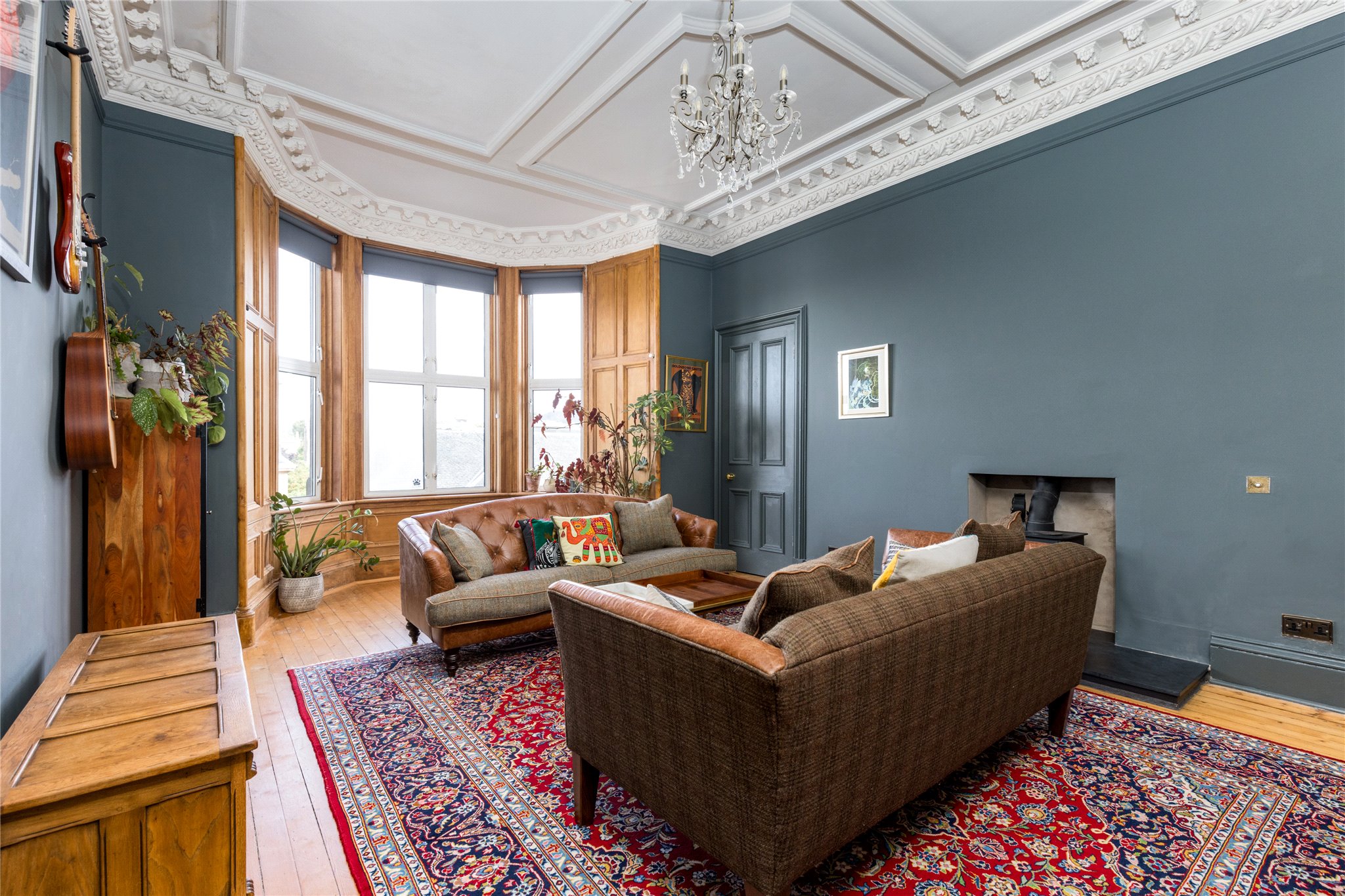 19/4 Mentone Terrace is a beautiful and elegantly proportioned five bedroomed property, with large private south facing garden, occupying the upper two floors of a handsome Victorian tenement, set peacefully in the Southside of Edinburgh. The property retains a wealth of period features including ornate cornicework/plasterwork, high ceilings, wooden flooring, feature fireplaces and impressive bay windows in the sitting room and in the drawing room, enjoying far reaching views to Salisbury Crags and Arthur Seat with Burley wood burning stove.