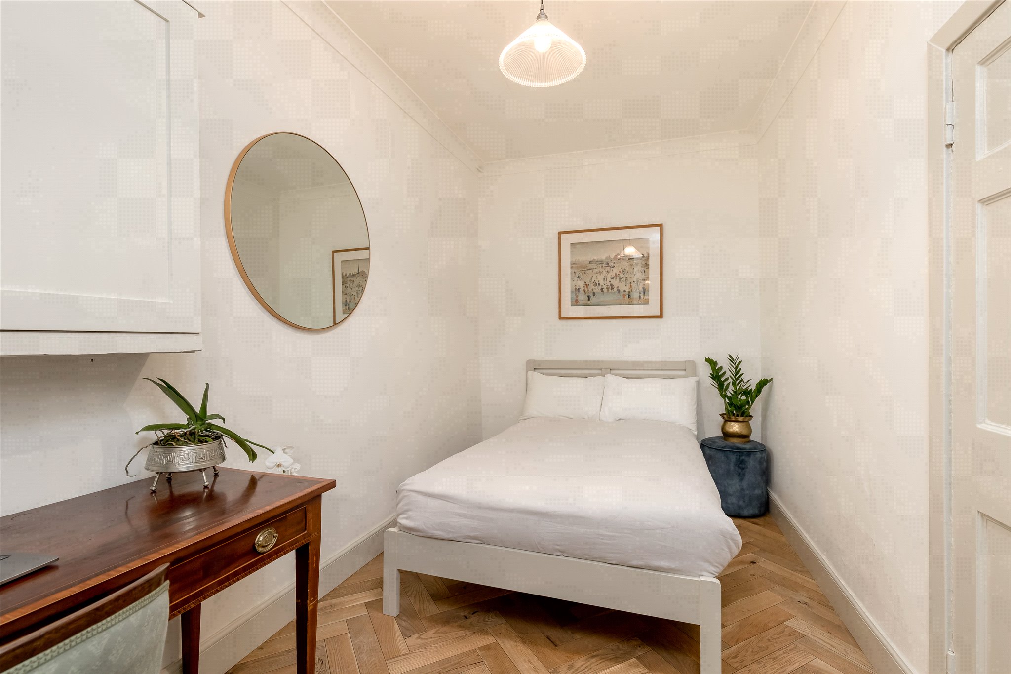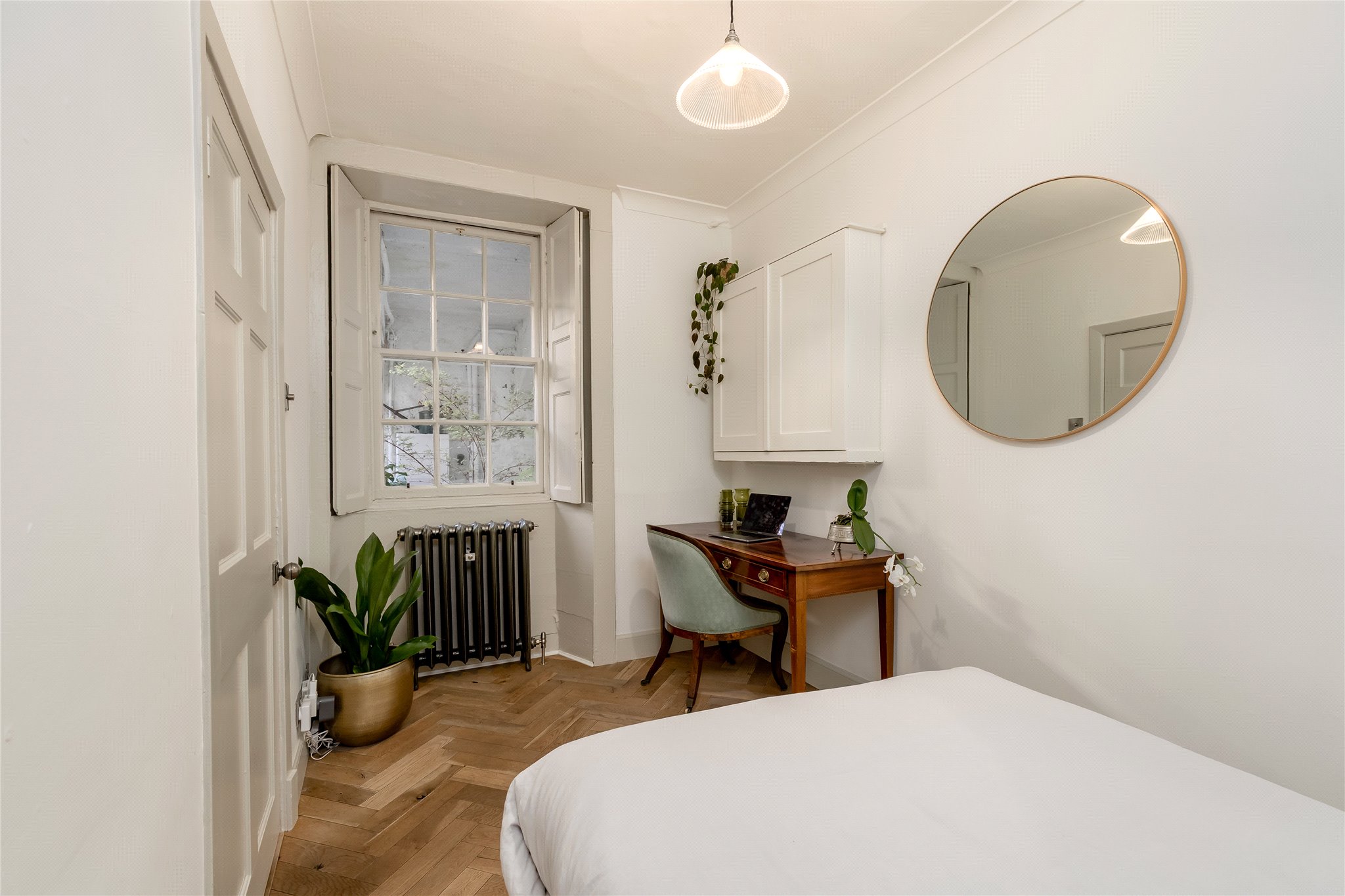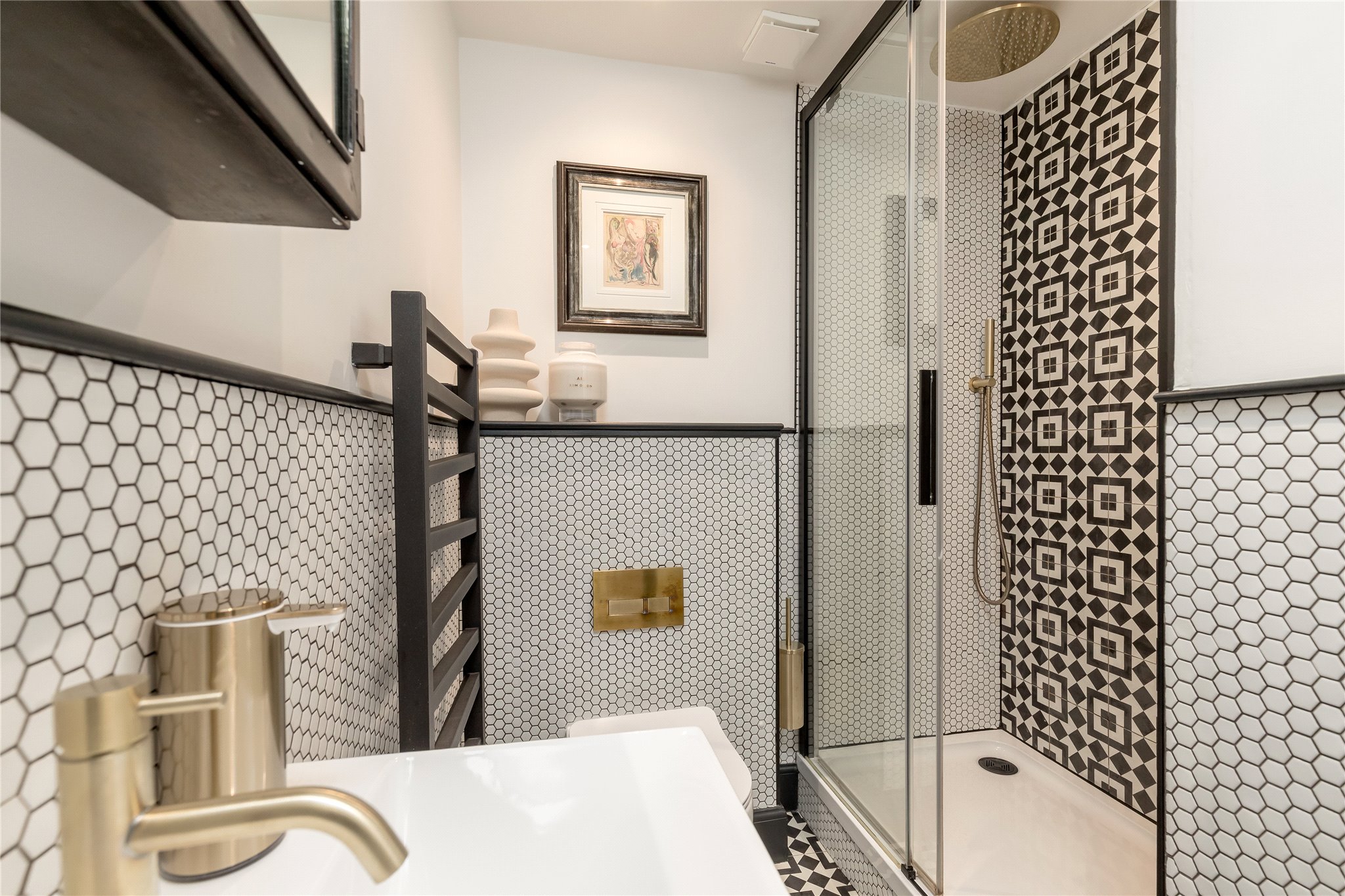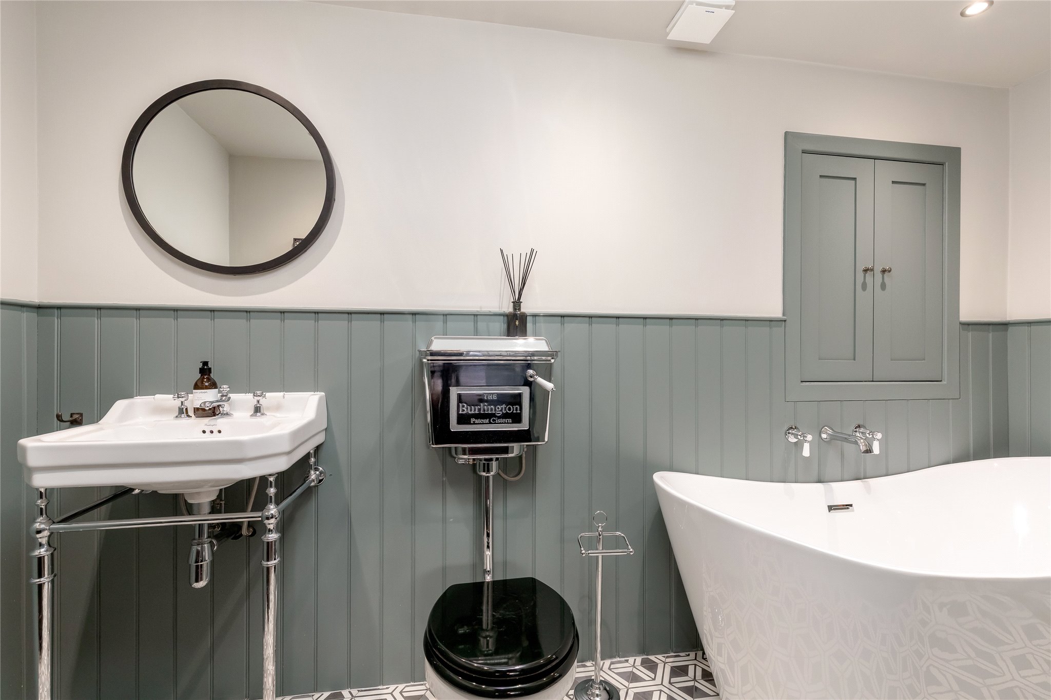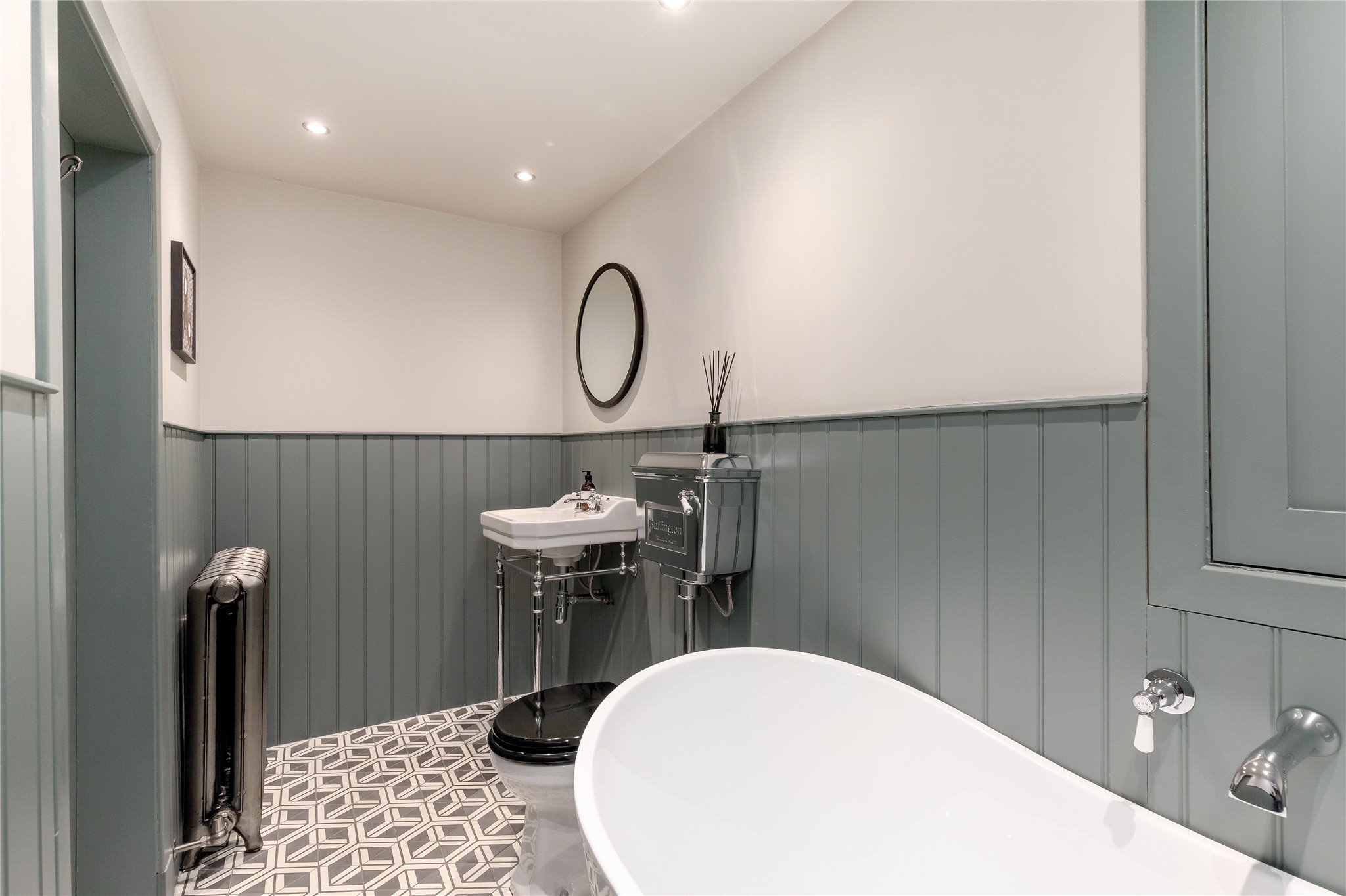 Both bedrooms retain their original working shutters, with the principal bedroom benefiting from a stylish en suite bathroom complete with panelled walls, a freestanding bath, and high-quality Burlington fittings. A separate shower room features contemporary designer fixtures and a luxurious finish.