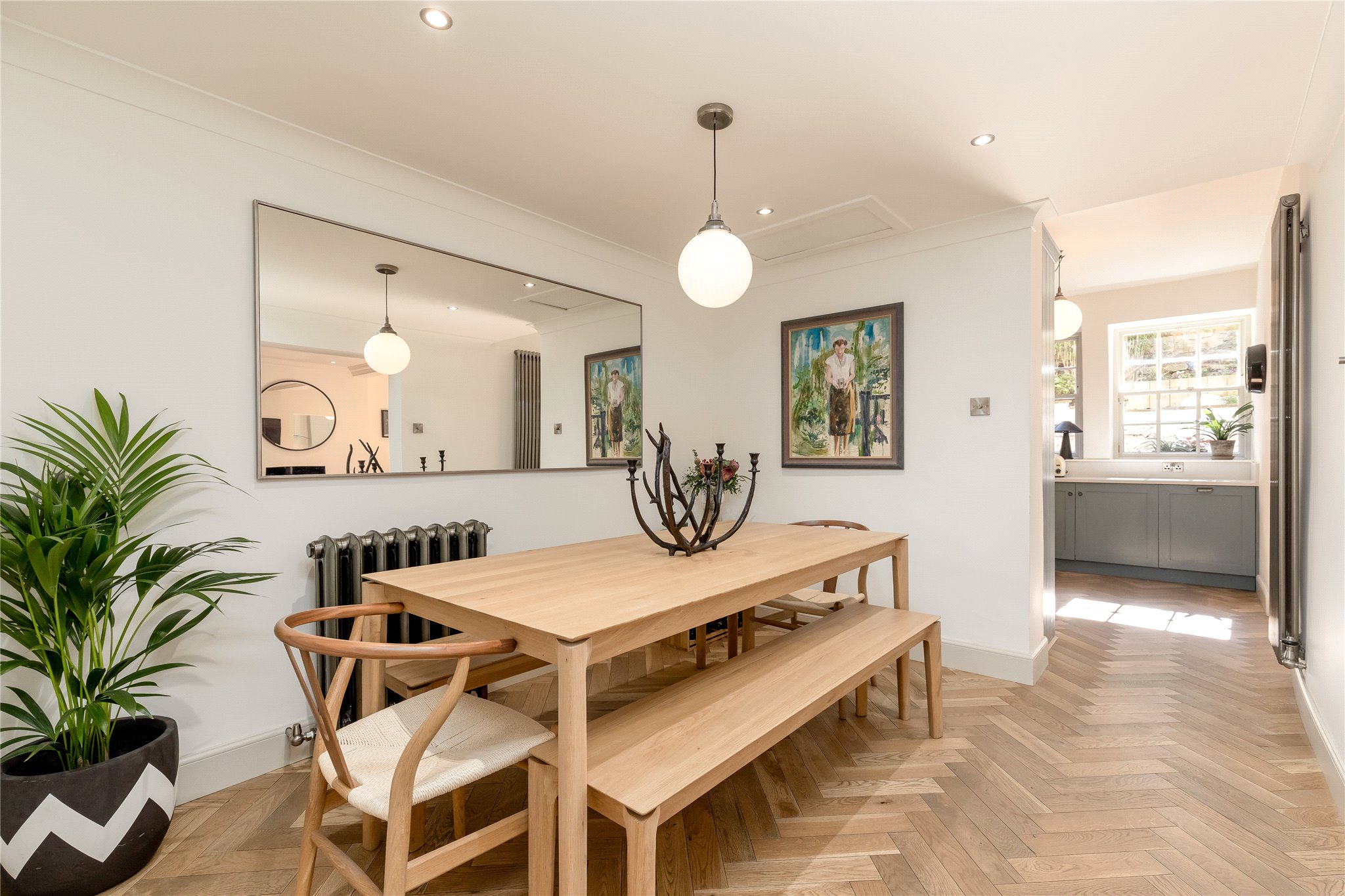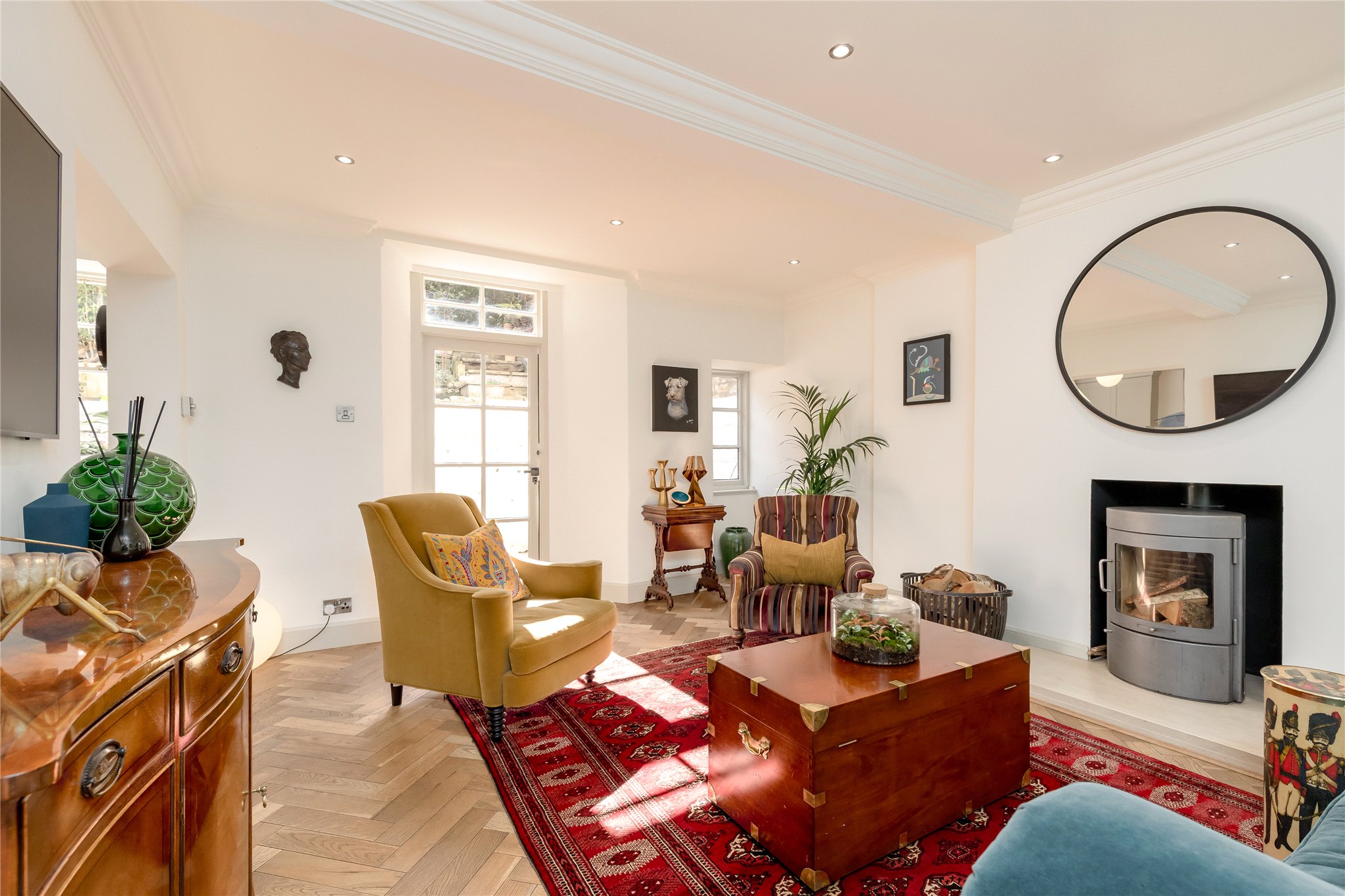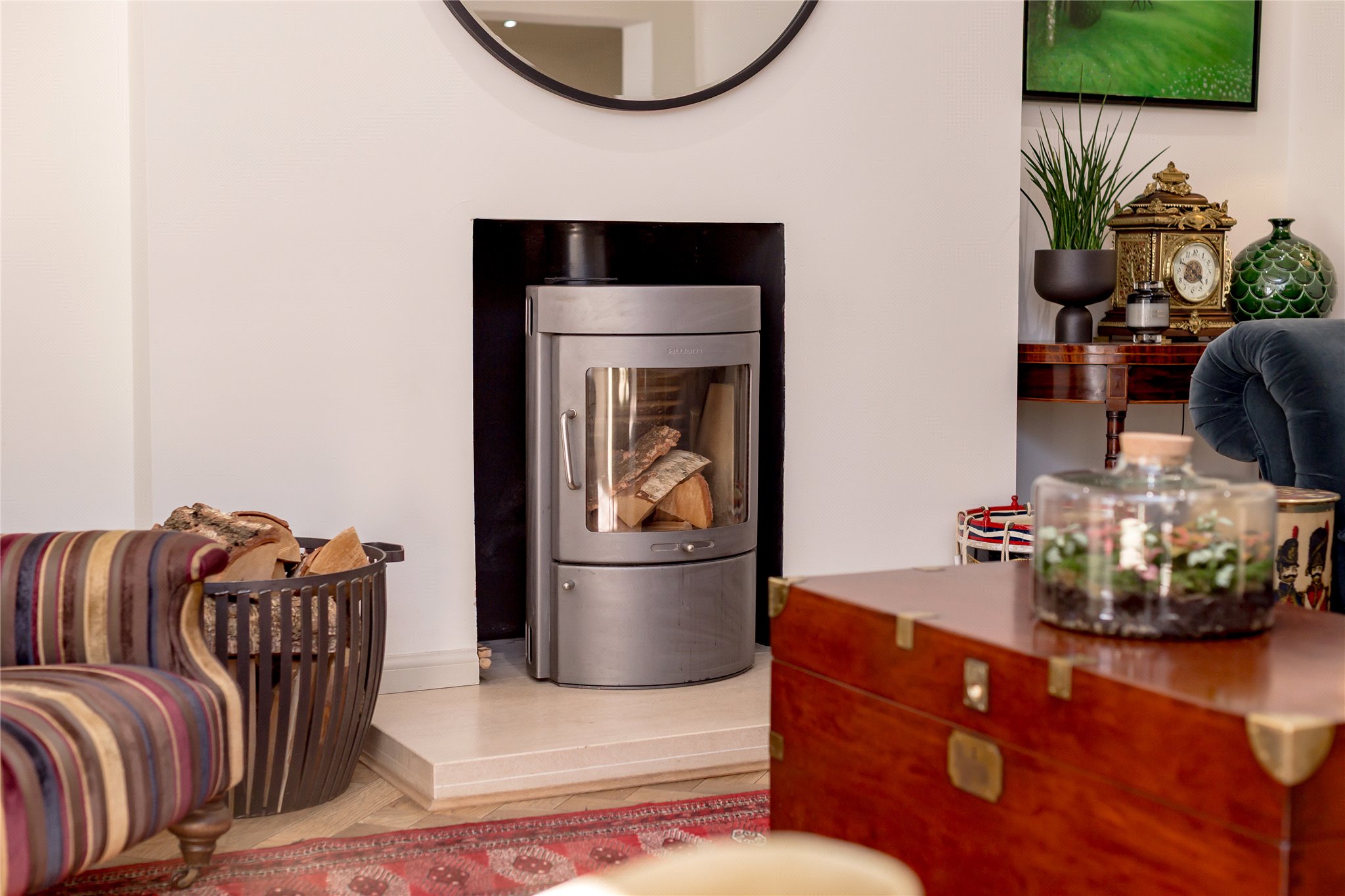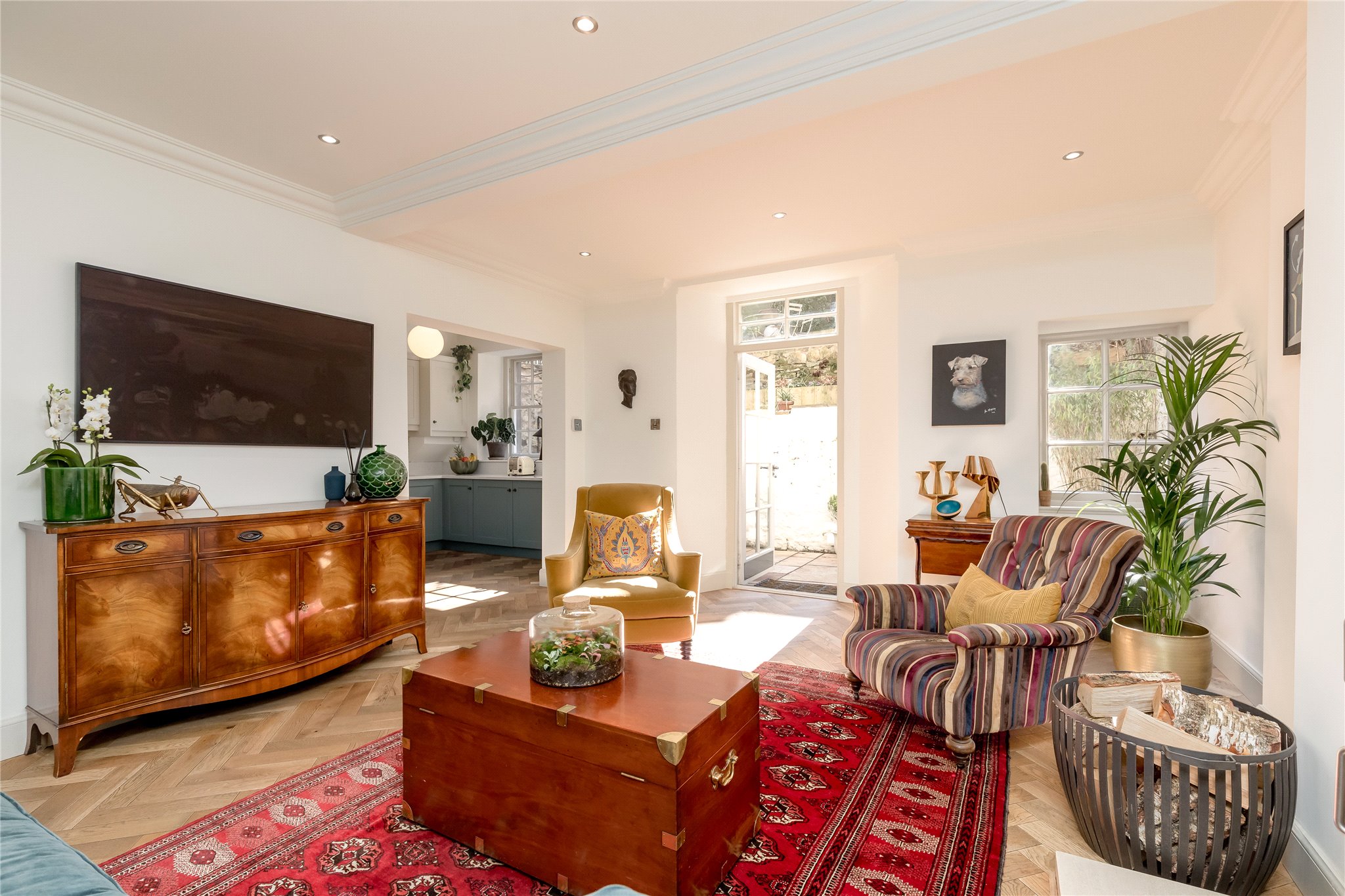 The bright, south-facing sitting room includes a contemporary log burner and opens directly onto a beautifully landscaped, tiered garden — a tranquil, private haven in the heart of the city. An elevated terrace provides the perfect space for al fresco dining or morning coffee, while mature planting creates a sense of calm and seclusion. The rear boundary subtly follows the central line of the hedge, maintaining a natural and verdant outlook. The front courtyard is equally generous, offering a private, west-facing sanctuary that catches the evening sun — a perfect spot to unwind, quietly enclosed from the street.