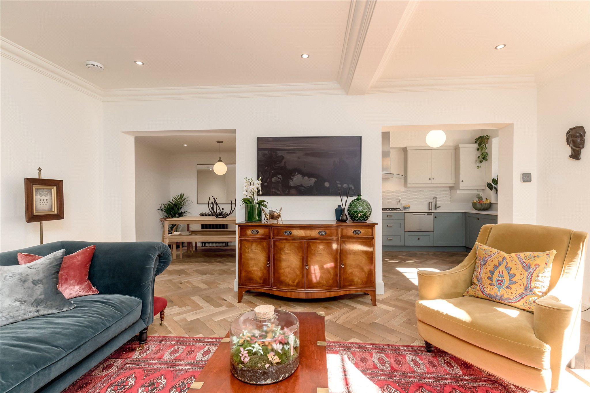 Fully renovated in 2021 to an exceptional standard, the flat now offers elegant, design-led interiors with a contemporary luxury feel throughout. Engineered oak herringbone flooring flows through the living spaces, paired with cast iron radiators and soft, modern décor. The reconfigured kitchen has been carefully designed for both beauty and function, featuring bespoke-standard cabinetry with solid wood doors, quartz worktops, generous storage, Siemens appliances, a Fisher & Paykel dishwasher drawer, and double undercounter fridge units.