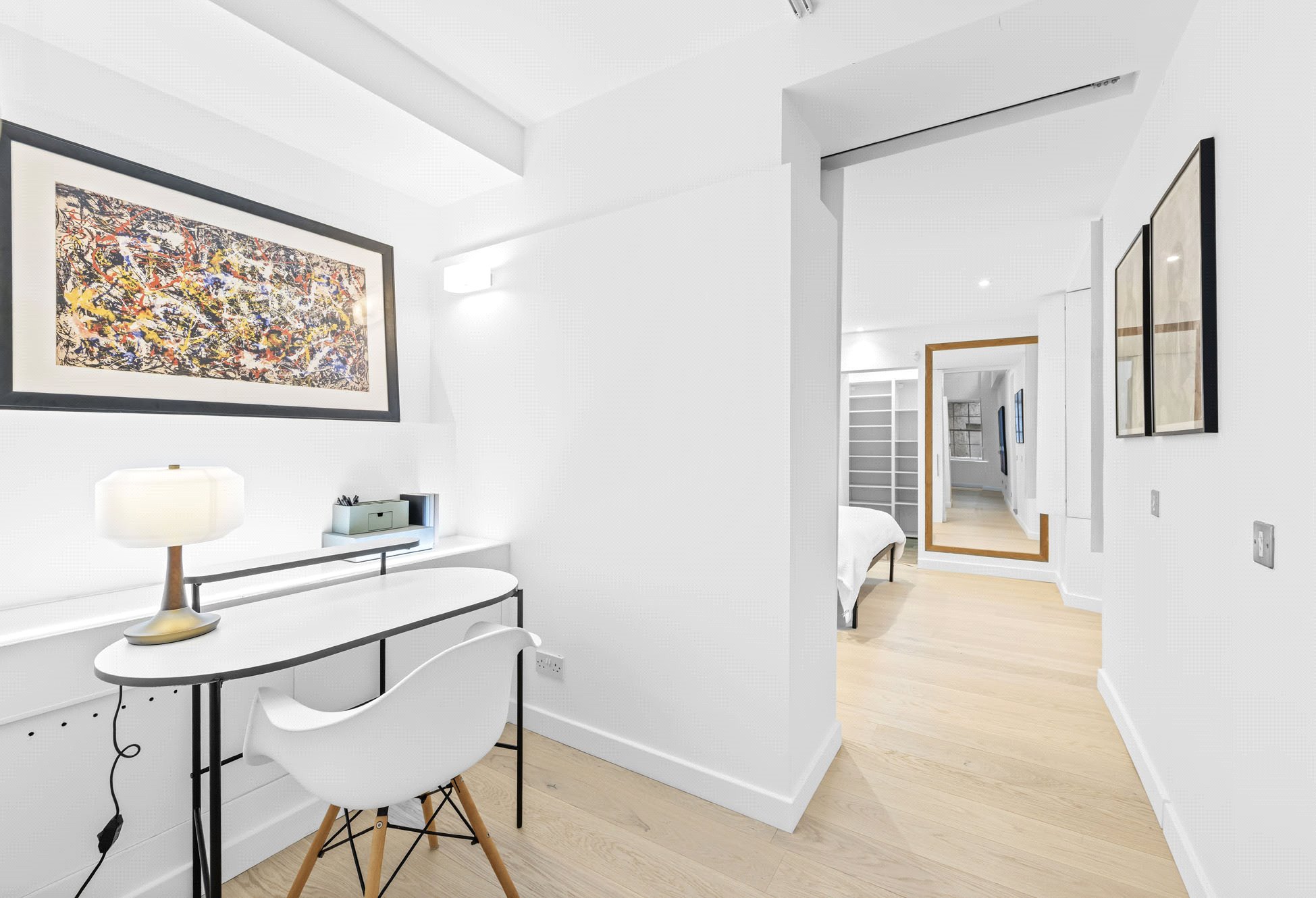 The property has been freshly decorated throughout and features engineered wooden floors, modern lighting, and architectural detailing that enhance its contemporary aesthetic.