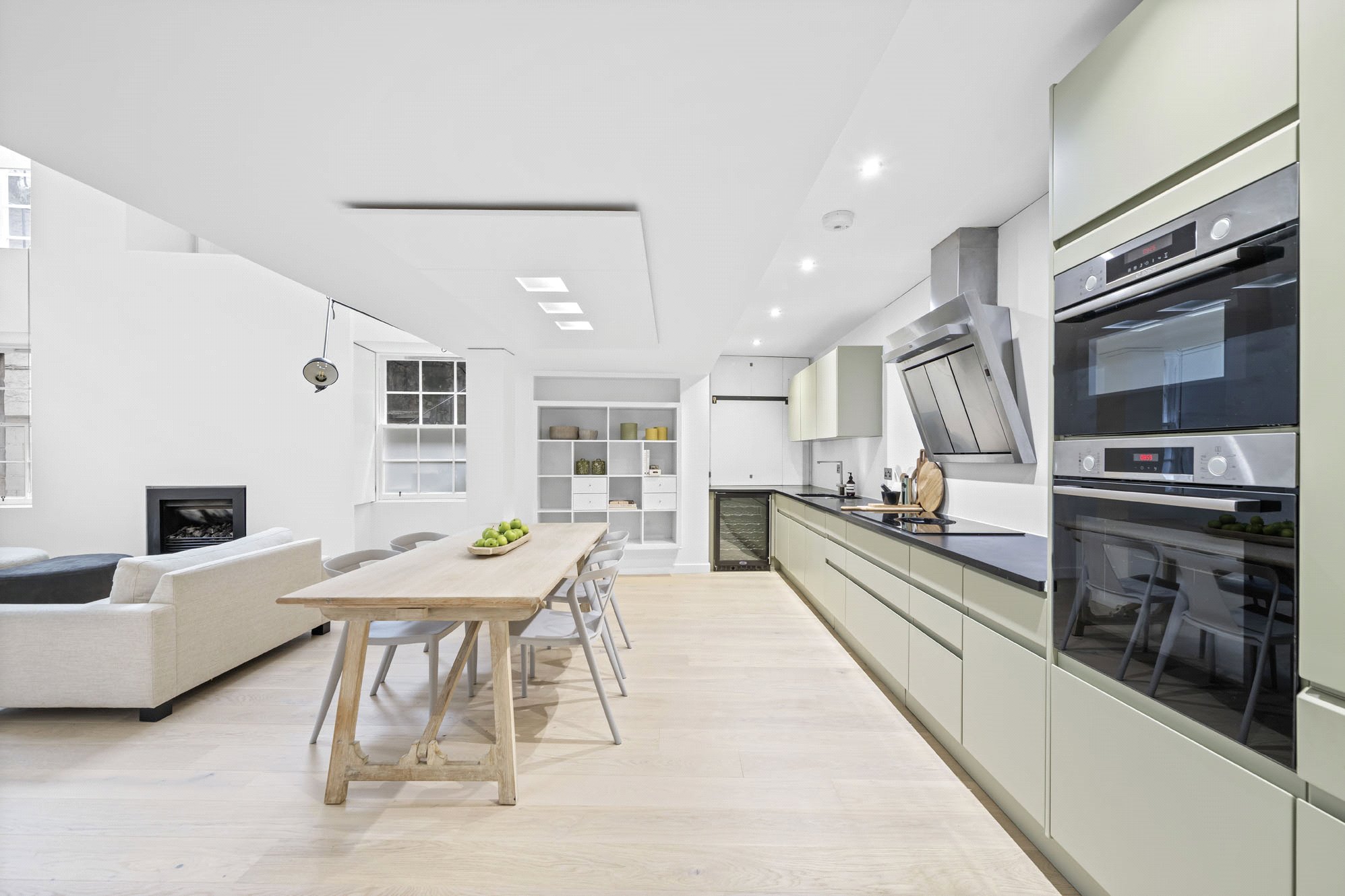 Descending to the lower floor reveals the home’s most impressive feature - a spectacular open-plan kitchen, living and dining space. The area is anchored by a contemporary gas fire and illuminated by high-level windows that flood the space with natural light. The fully integrated kitchen is sleek and modern, featuring high-quality appliances, excellent storage, and contemporary design touches that complement the home’s architectural style.