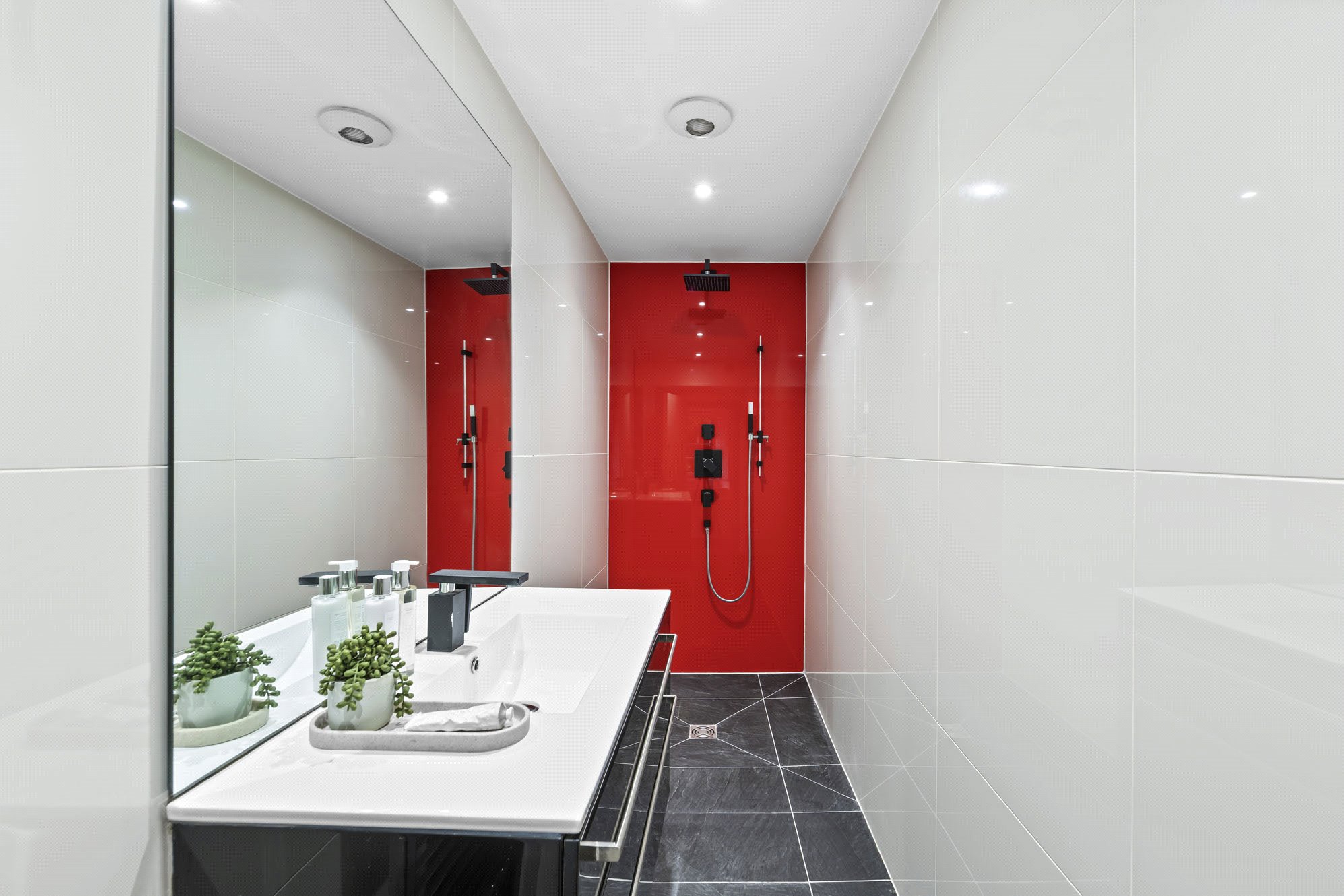 Arranged over the lower ground and basement levels, it combines dramatic spatial design with natural light, clean lines, and an abundance of contemporary detail.