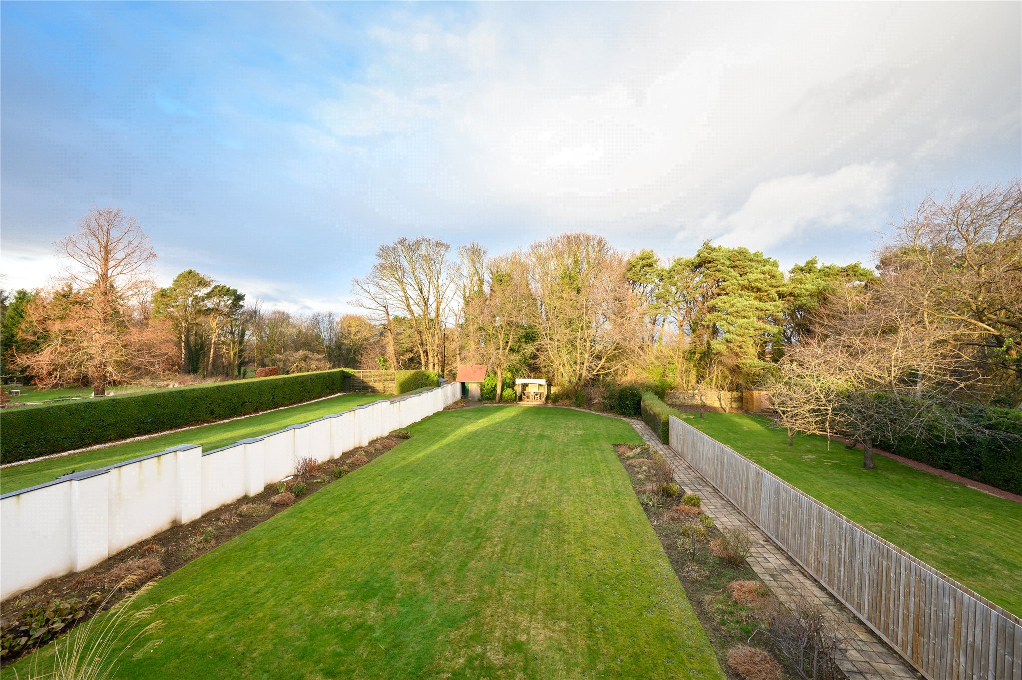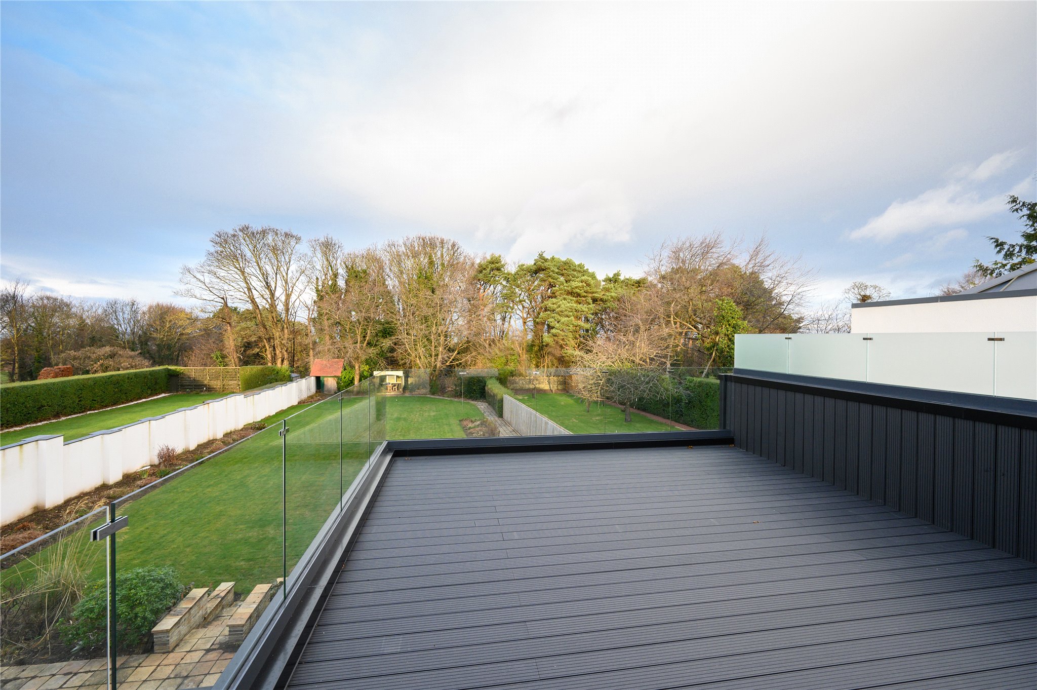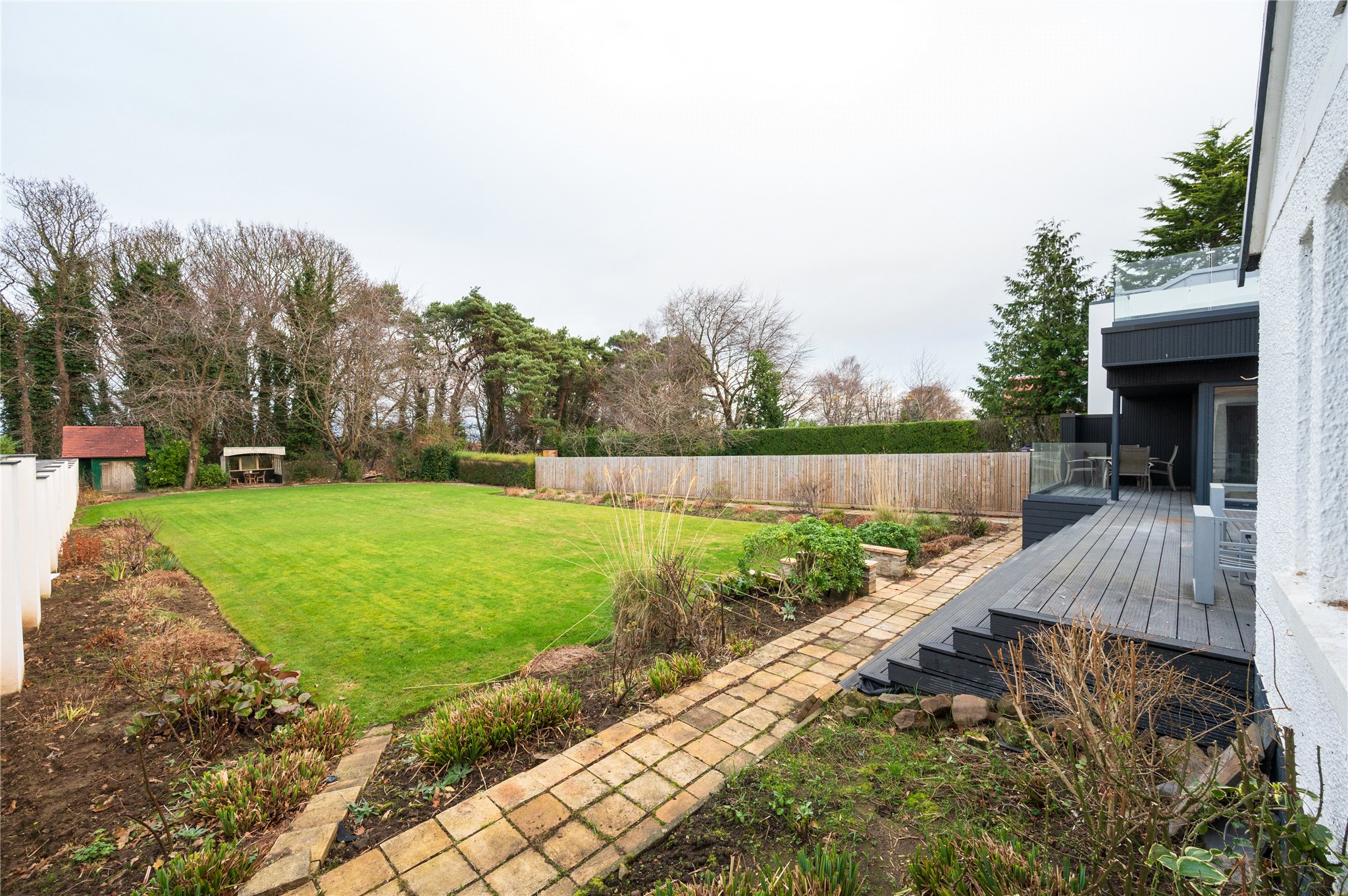 Garden: A spacious rear garden extending to 0.25 Acres, with expansive raised deck, dropping down to a lawned area with a colourful herbaceous border.