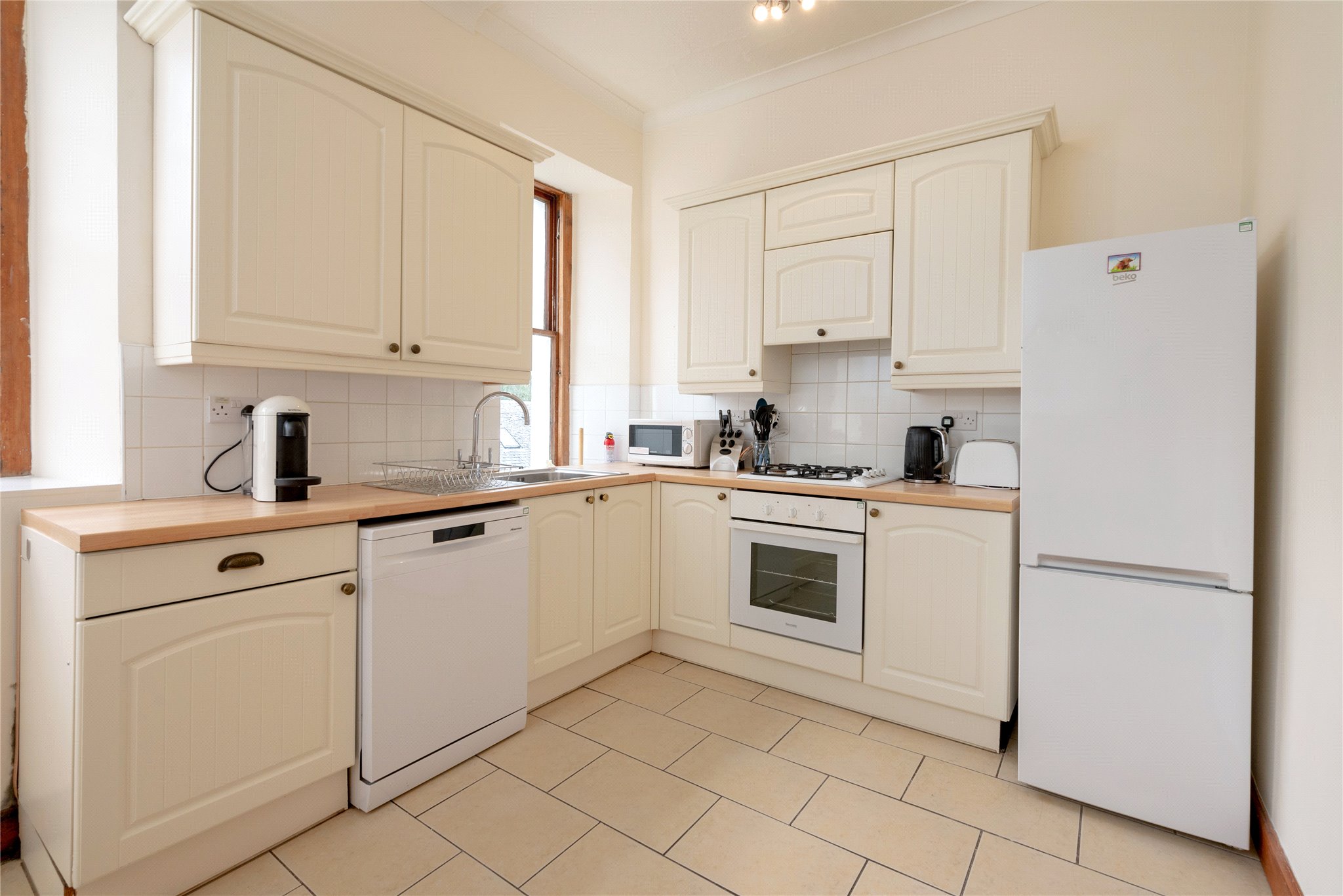 The heart of the home is the beautifully proportioned kitchen and dining room, ideal for everyday living and entertaining, while the spacious living room to the front of the property enjoys three large sash-and-case windows that flood the space with natural light and offer a lovely open outlook over the quiet, cobbled street below. There are four double bedrooms in total, including a bright principal bedroom with its own en-suite shower room. A stylish main bathroom and separate WC serve the remaining bedrooms, making the layout particularly well-suited for families or visiting guests.