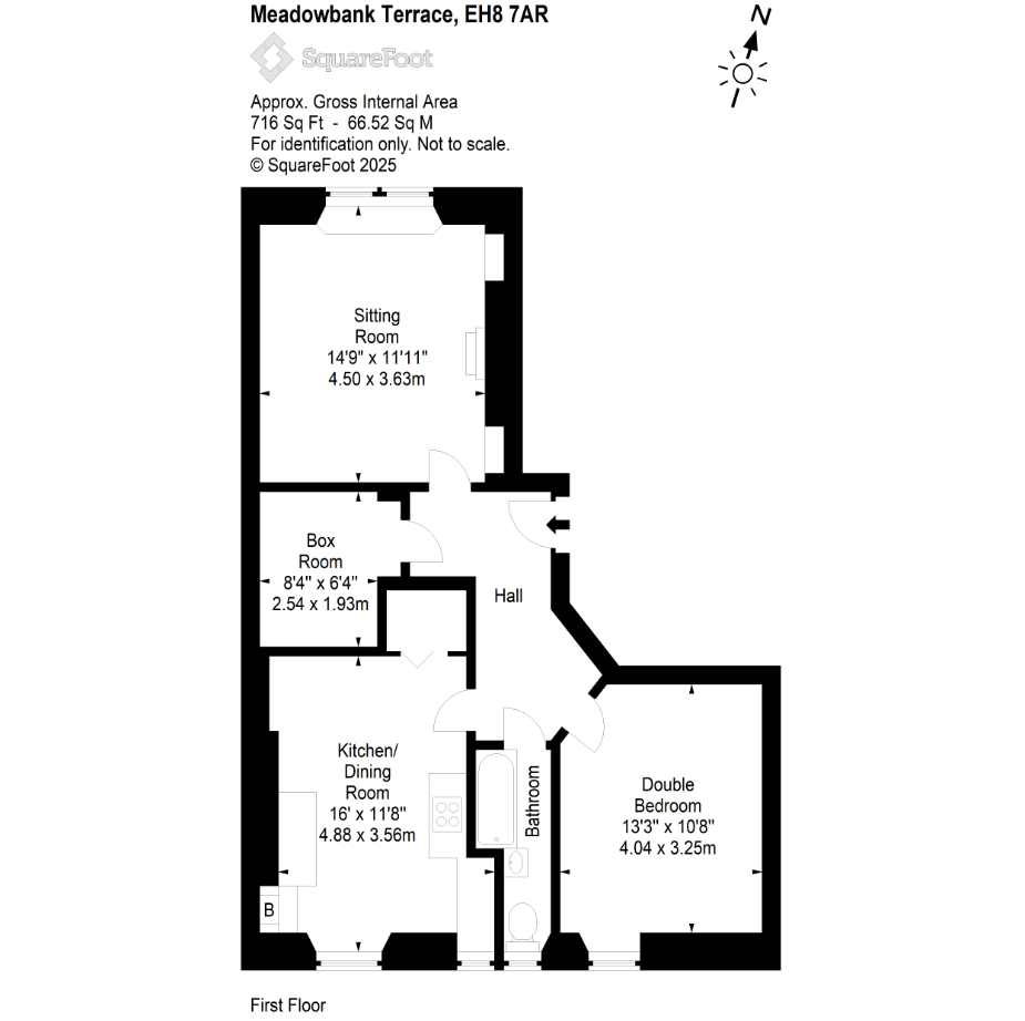 With a generous internal floor area of approximately 716 sq ft, the property boasts a bright and airy layout comprising a large sitting room with bay window, a stylish and functional kitchen/dining room, a well-sized double bedroom, a versatile box room ideal for a home office or occasional guest space, and a modern bathroom.
