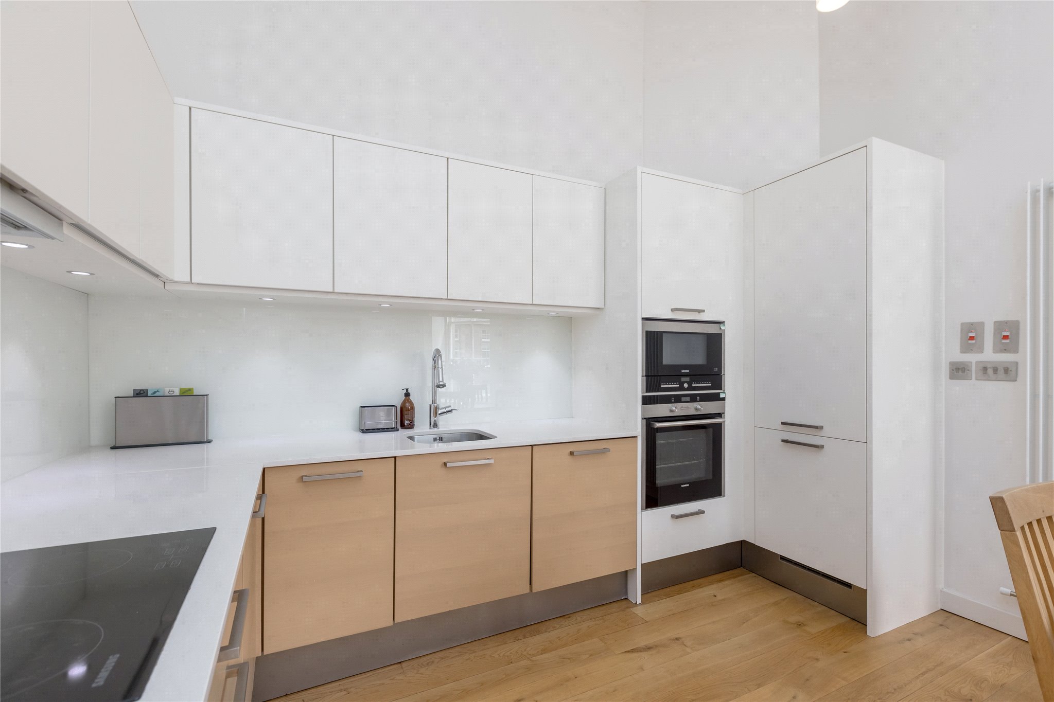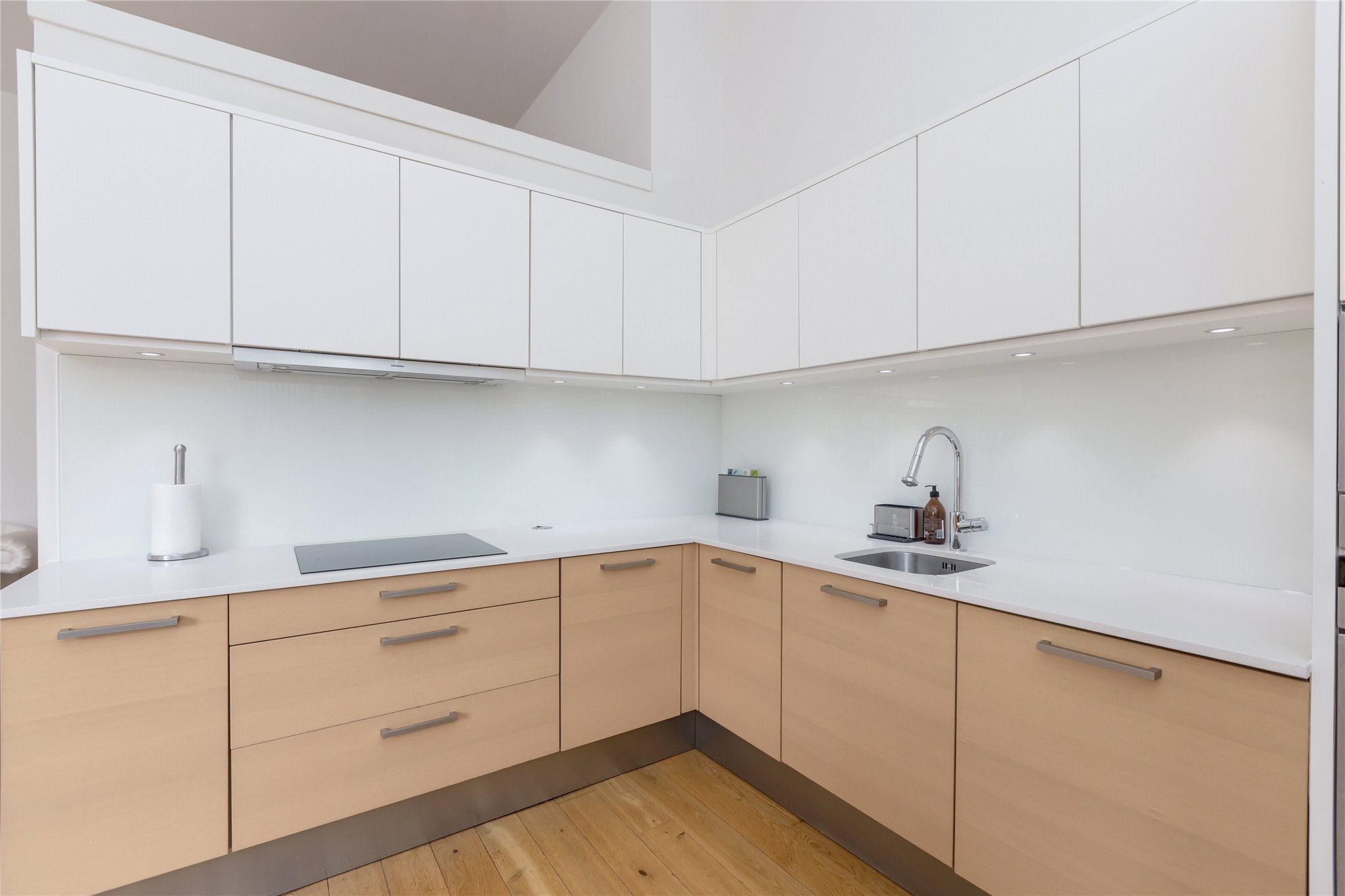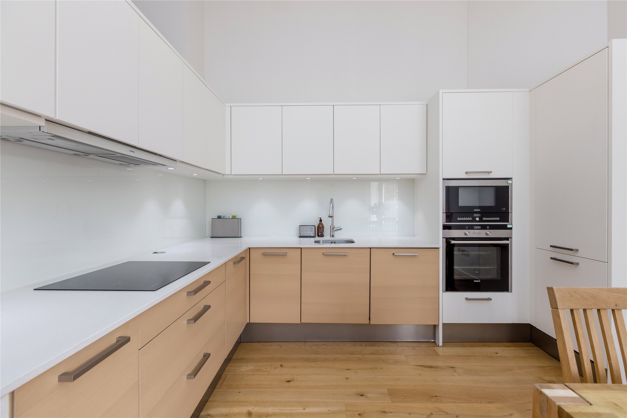 The flat boasts a generously proportioned open-plan sitting room, dining area, and kitchen – an impressive space extending to over 23 feet in length. This sociable living area is framed by large windows, allowing excellent natural light to flood the space and offering open views over the development. The sleek modern kitchen is fully integrated, with high-spec appliances and ample storage, perfect for both everyday living and entertaining.