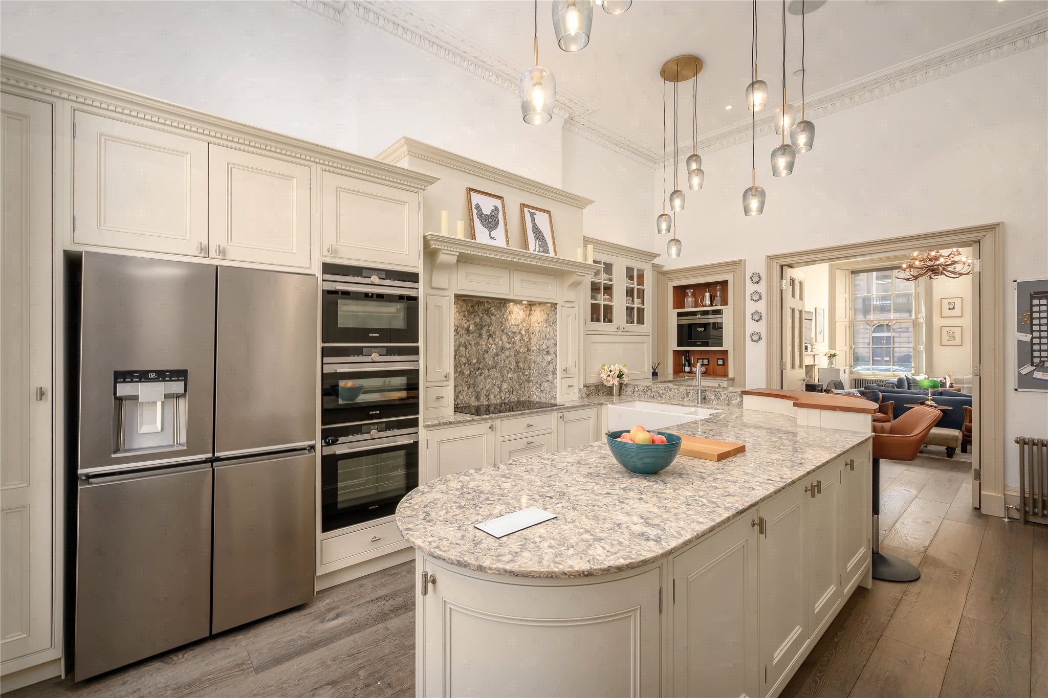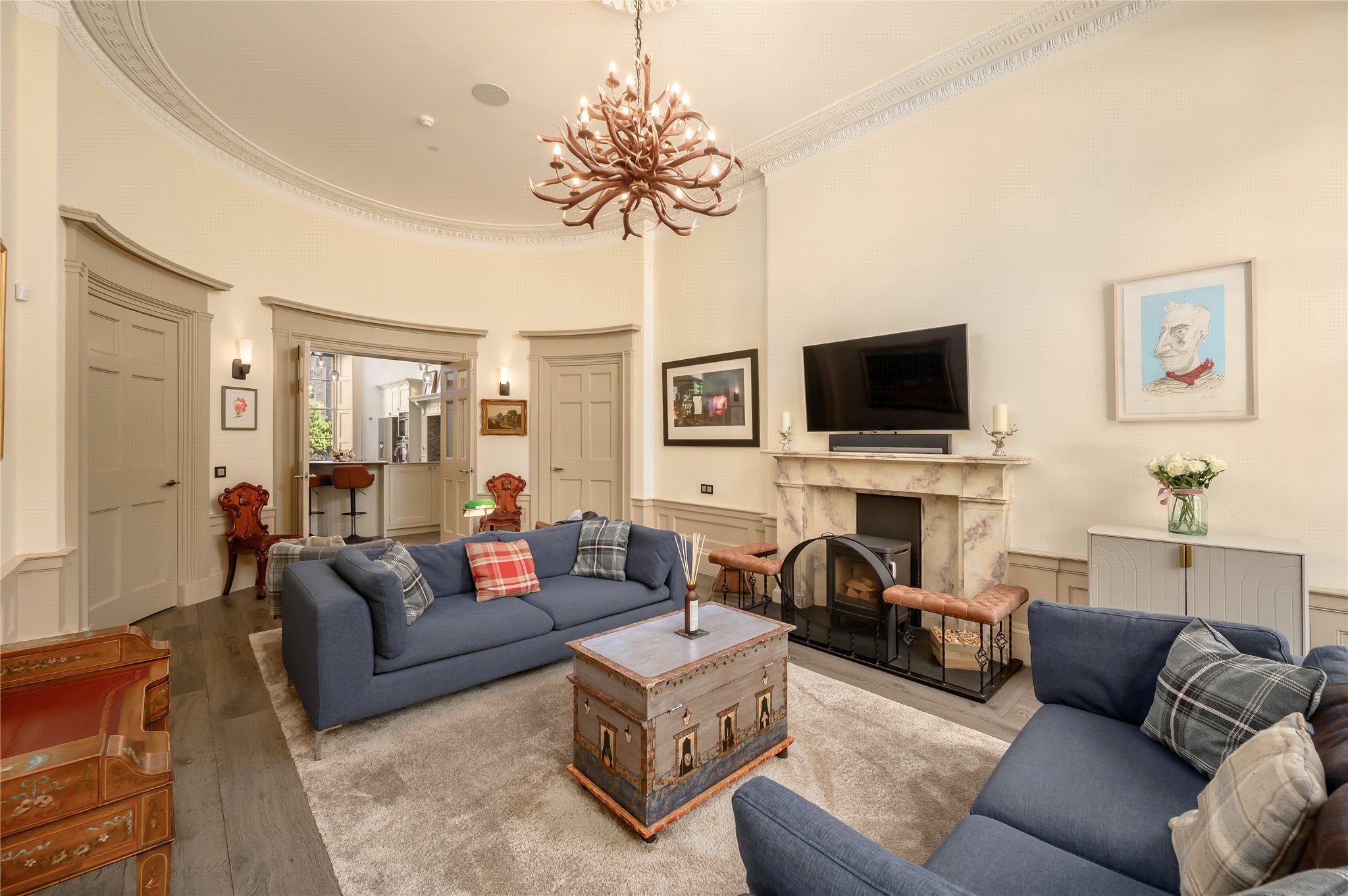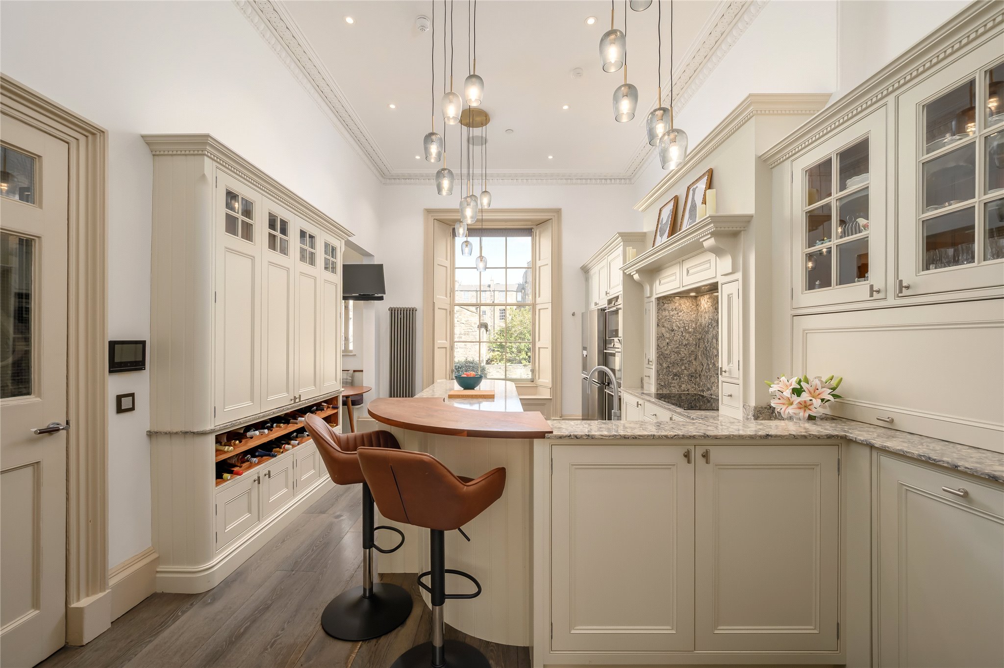 Every detail of this impressive property has been curated to the highest specification, offering a turnkey lifestyle. Imposing bow-ended rooms, original flagstone floors, ornate cornicing, working shutters, and period fireplaces preserve the grace of the Georgian era, while modern additions add ease - including new double-glazed windows, Sonos audio in key rooms, a smart system for lighting and heating, a sophisticated video entry system, six-camera external security system with intruder alarm, and a sprinkler system - deliver contemporary convenience and peace of mind. From the bespoke Sculleries of Stockbridge kitchen to the fully landscaped east-facing garden with pergola, this seven-bedroom family home delivers quality and elegance. A particular highlight is the versatile sub-divisible one-bedroom flat on the lower ground floor with open-plan kitchen/living/dining room.