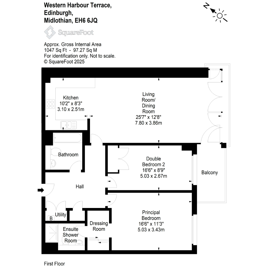 Accommodation: entrance hall, open-plan kitchen / living / dining room, balcony, principal bedroom, dressing room, ensuite shower room, second double bedroom, family bathroom, Utility cupboard.