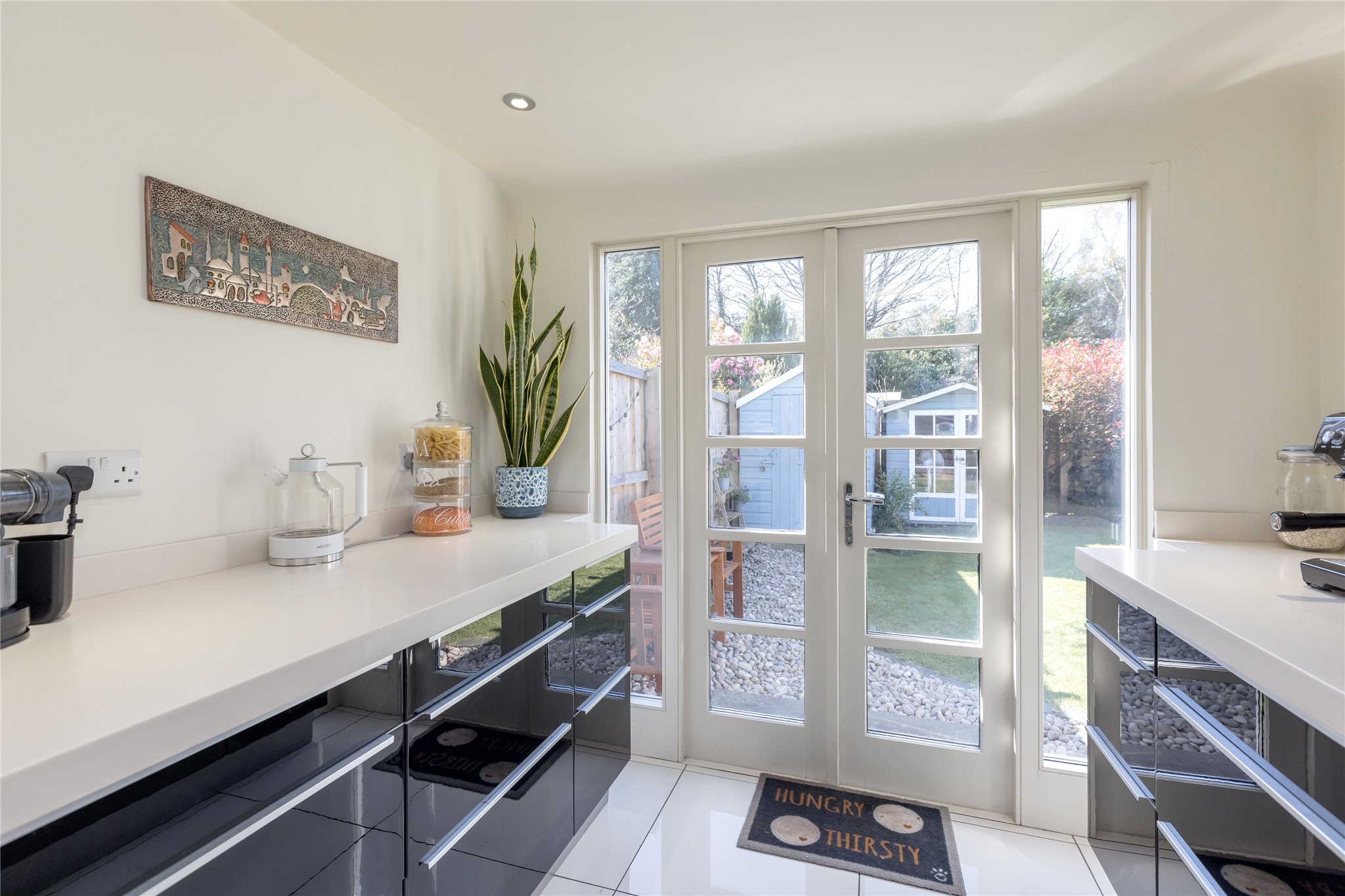The main double bedroom is quietly positioned to the rear, overlooking the garden, while a second double bedroom sits on the upper floor, offering additional privacy. The dining room connects to a long, fully equipped kitchen with direct access to the garden—perfect for indoor-outdoor living.