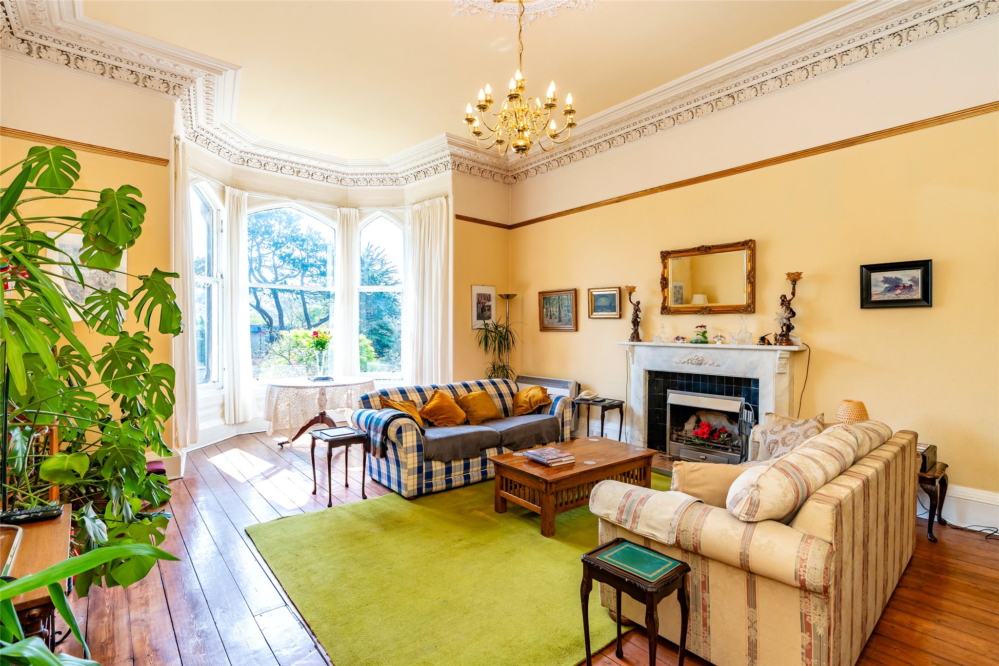 The grand, south-facing living room forms the heart of the home, framed by expansive sash windows and finished with ornate ceiling roses and decorative plasterwork that celebrate its original splendour. A generously sized dining hallway offers a welcoming space for family gatherings, while the versatile layout includes a family bathroom and three sizeable double bedrooms, each with its own character and outlook. The accommodation would now benefit from a degree of modernisation, and offers the epitome of modern Edinburgh living, ideal for both family life and entertaining, all set within a peaceful enclave just moments from the vibrancy of Morningside and the Meadows.