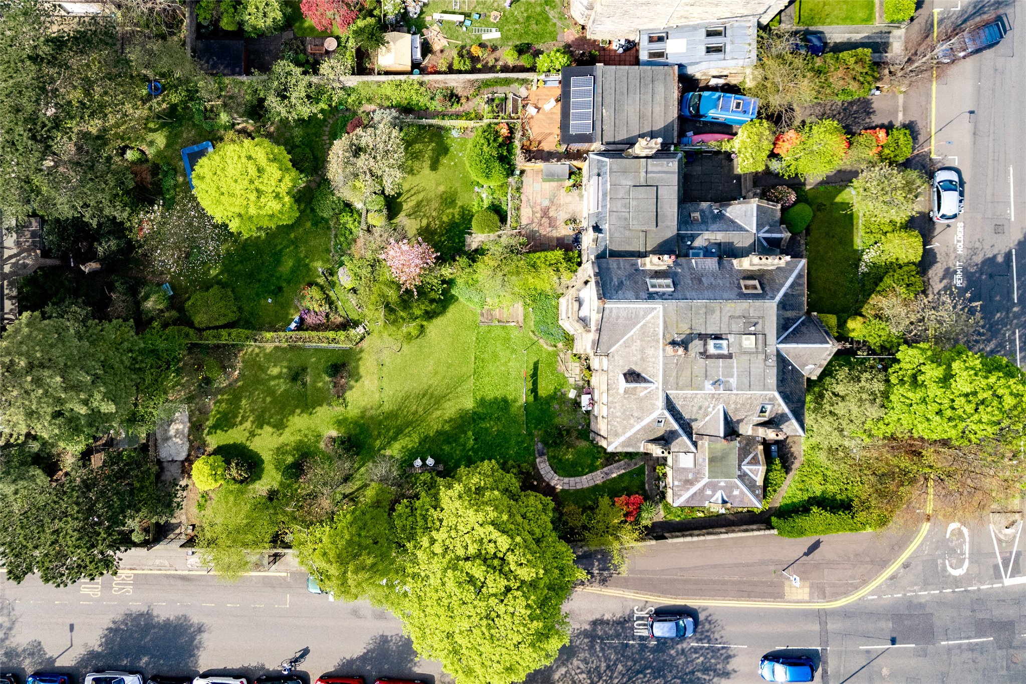 The property also enjoys an expansive south-facing private garden to the rear, with a laid lawn and lined with mature plantings and trees. The garden is accessed via a pathway to the left of the main house, which is split into four properties, each of which have a portion of the garden grounds. There are also two private parking spaces included, accessed via a gateway entrance on Kilgraston Road.